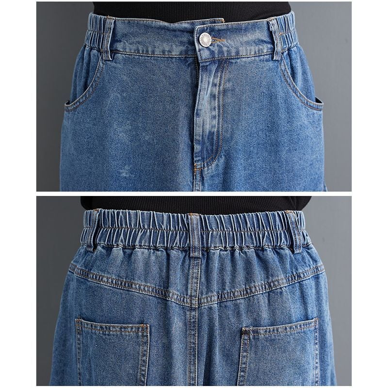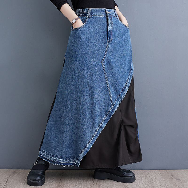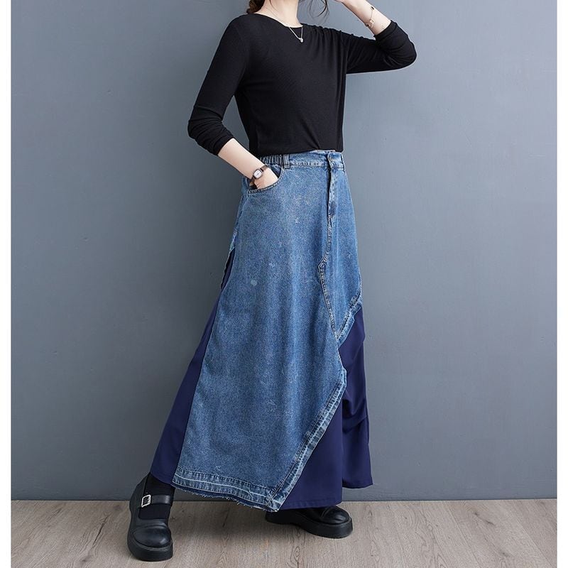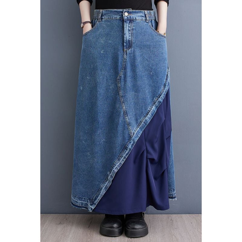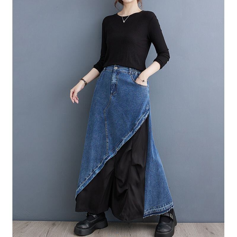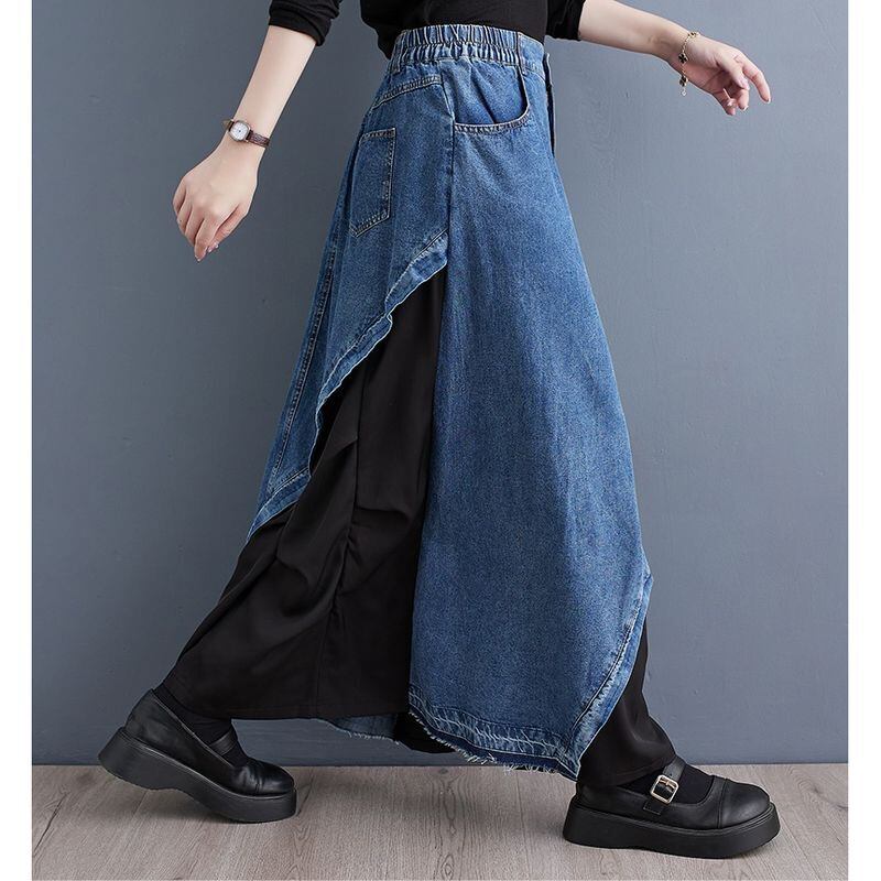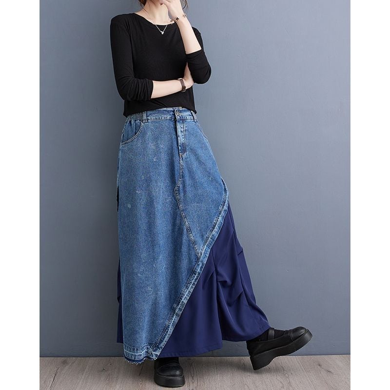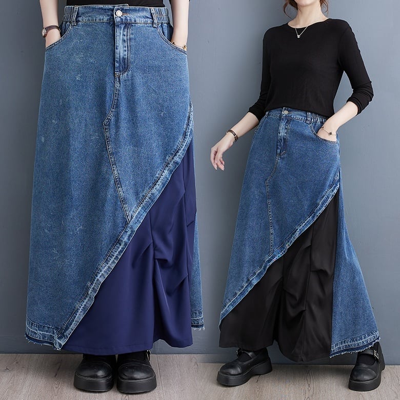デニム素材と滑らかな生地の異素材MIXが魅力的なラップスカート。