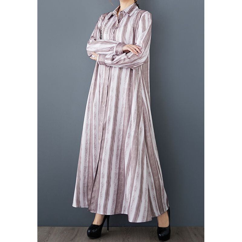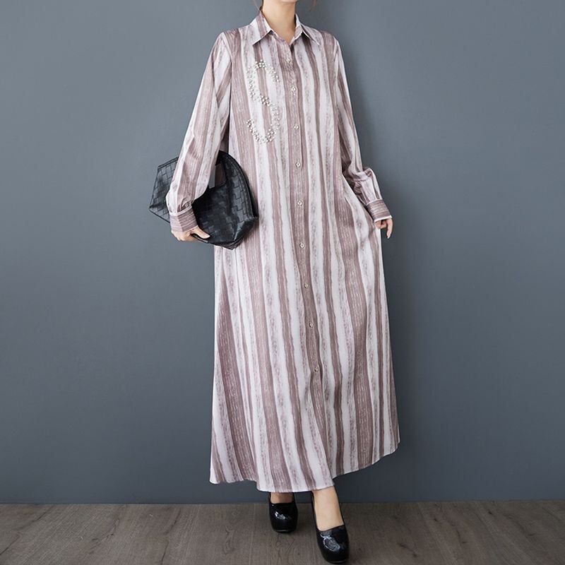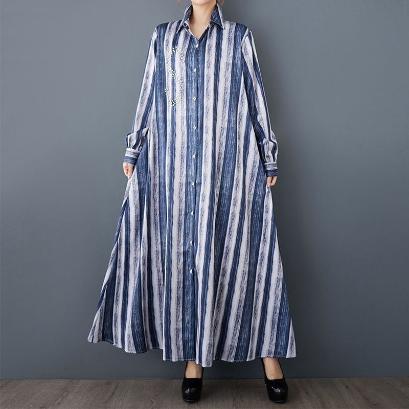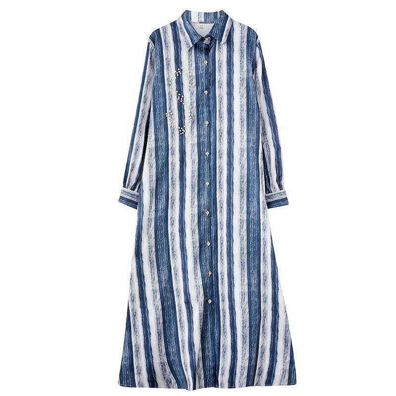 爽やかなストライプ柄と繊細なビジュー装飾が魅力的なロング丈シャツワンピース。