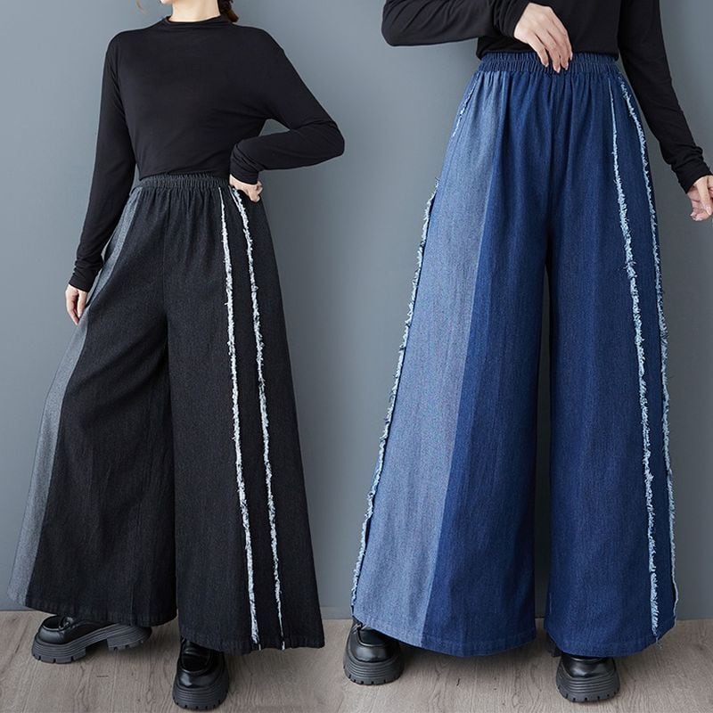 パッチワークとフリンジが魅力的なワイドレッグデニムパンツ。