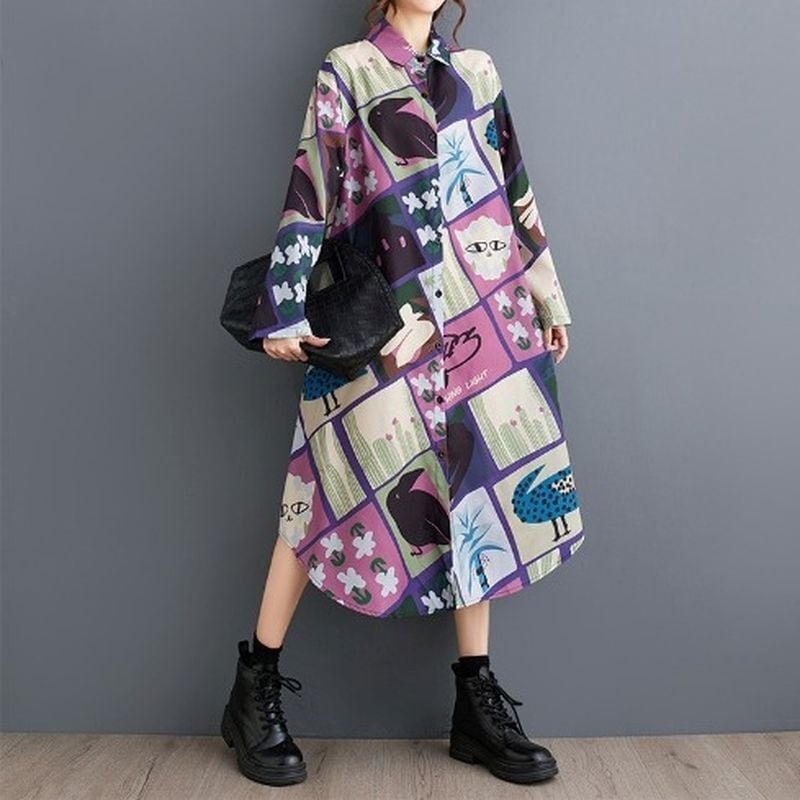 アーティスティックなパッチワークプリントが印象的なシャツワンピース。