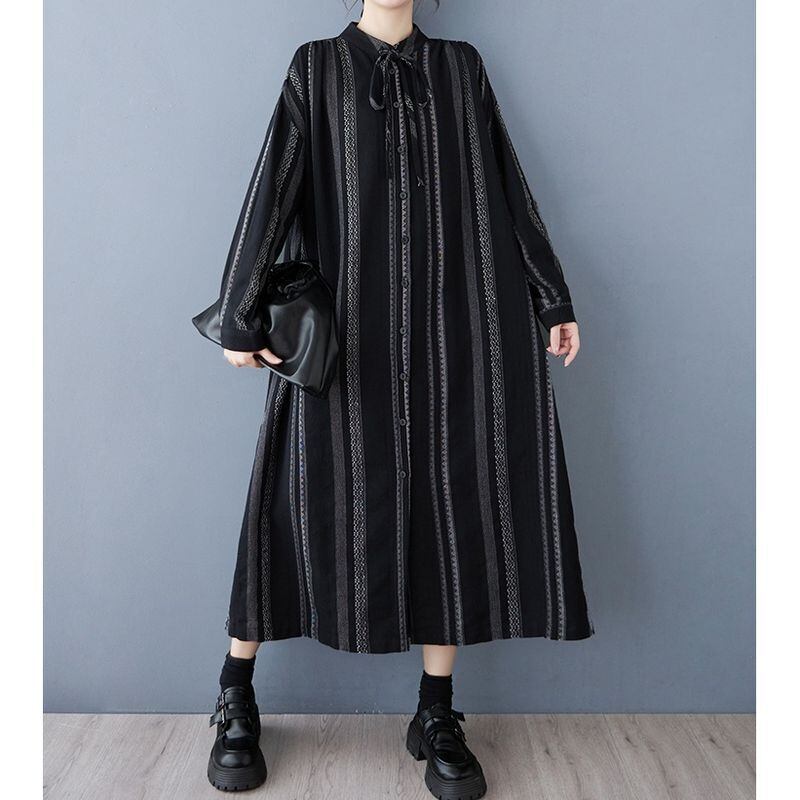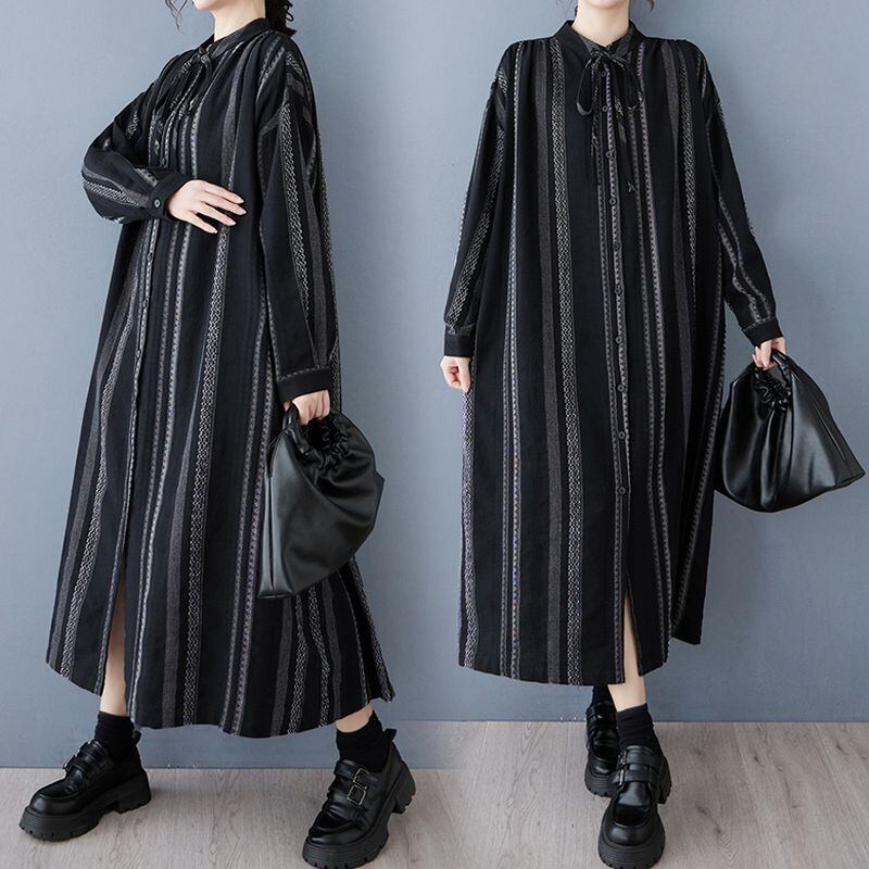 シックなストライプ柄が目を惹くロングシャツワンピース。