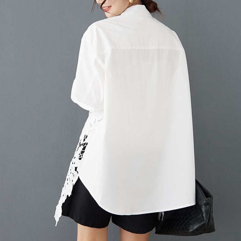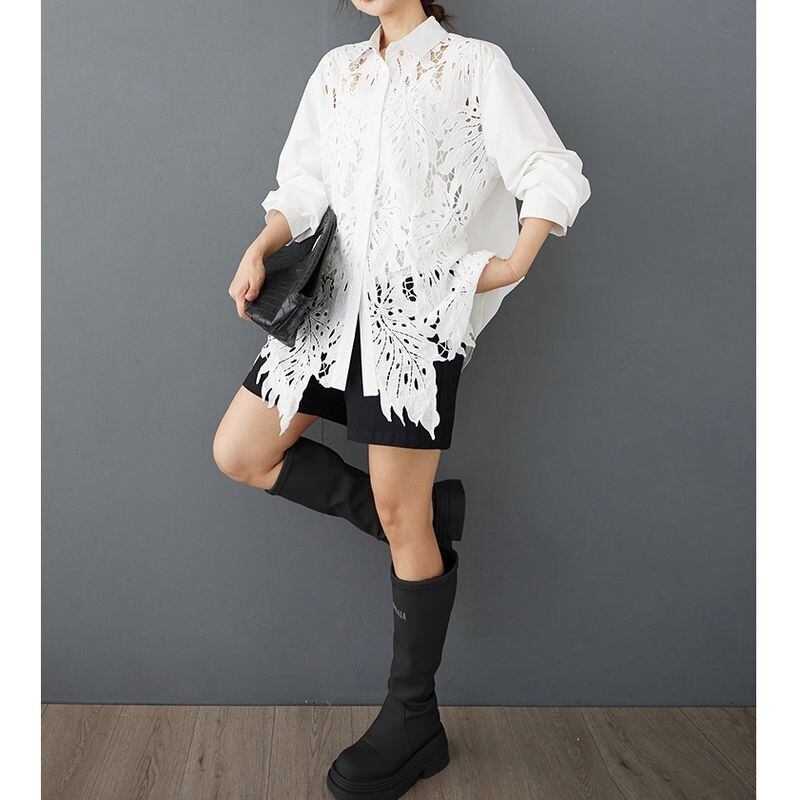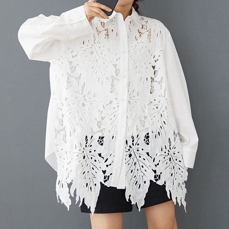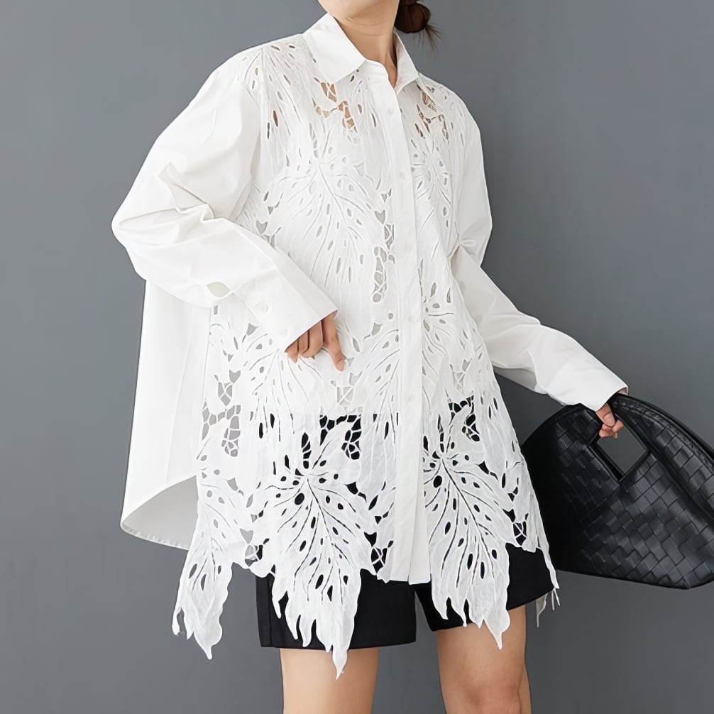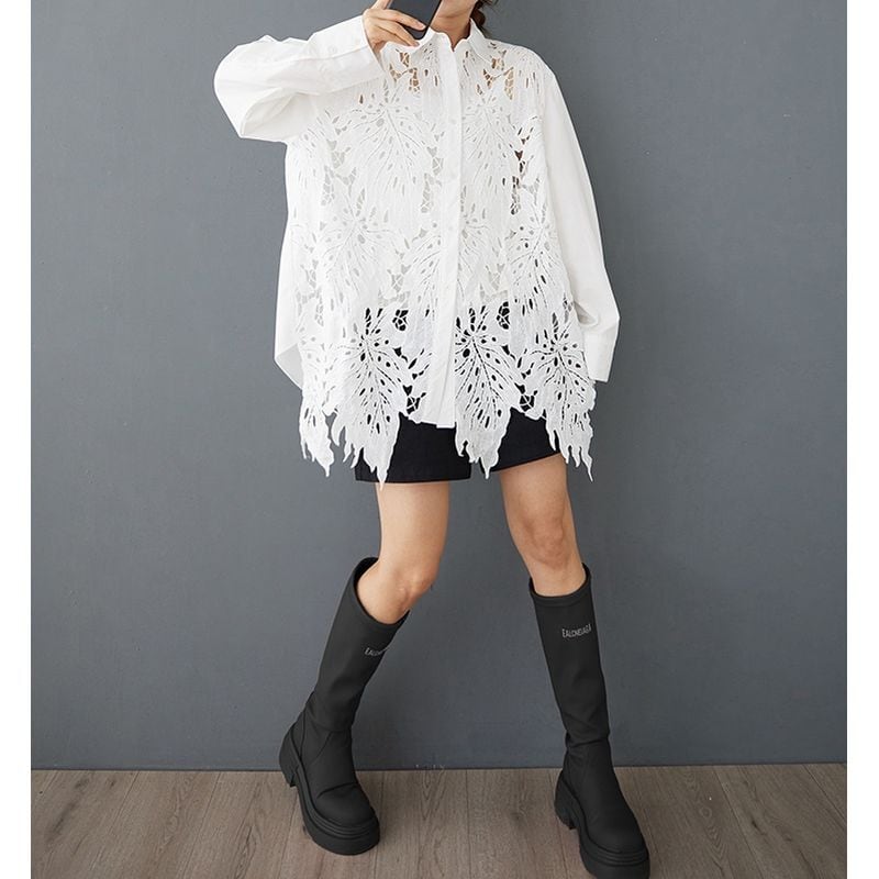 美しいレーストリムが際立つオーバーサイズシャツ。