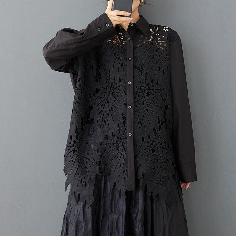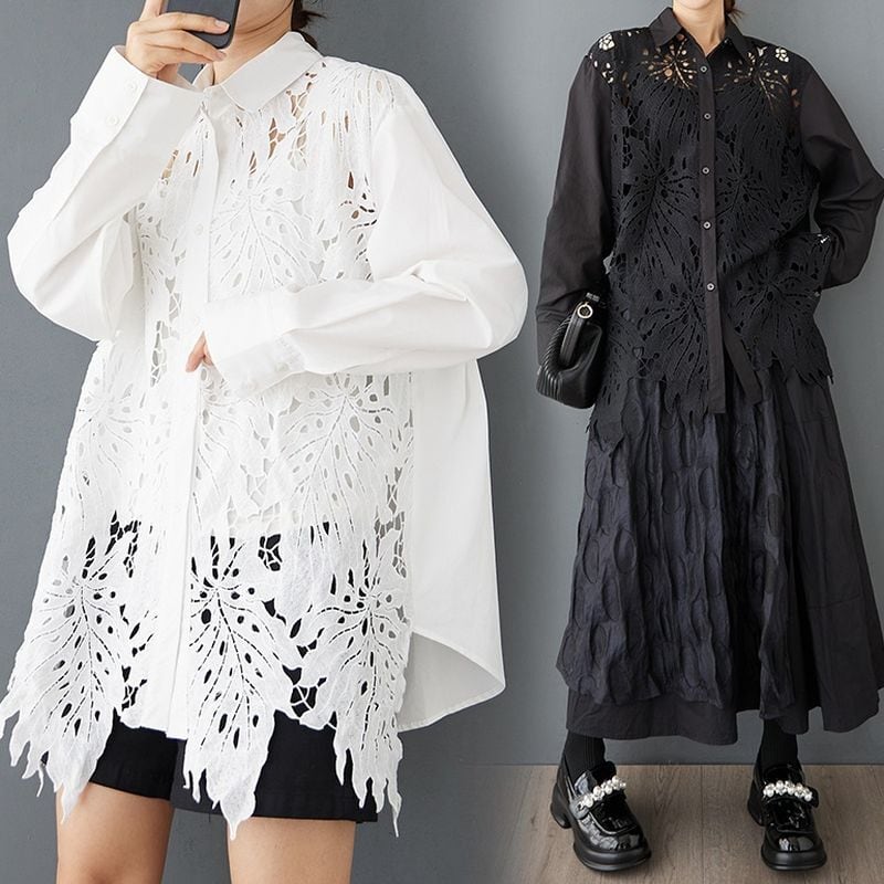 ボタンダウンシャツのデザインに、大胆な葉柄のレーストリムが施された、一枚で主役級の存在感を放つアイテムです。