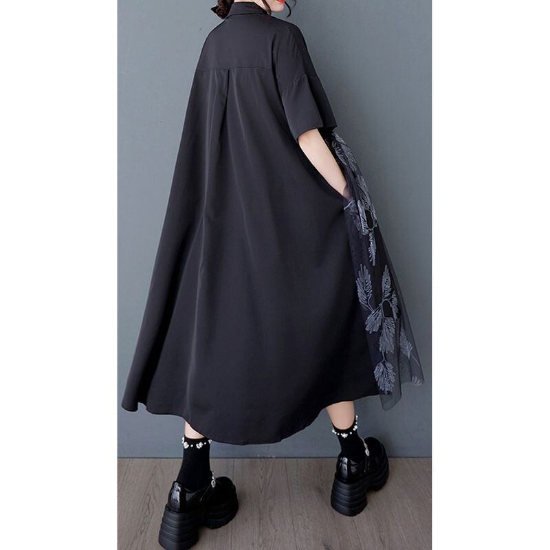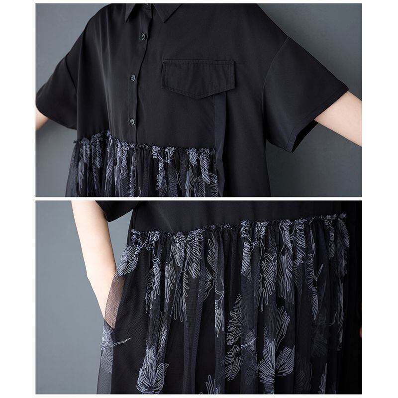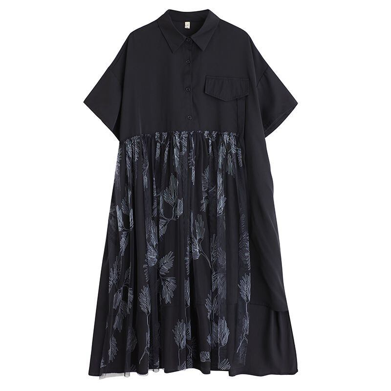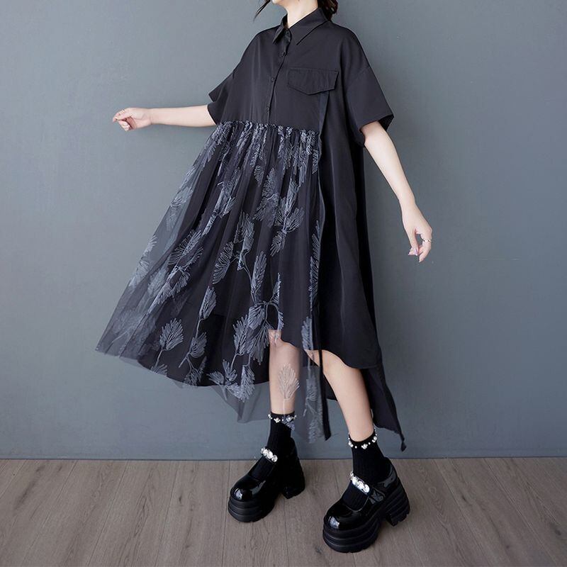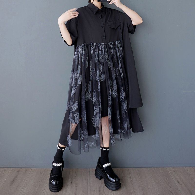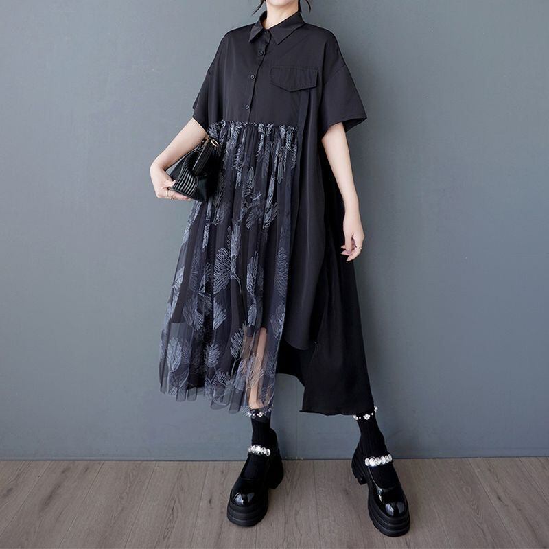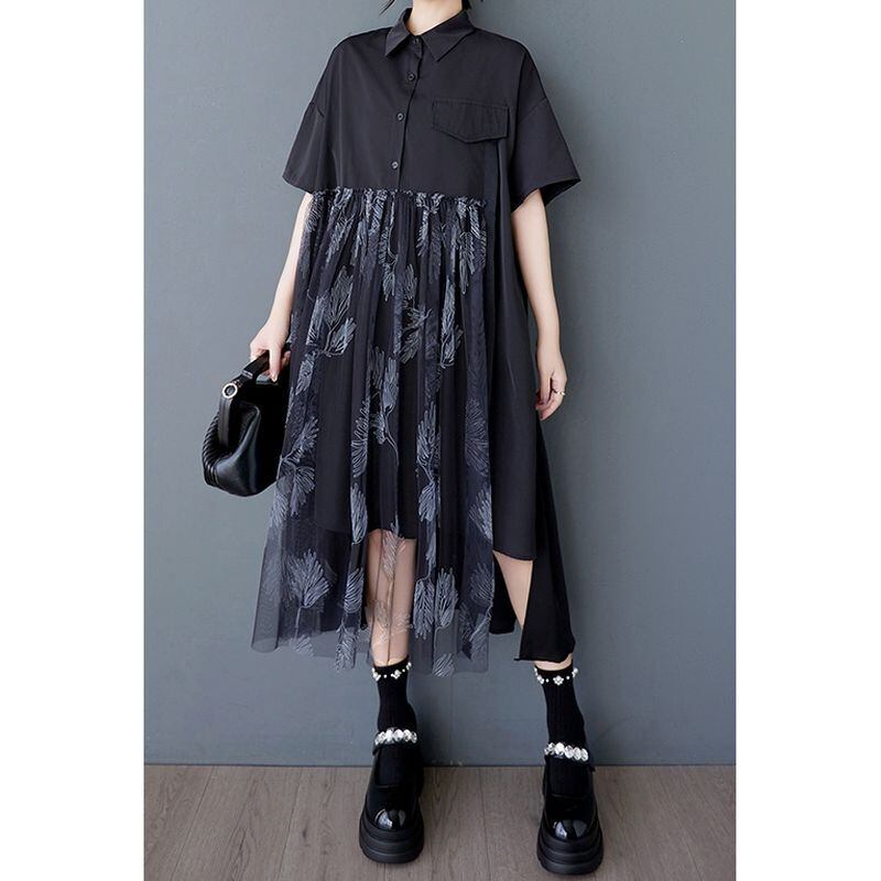 チュール切替スカートがポイントの半袖シャツワンピース。