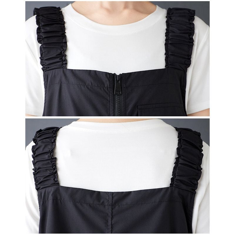 ストラップのギャザーとフロントジッパーディテールがアクセントになったサロペットスカート。