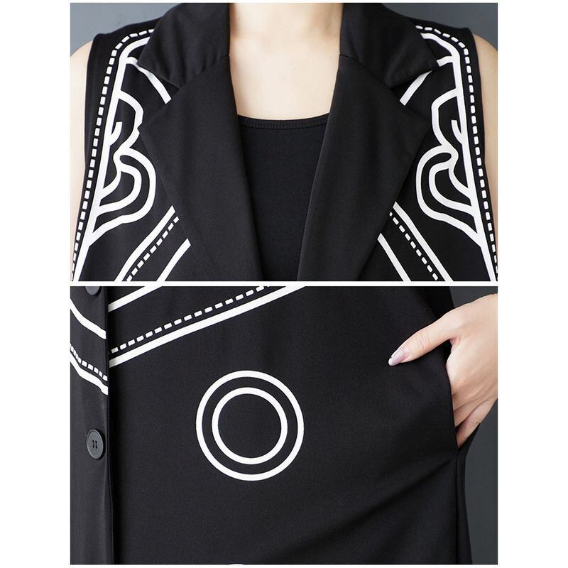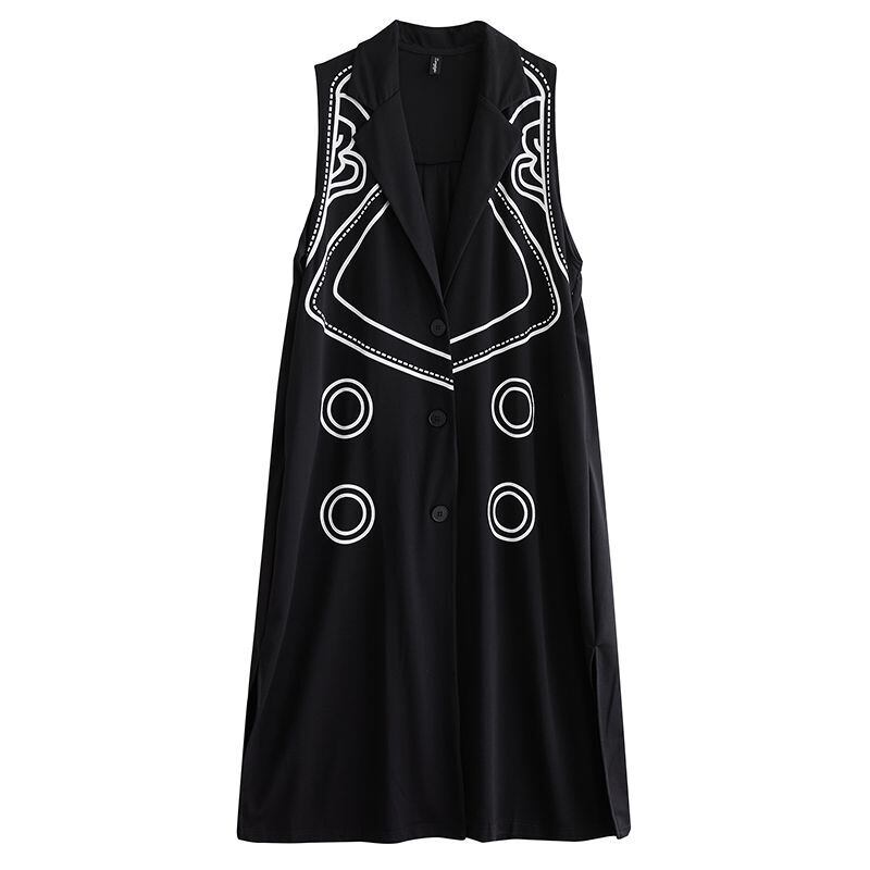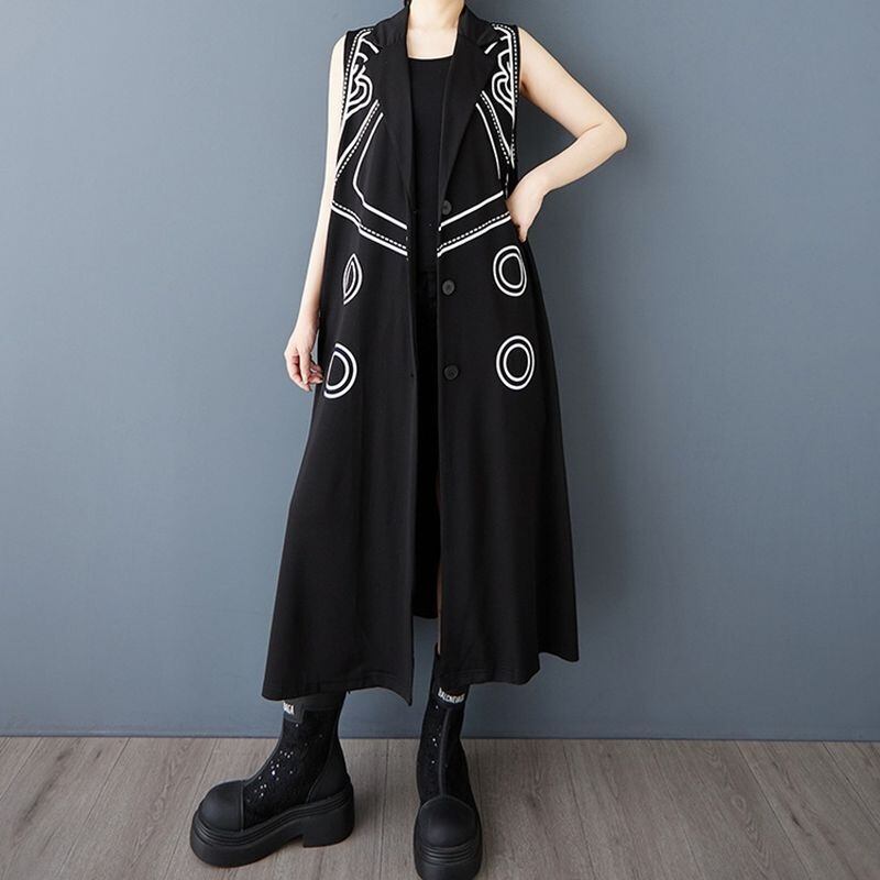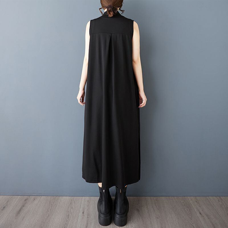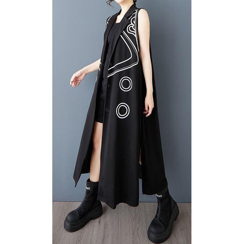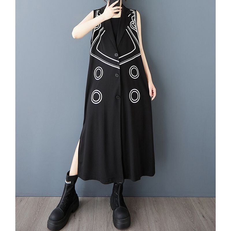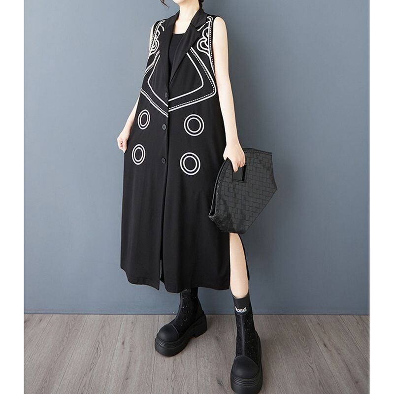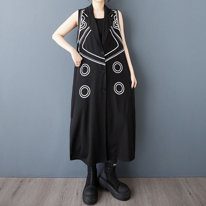 スタイリッシュな模様がアクセントになった、ノースリーブのロング丈ジャケットドレス。