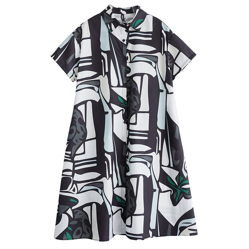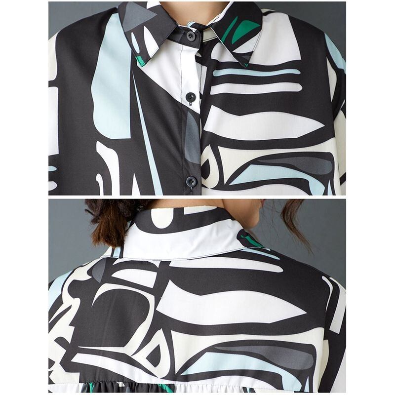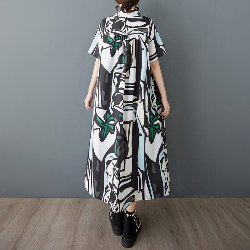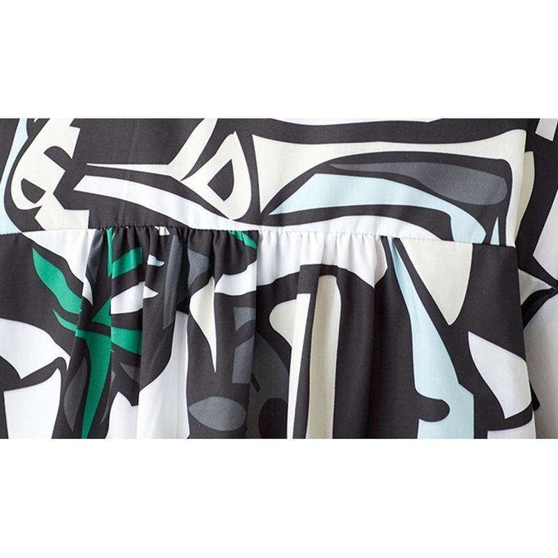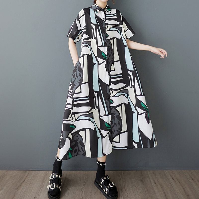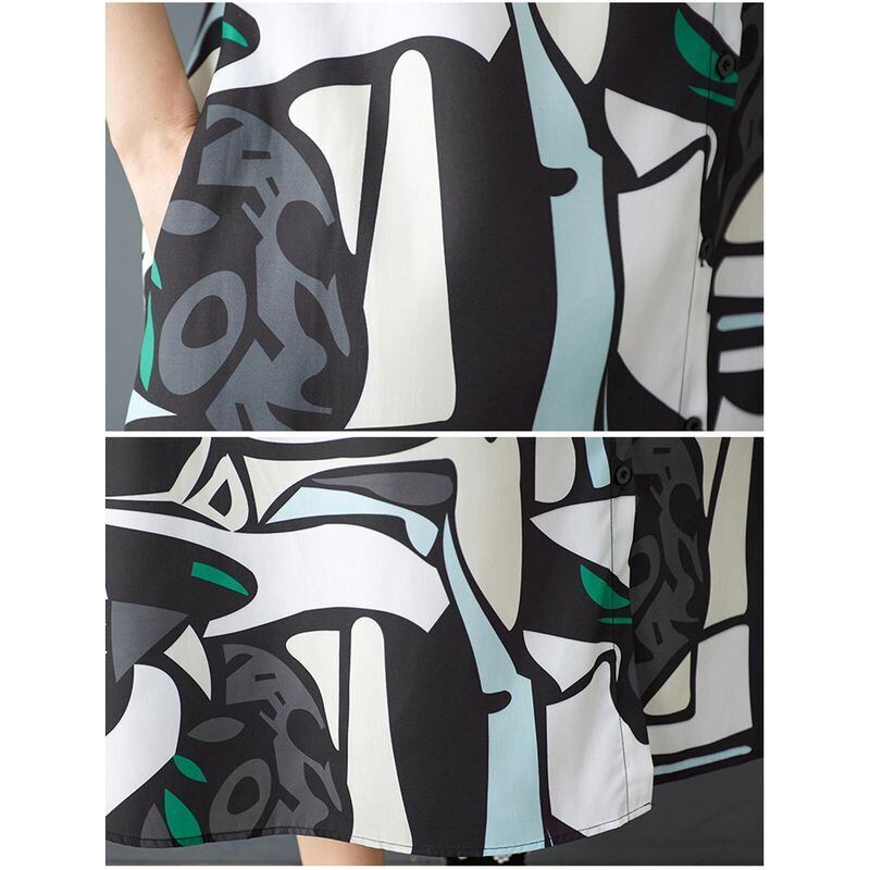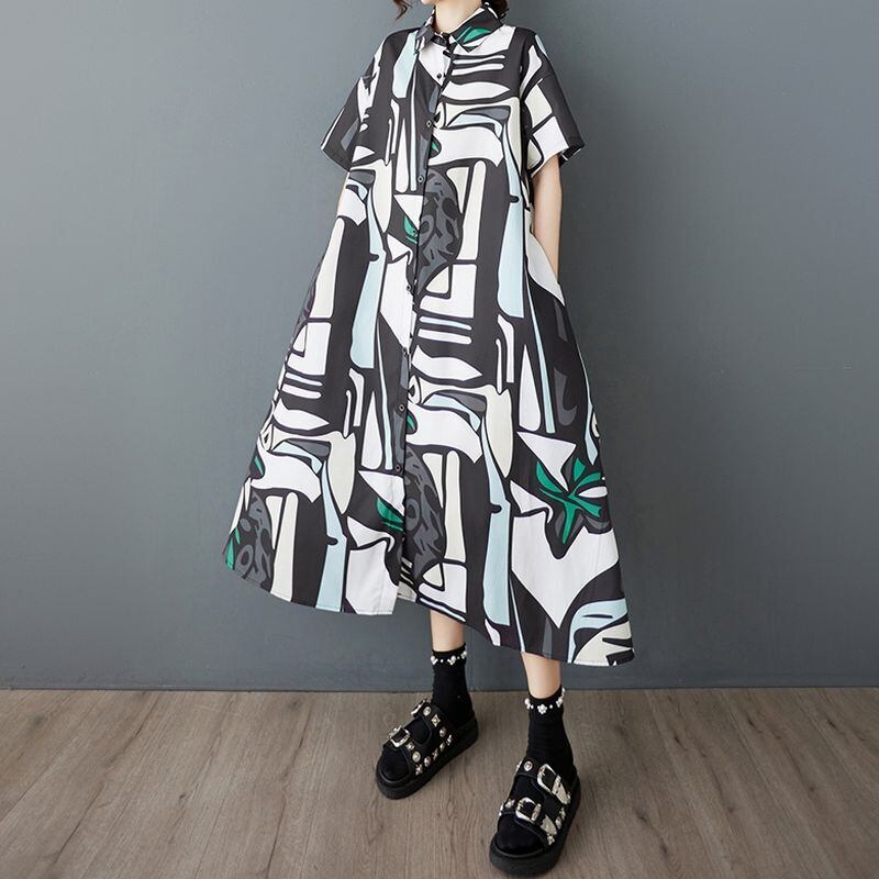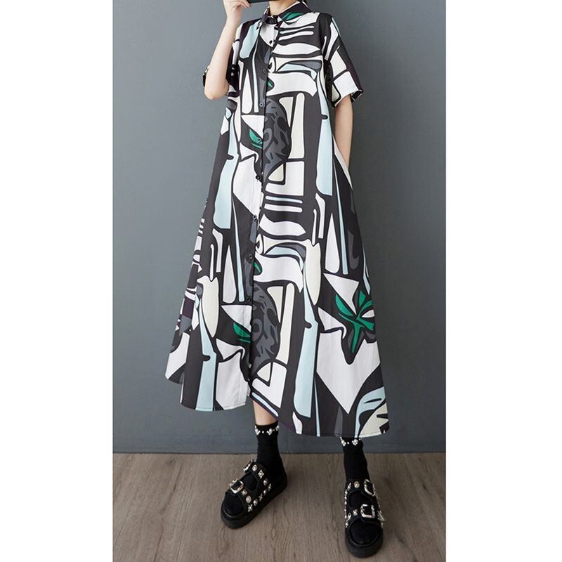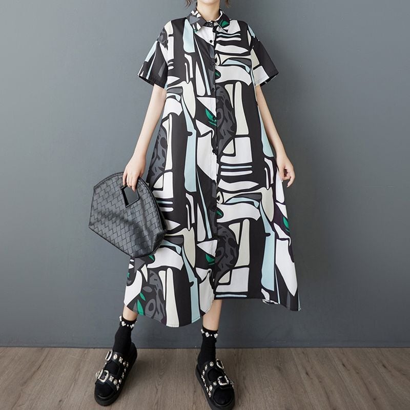 スタイリッシュな抽象柄が目を惹くロング丈シャツワンピース。