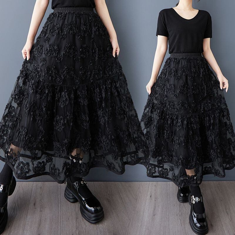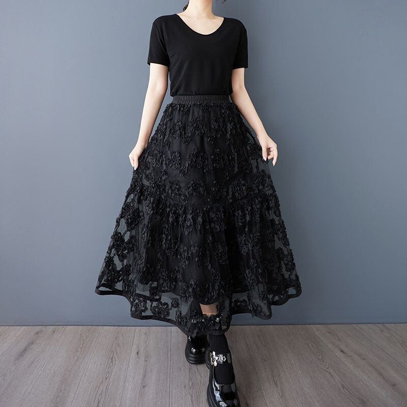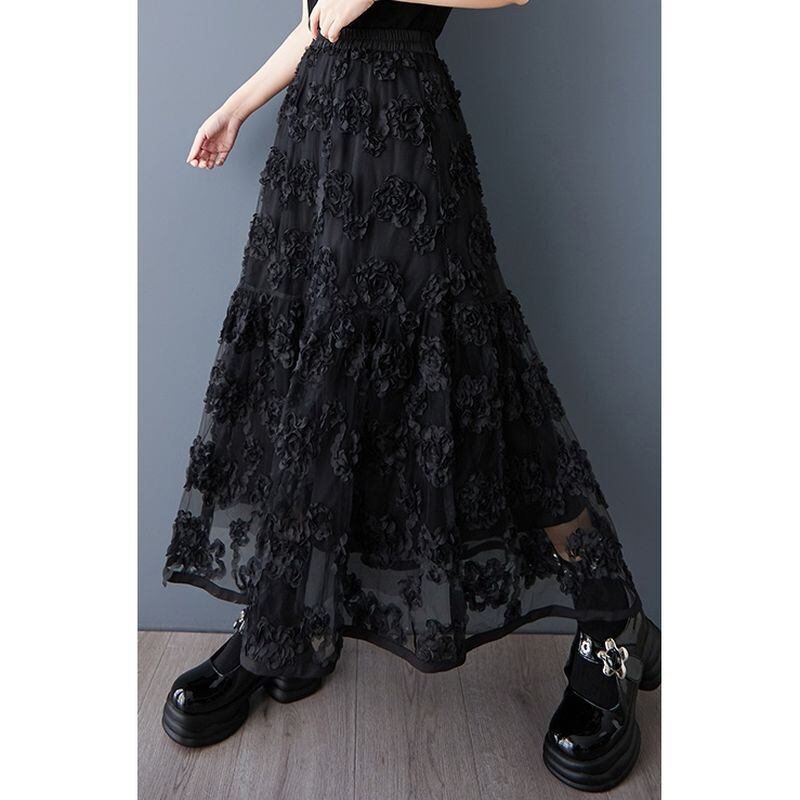 ウエストはゴム仕様でリラックス感もあり、透け感と立体感のある素材が軽やかさをプラス。