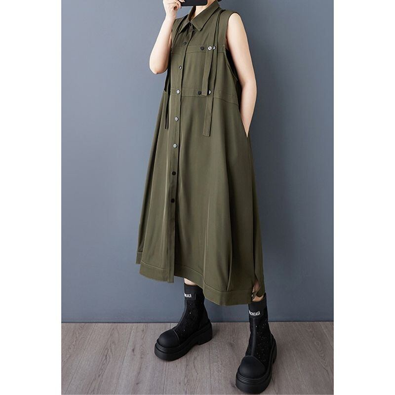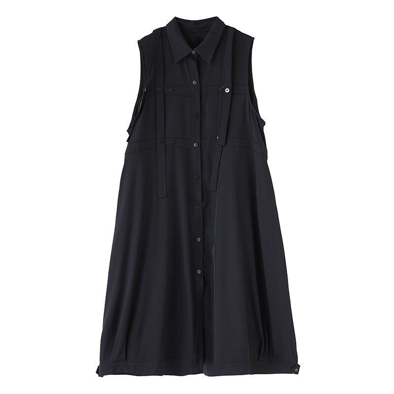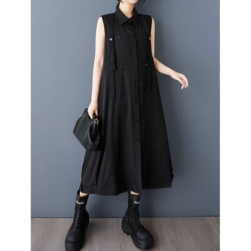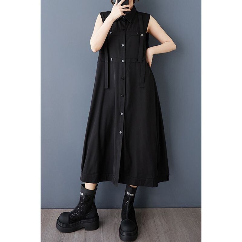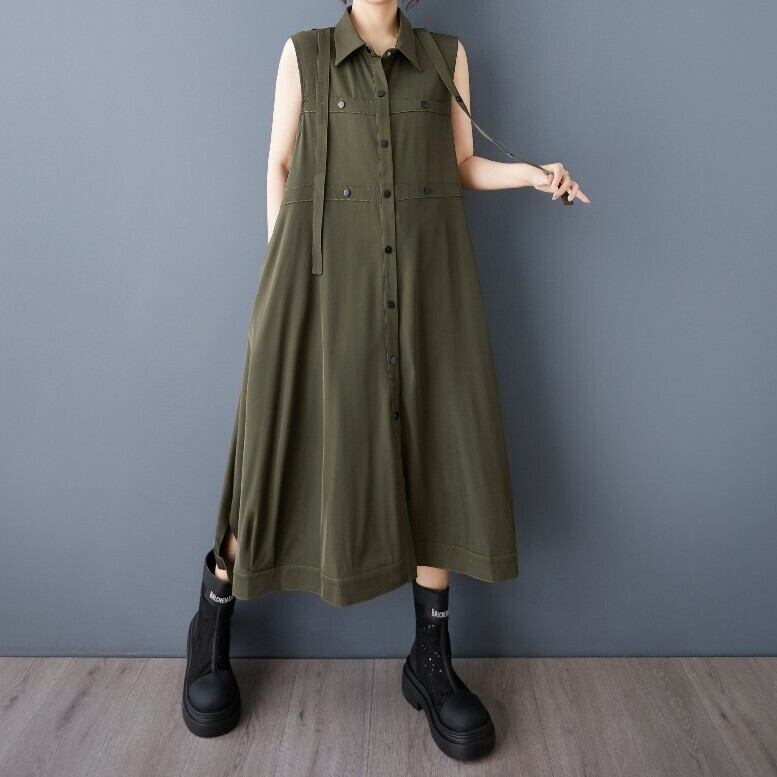 シャツカラーに前開きボタン、Aラインのシルエットが映えるマキシ丈のノースリーブワンピース。