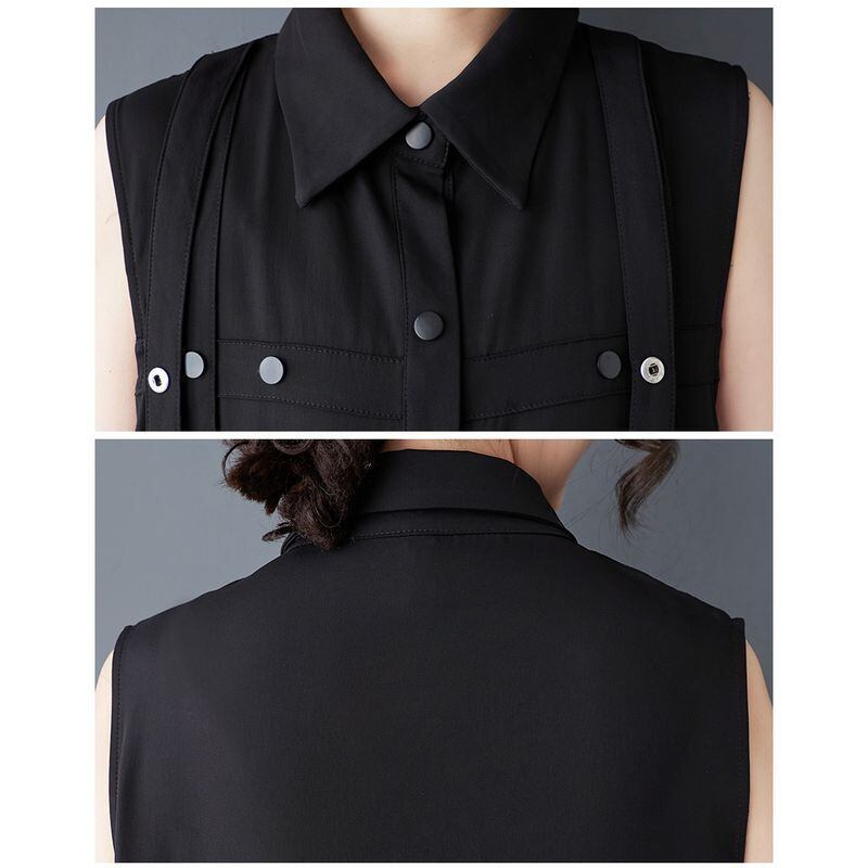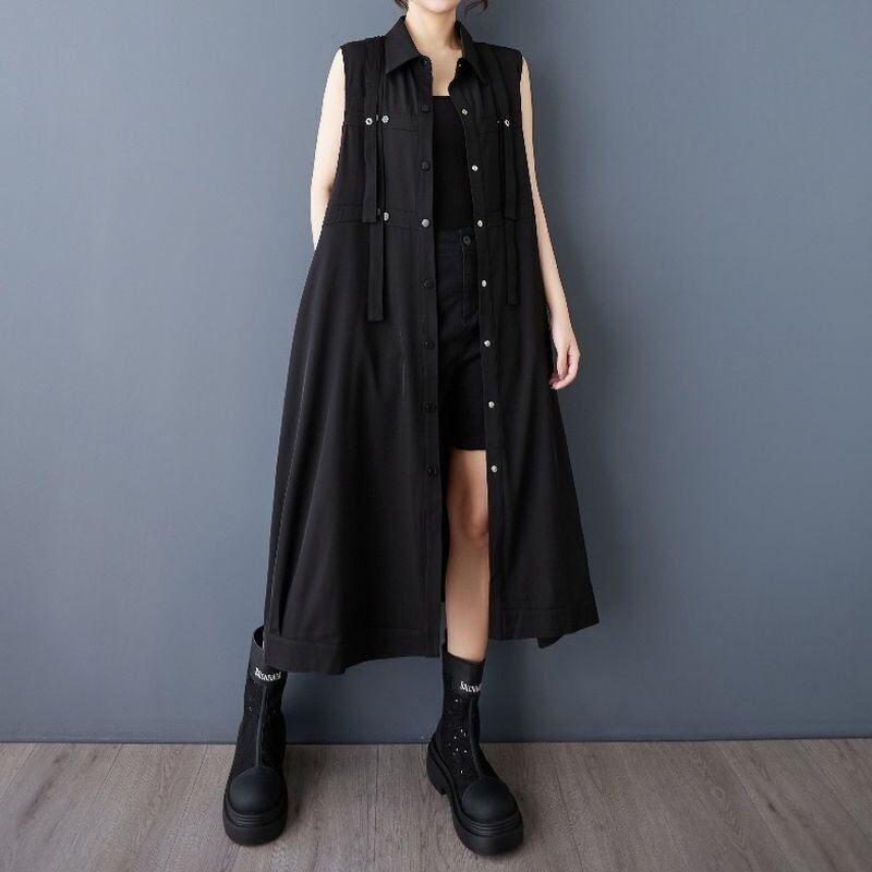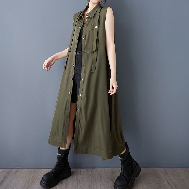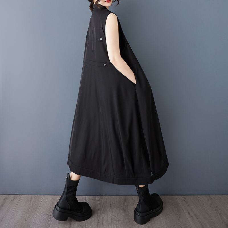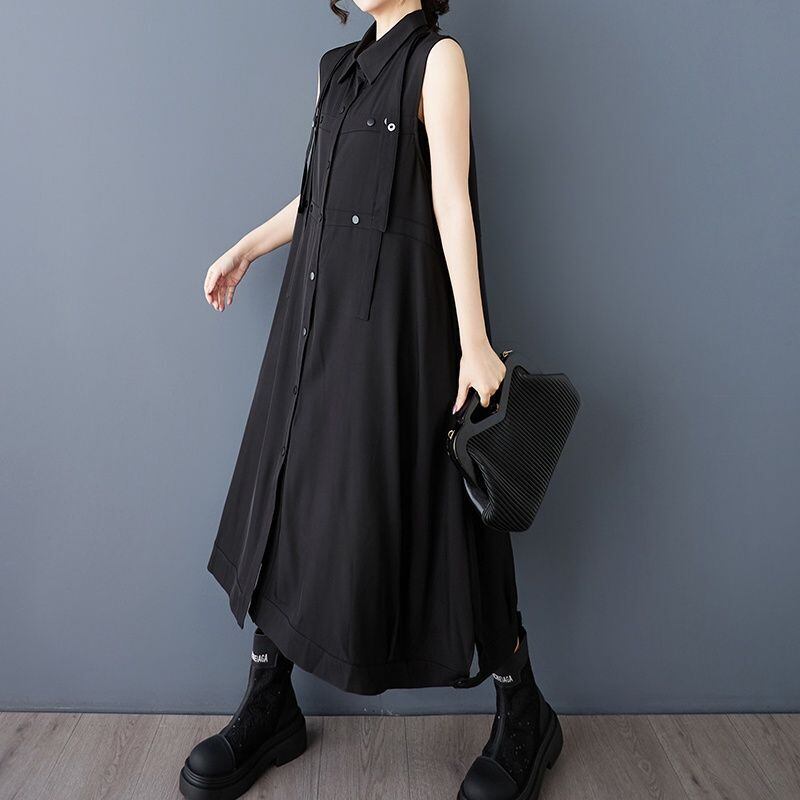 シャツカラーに前開きボタン、Aラインのシルエットが映えるマキシ丈のノースリーブワンピース。