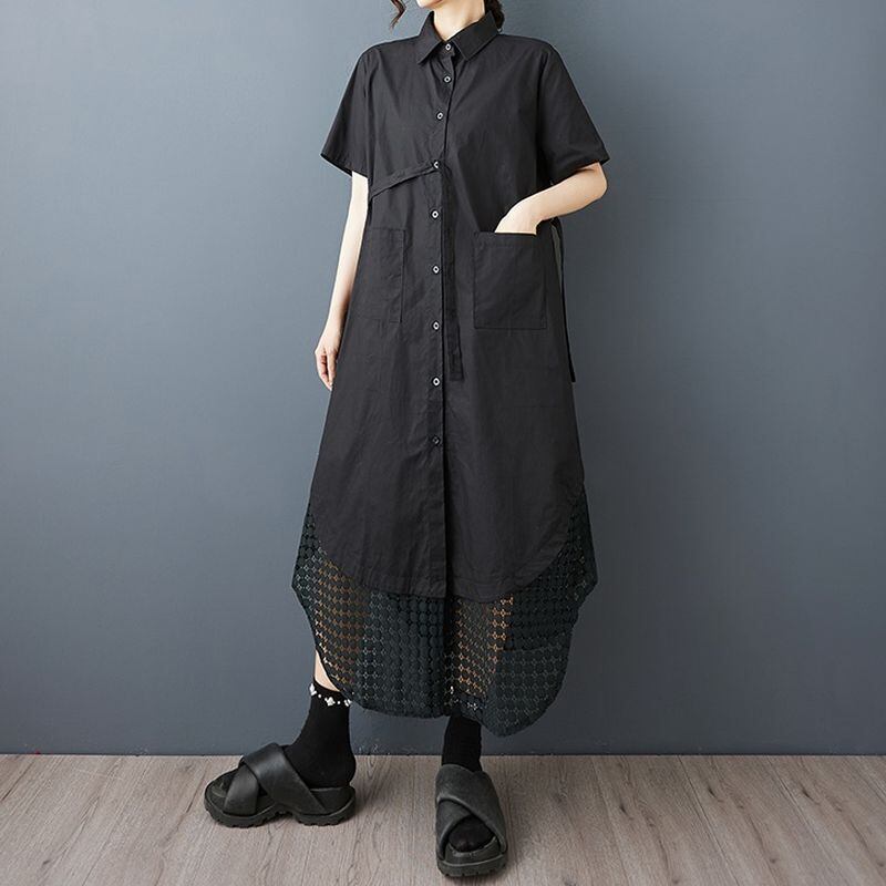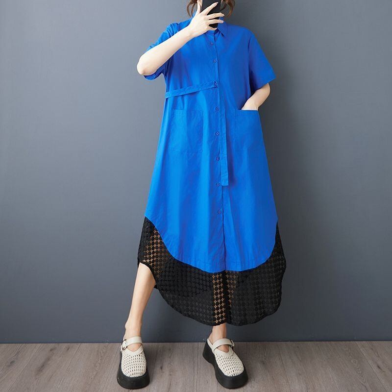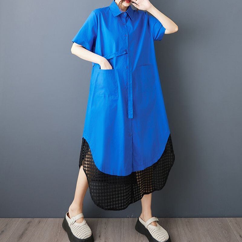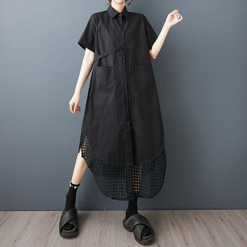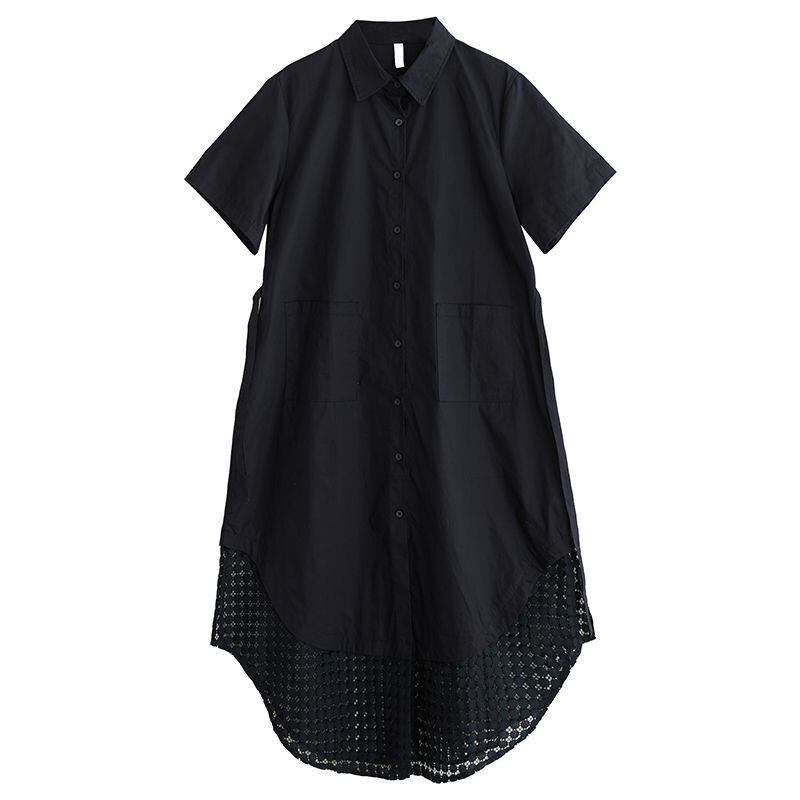 裾のラウンドカットと透かし編みのレイヤードデザインが目を引くシャツワンピース。