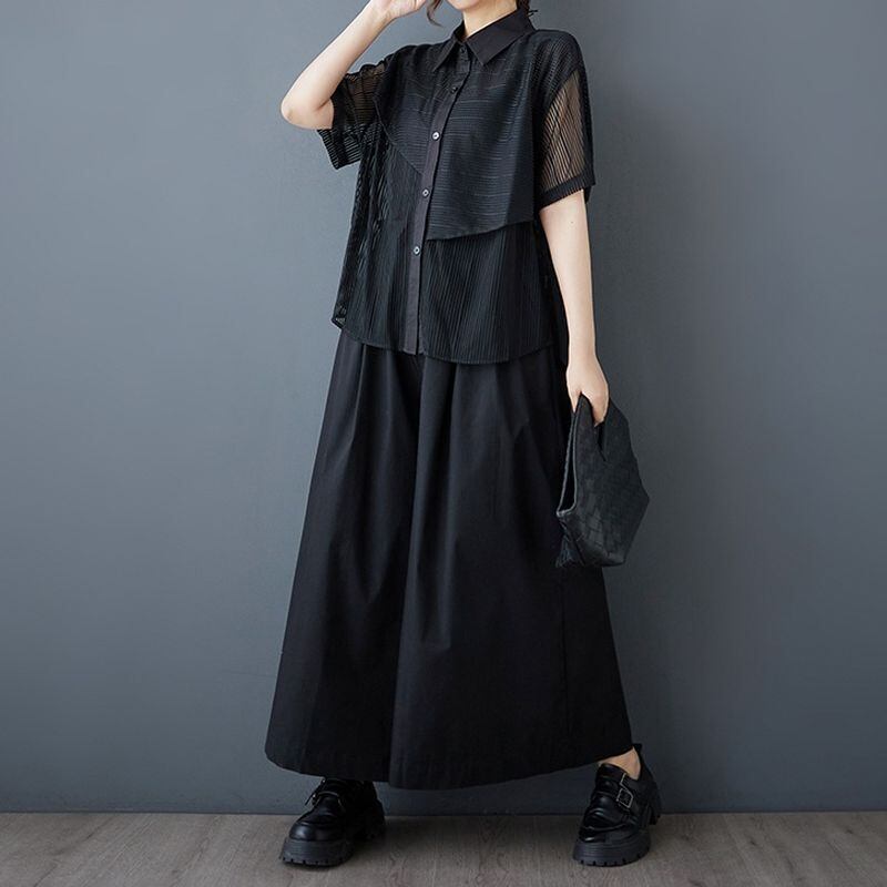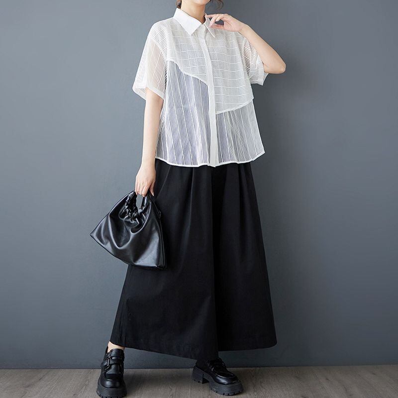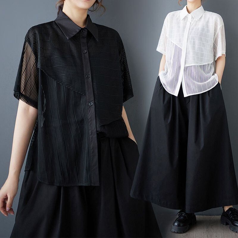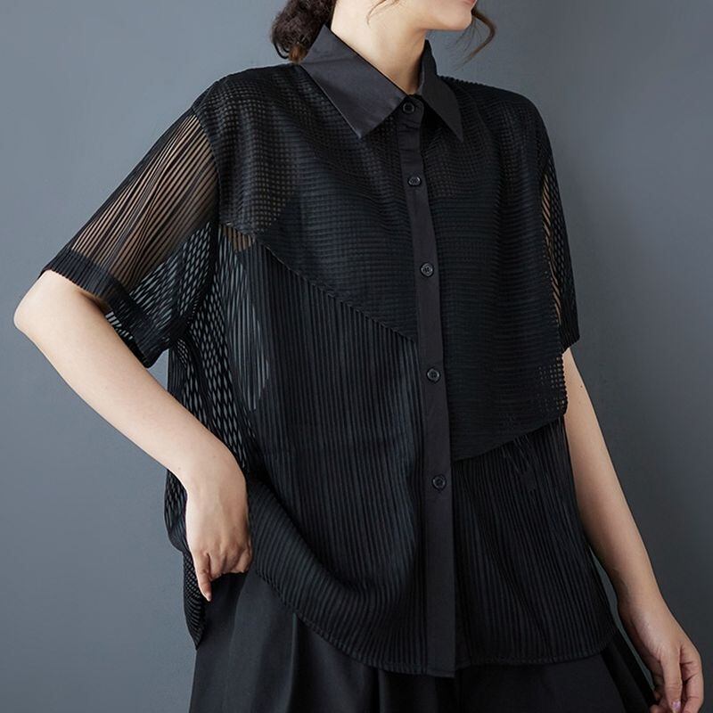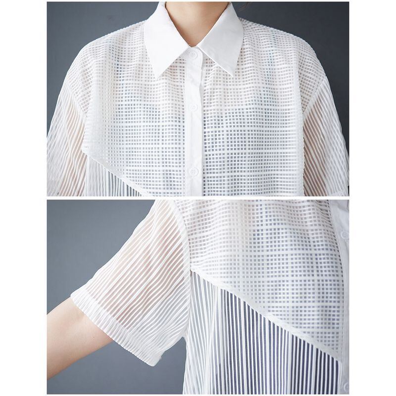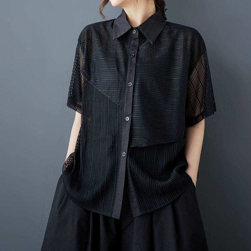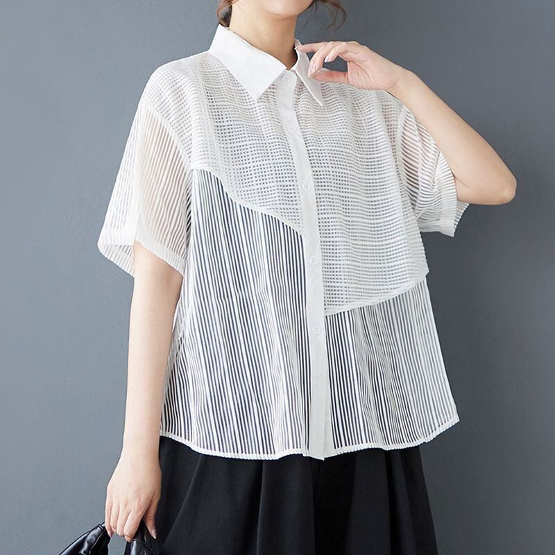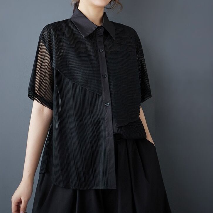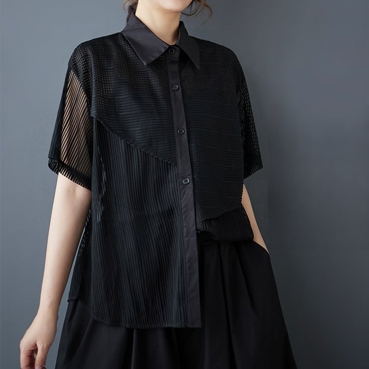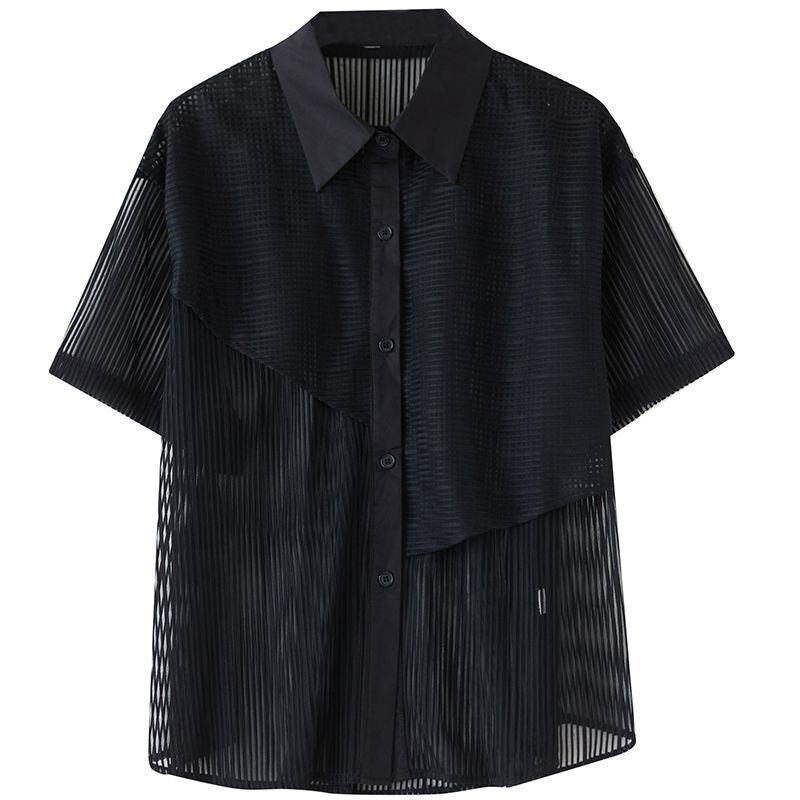 透け感のあるメッシュ素材をアシンメトリーに切り替えたデザインシャツ。