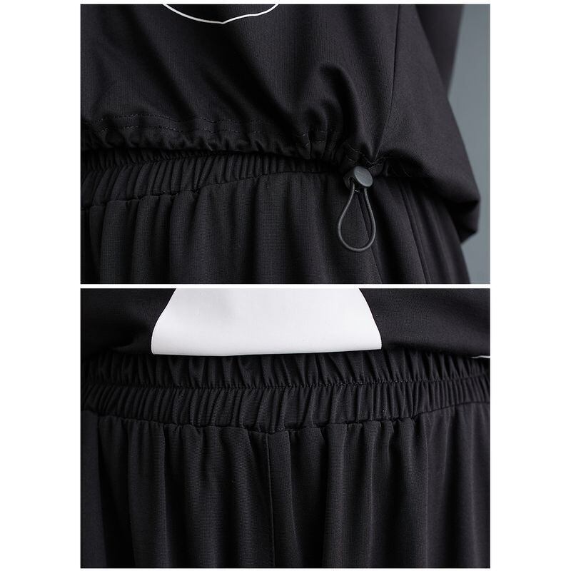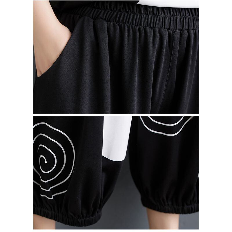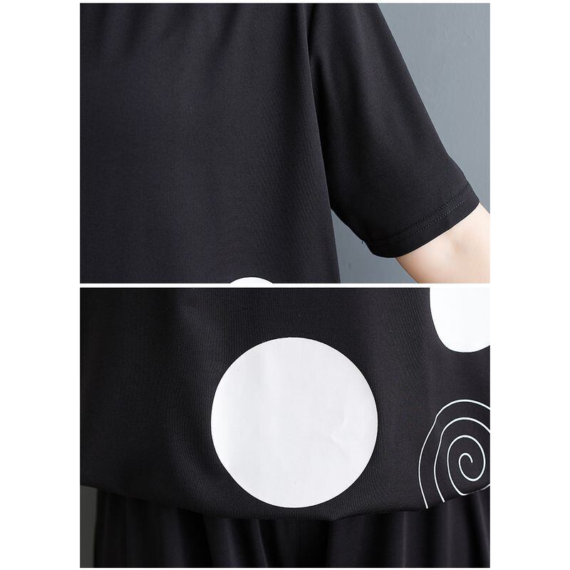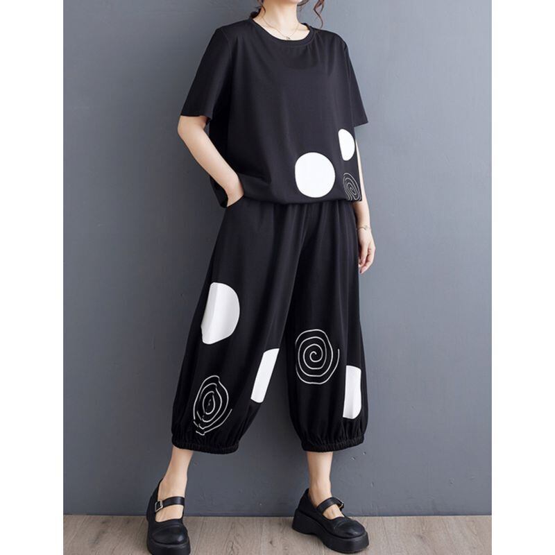 黒地に白いドットと渦巻き柄が印象的なTシャツとキュロット。