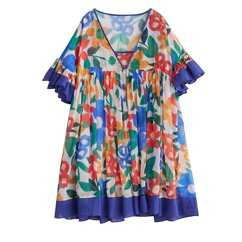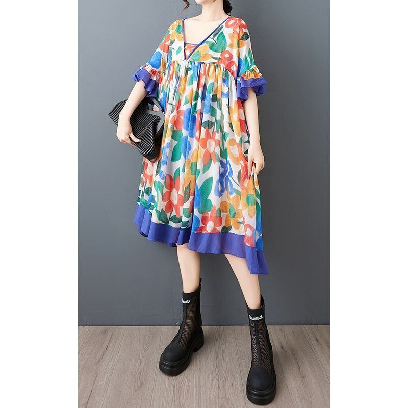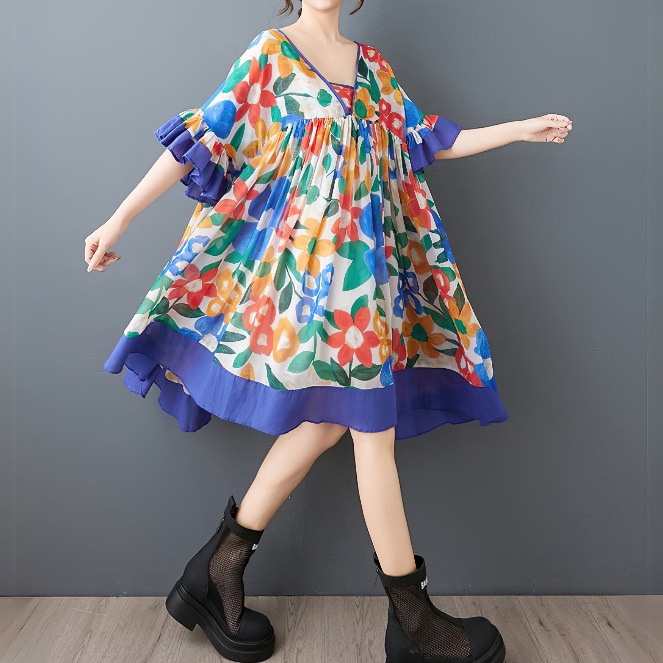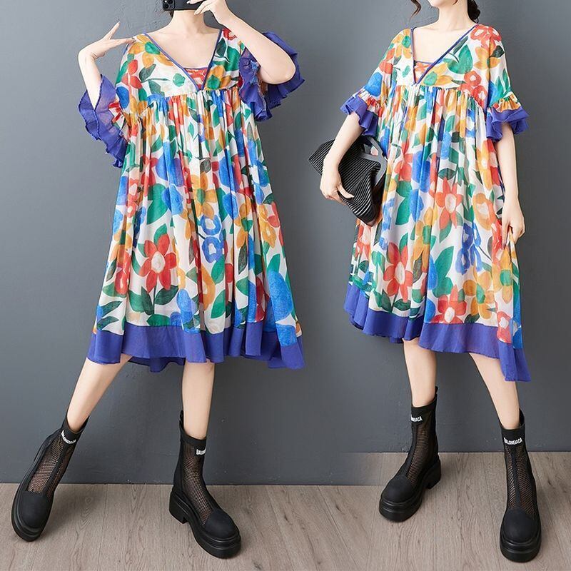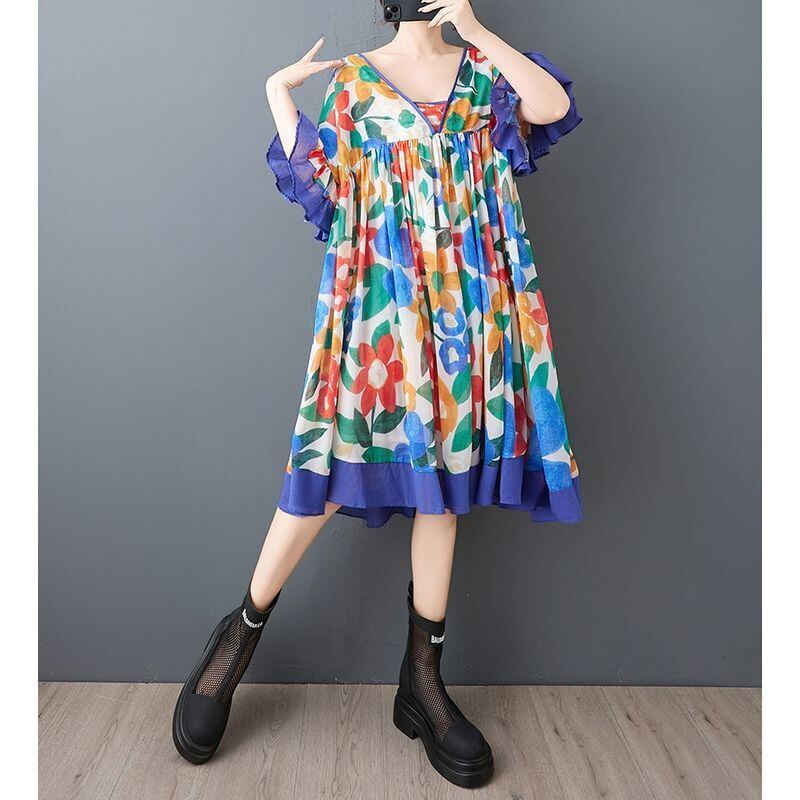 華やかな花柄プリントが目を引く、Vネックのフリルスリーブワンピース。