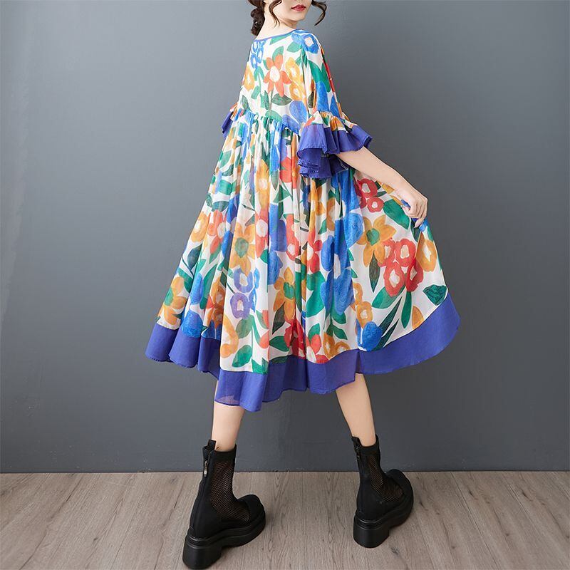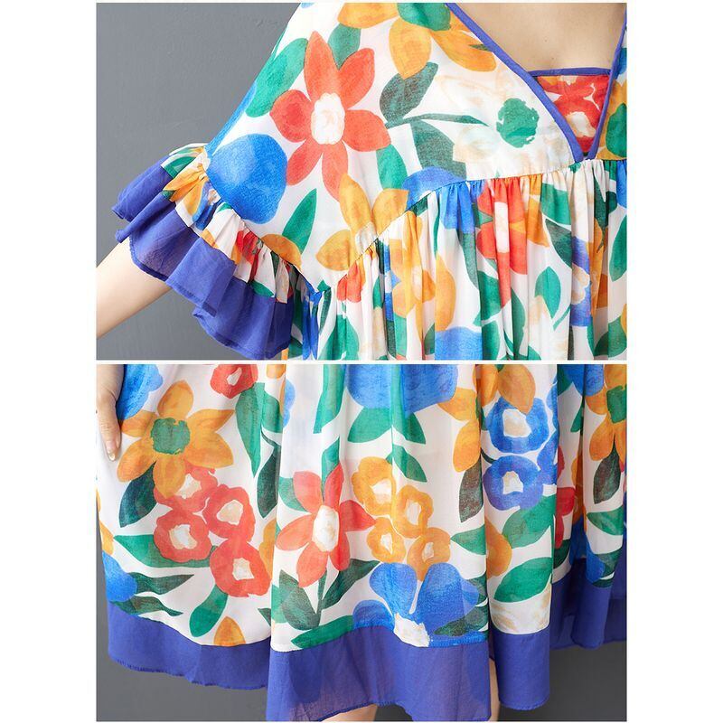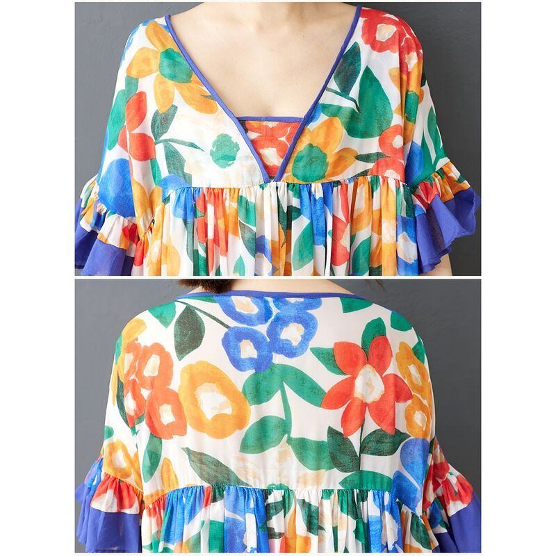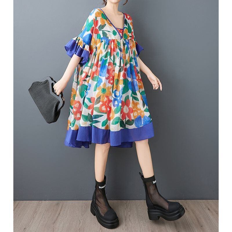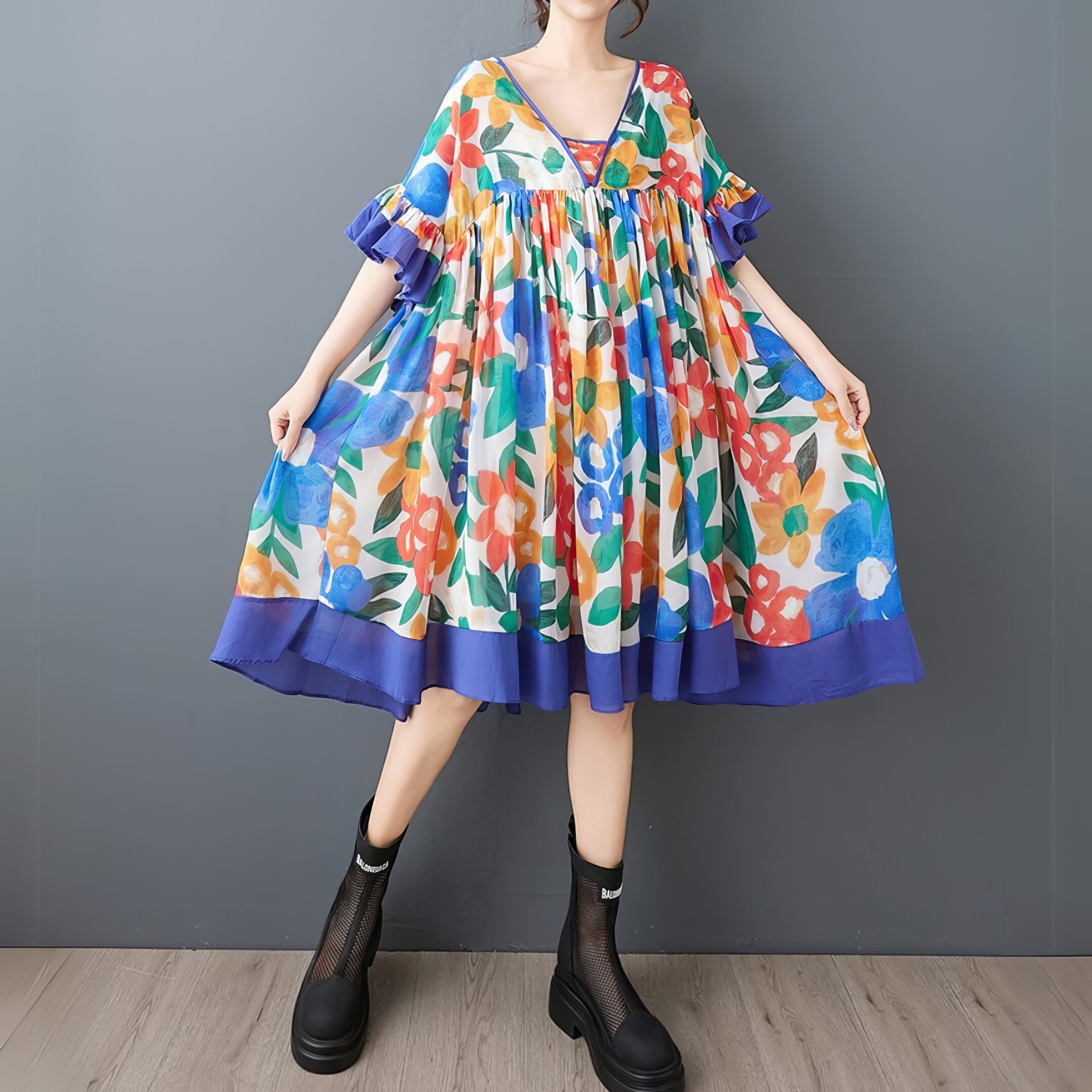 華やかな花柄プリントが目を引く、Vネックのフリルスリーブワンピース。