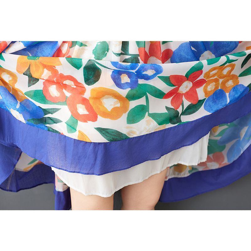 袖口と裾にあしらわれた鮮やかなブルーのフリルがアクセントになり、全体のデザインを引き締めています。