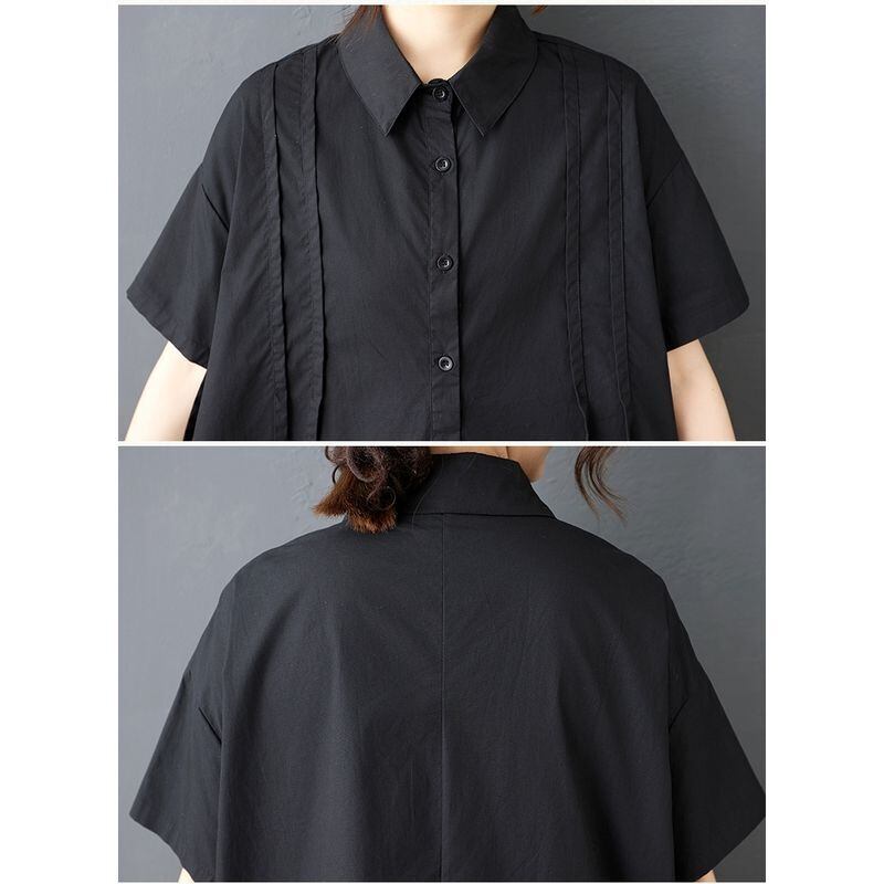 ボタンダウンシャツのきちんと感と、大胆なヘムカットが絶妙なバランスを生み出しています。