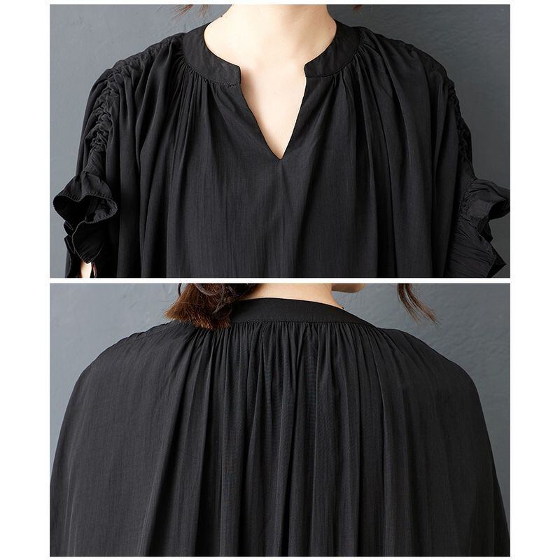 シンプルな無地デザインながらも、存在感のあるフリルスリーブと、ゆったりとしたシルエットが魅力の一着です。