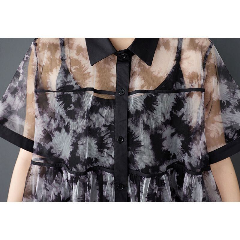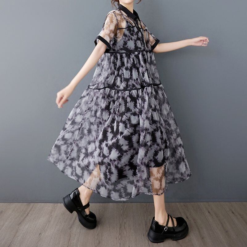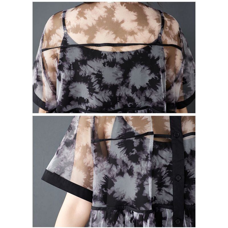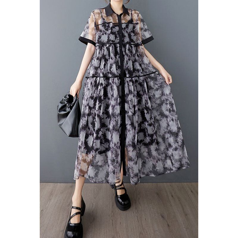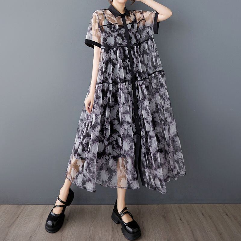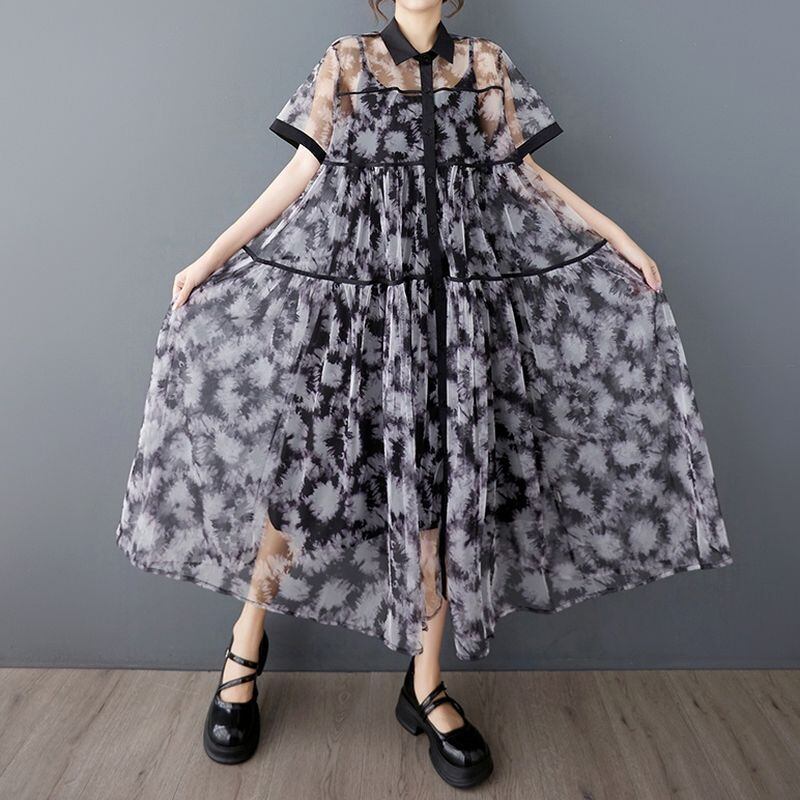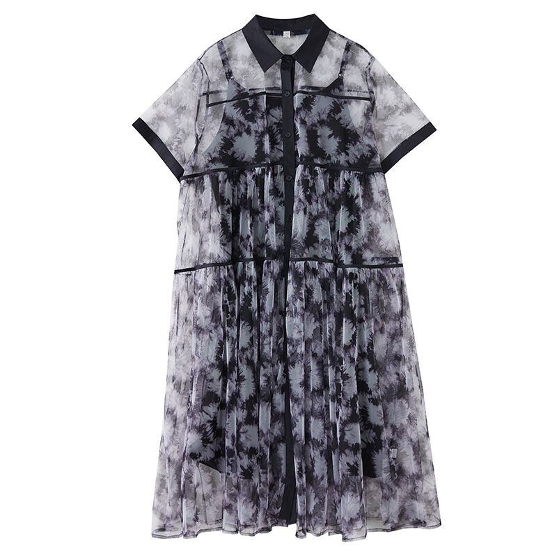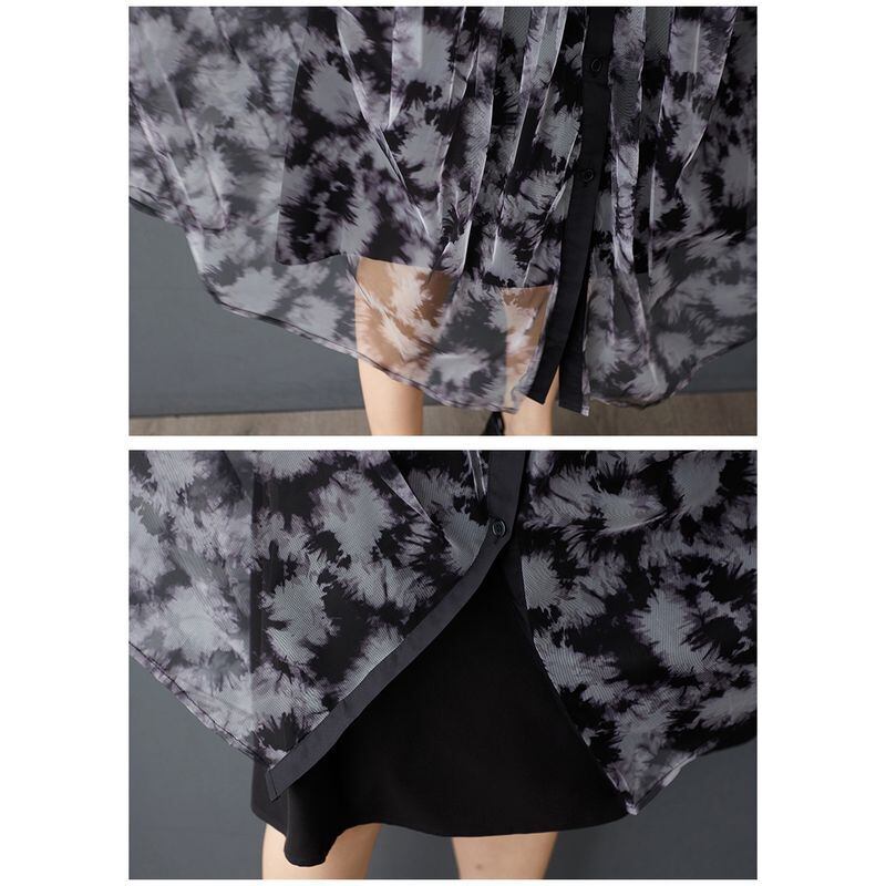 透け感のあるシフォン素材に、モードなタイダイ風プリントが施されたワンピースです。