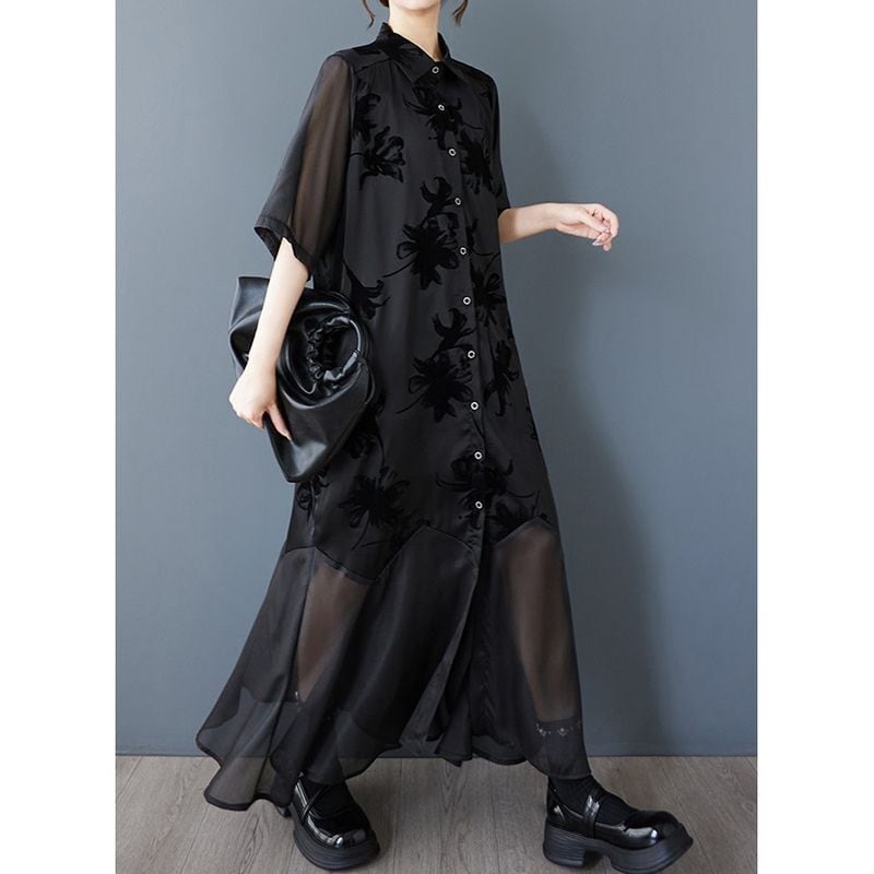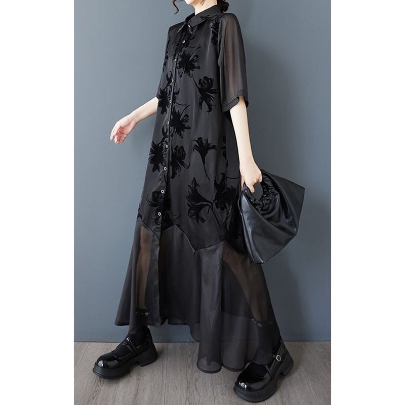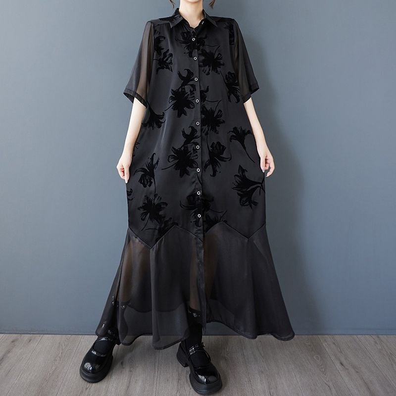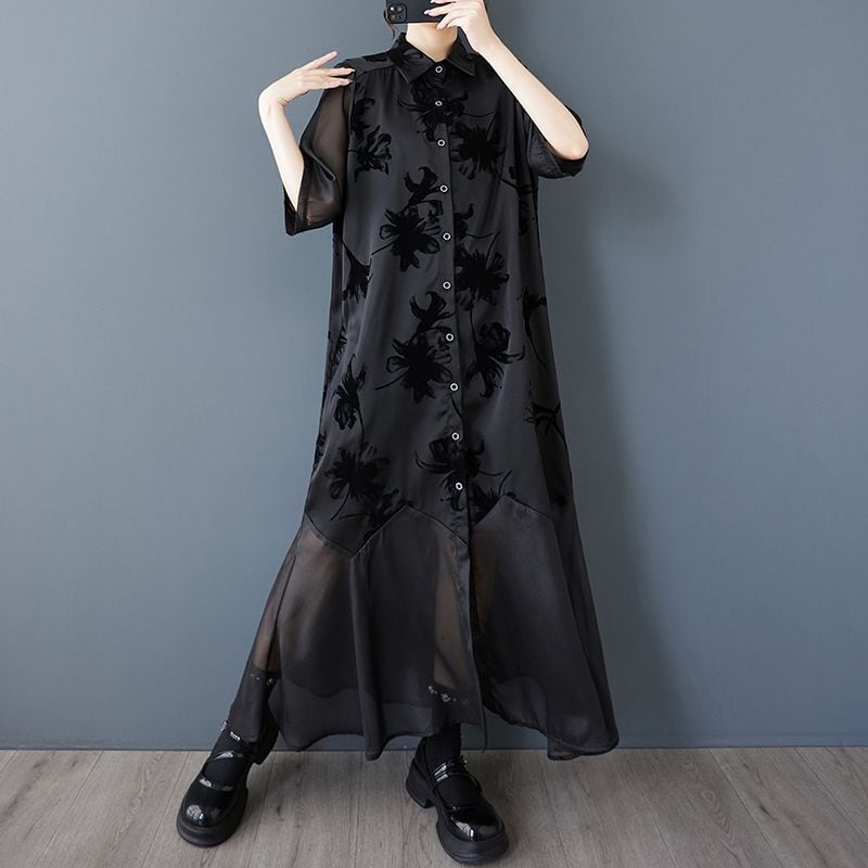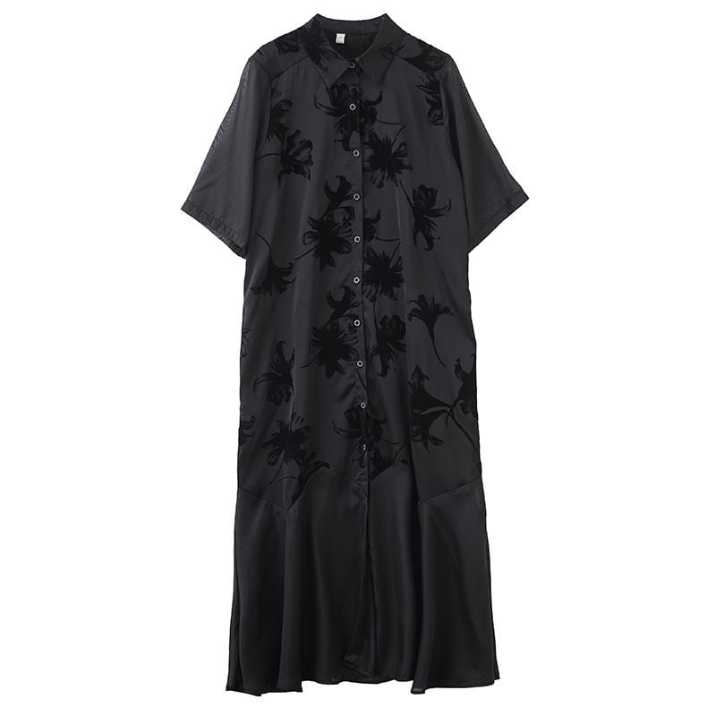一枚で華やかさを演出できるユリ柄のシャツワンピースです。