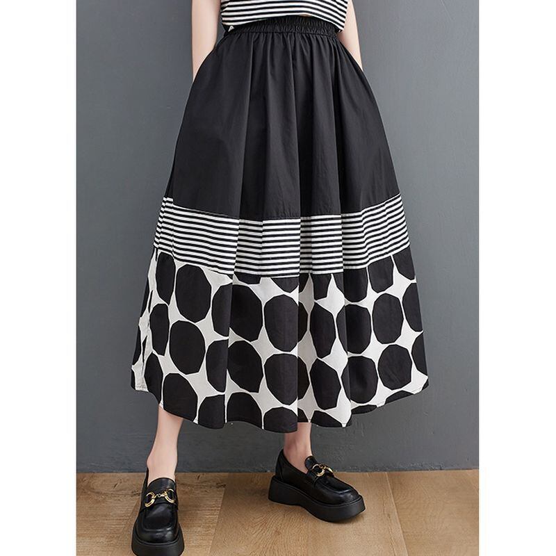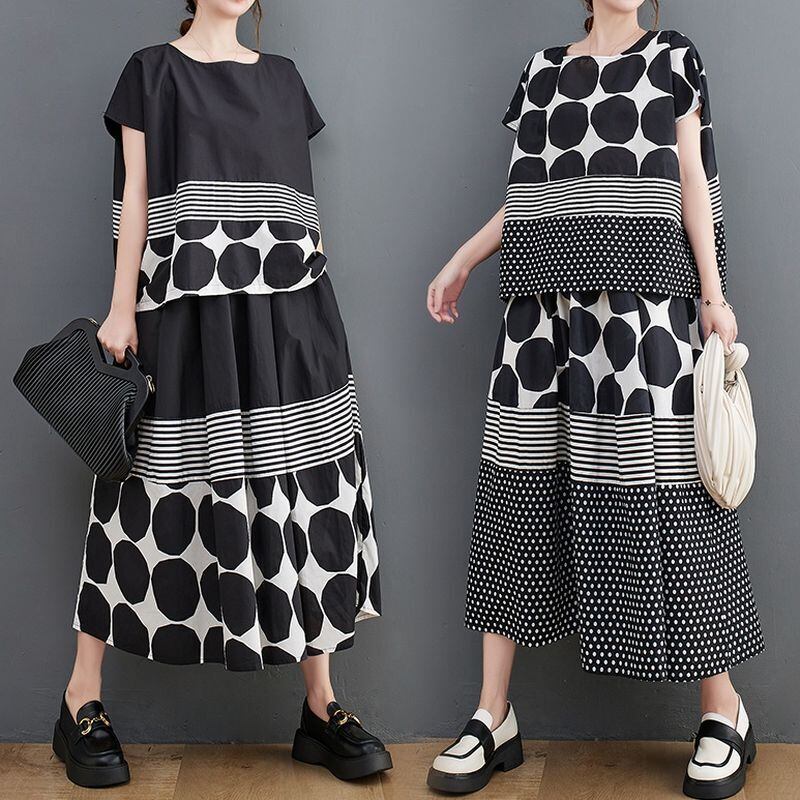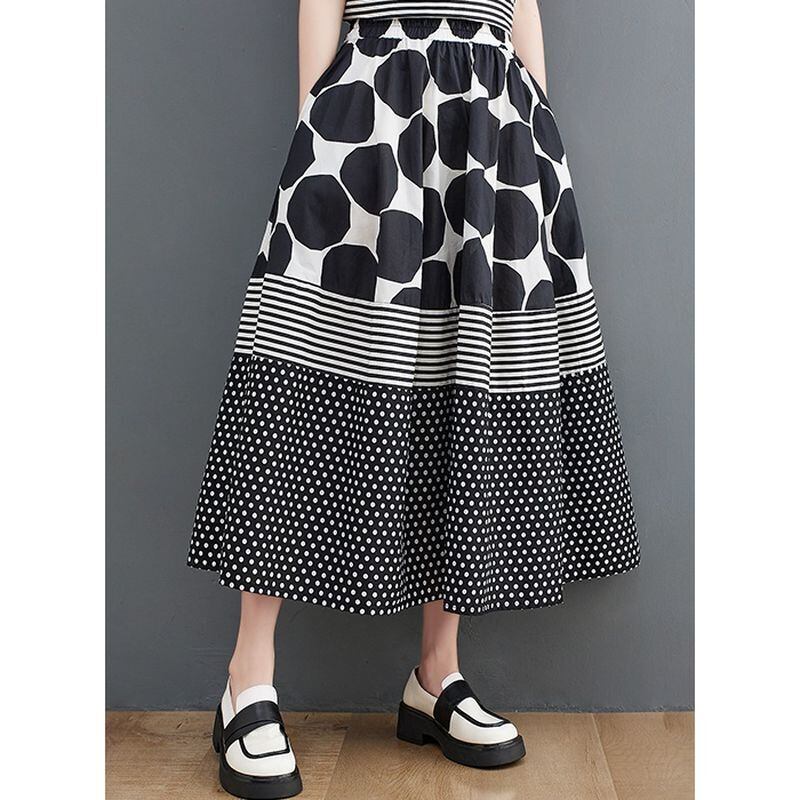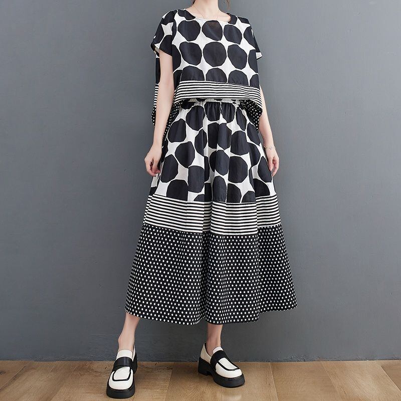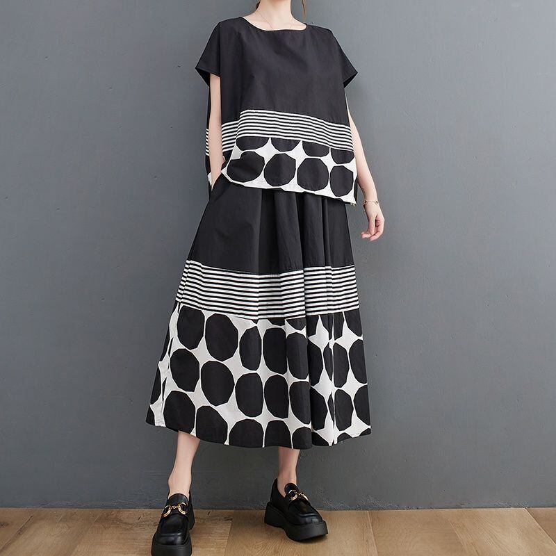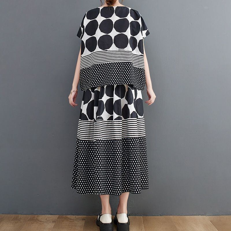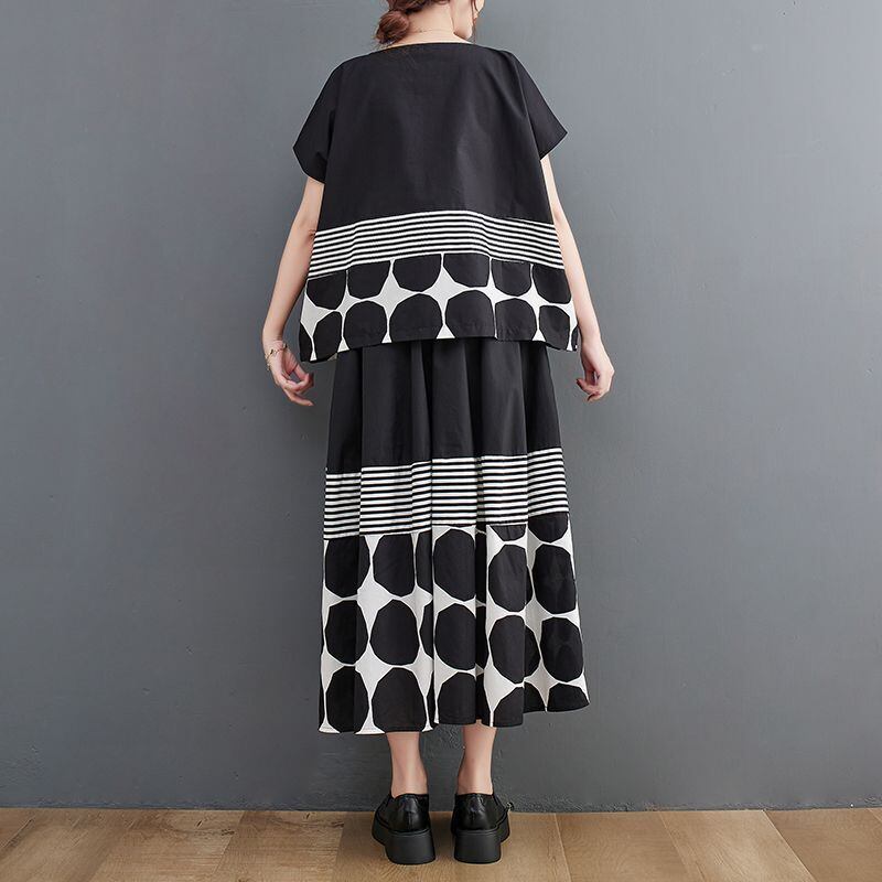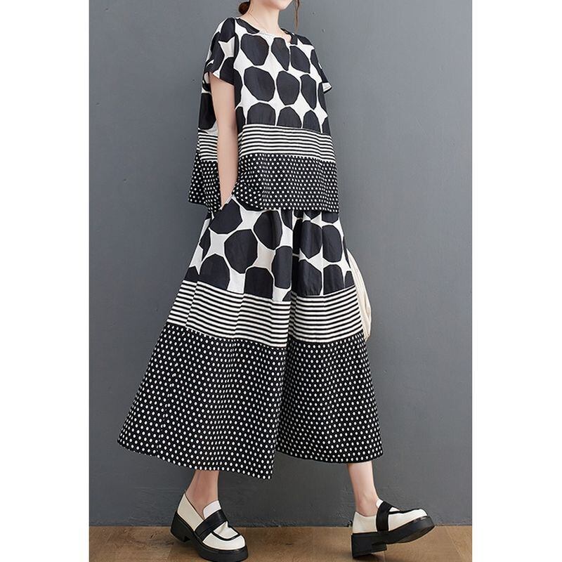 大胆なモノトーンのドット柄とストライプ柄の切り替えが、スタイリッシュな印象を与えます。