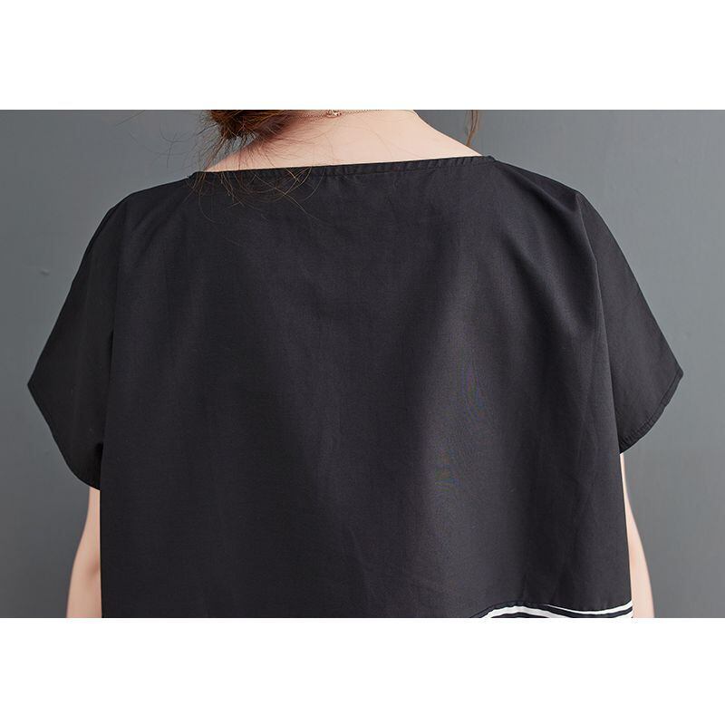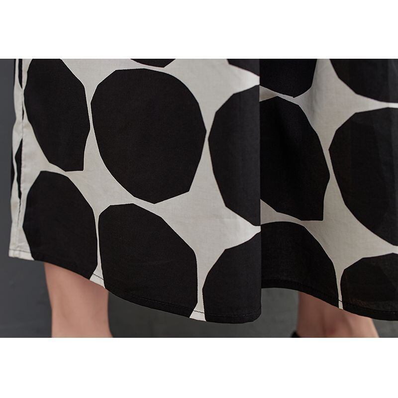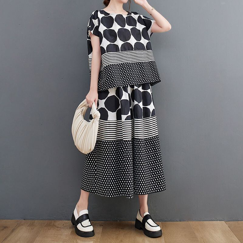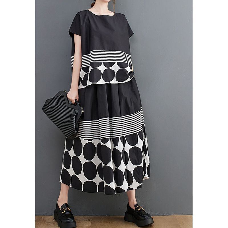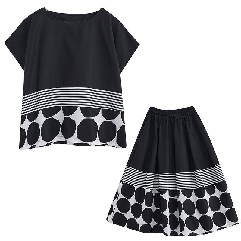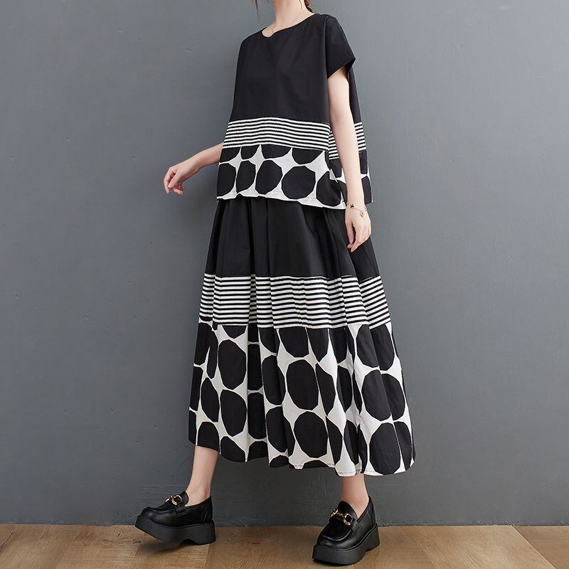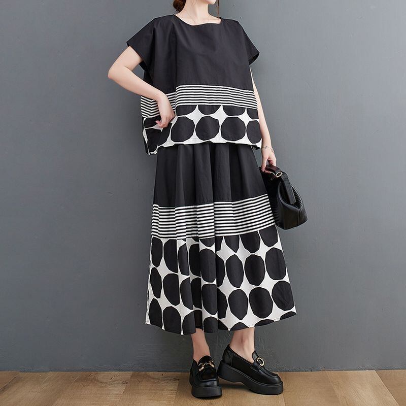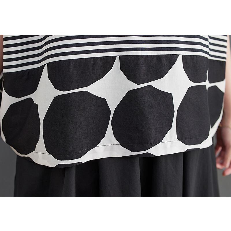 大胆なモノトーンのドット柄とストライプ柄の切り替えが、スタイリッシュな印象を与えます。