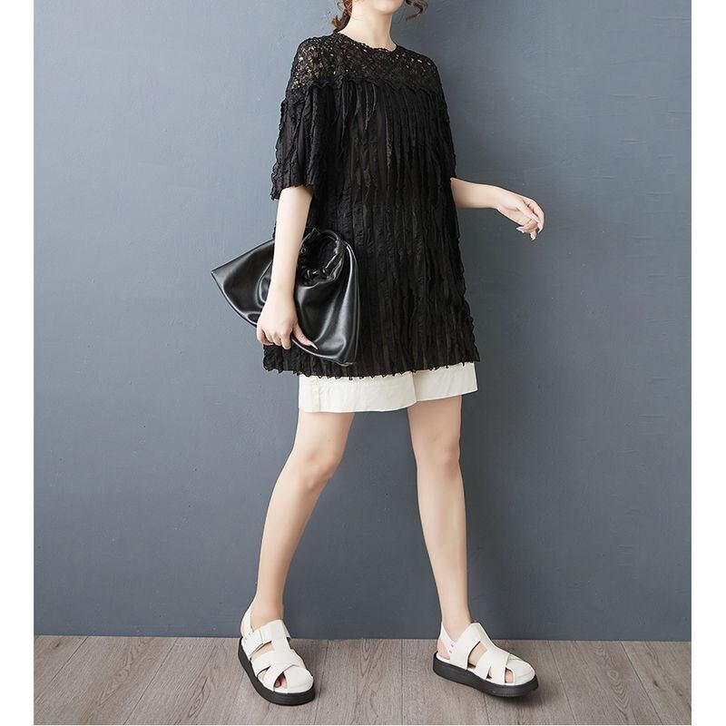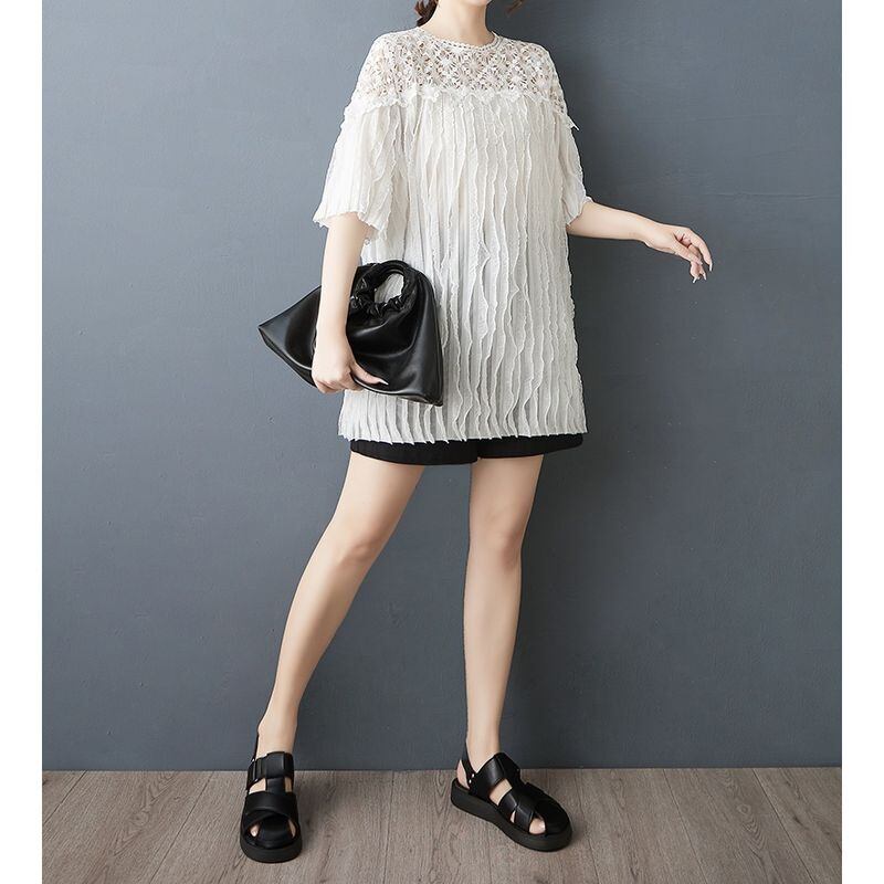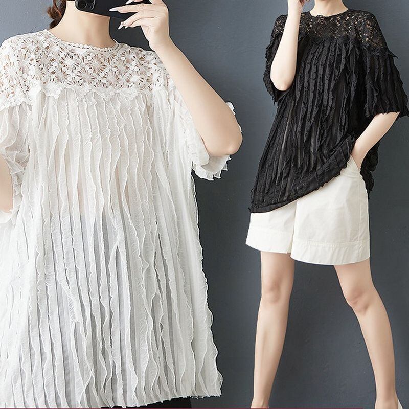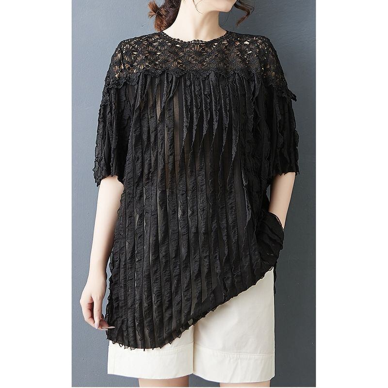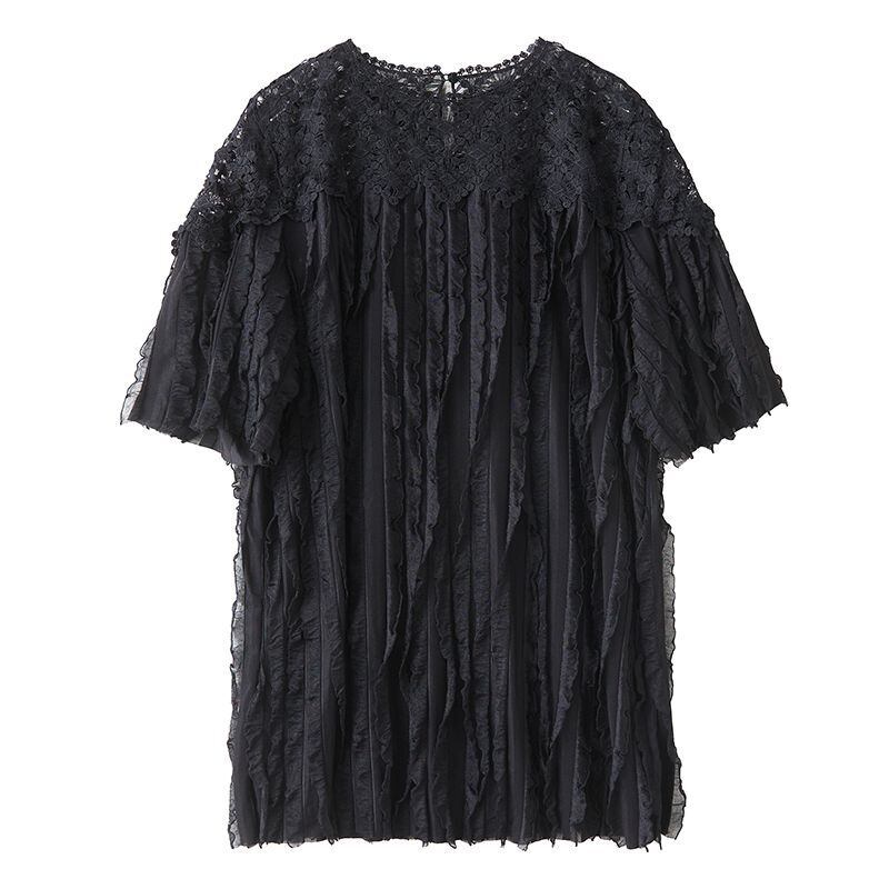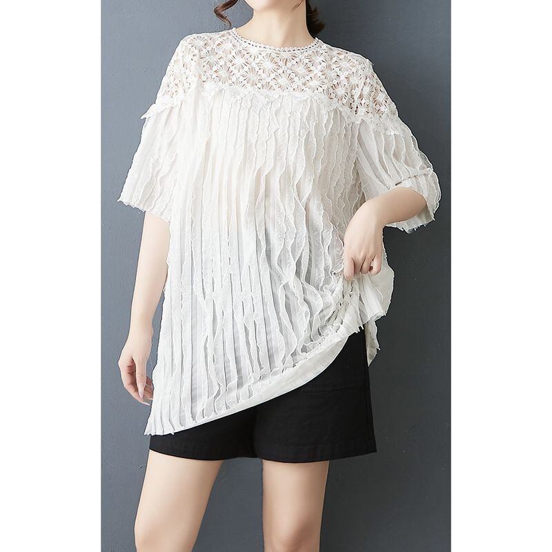 顔まわりをぱっと華やかに見せる、繊細なフラワーレースが印象的なチュニック。