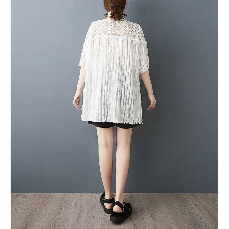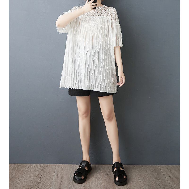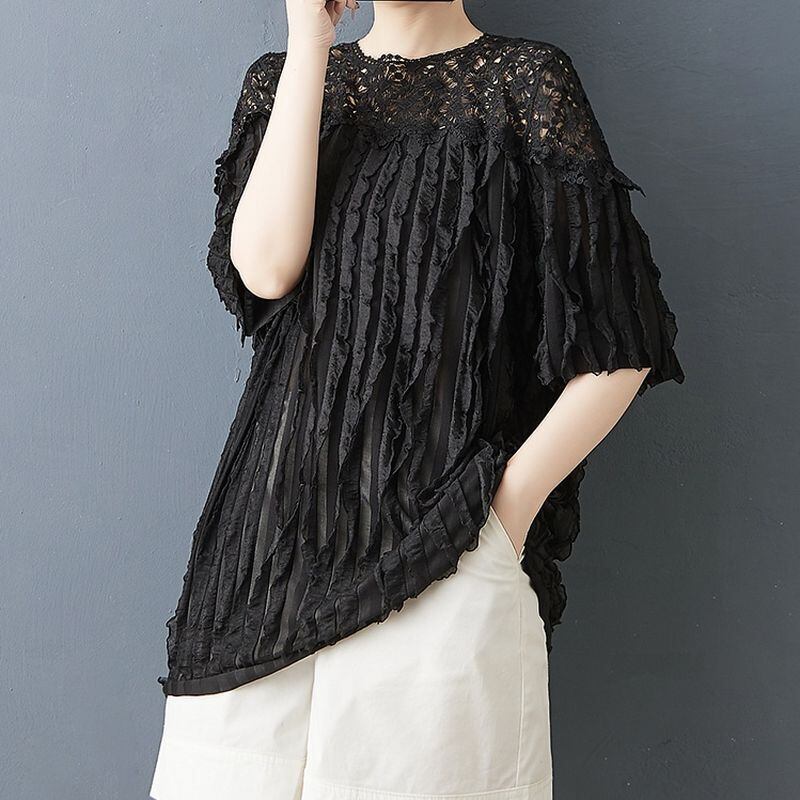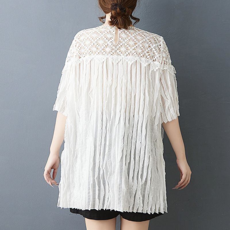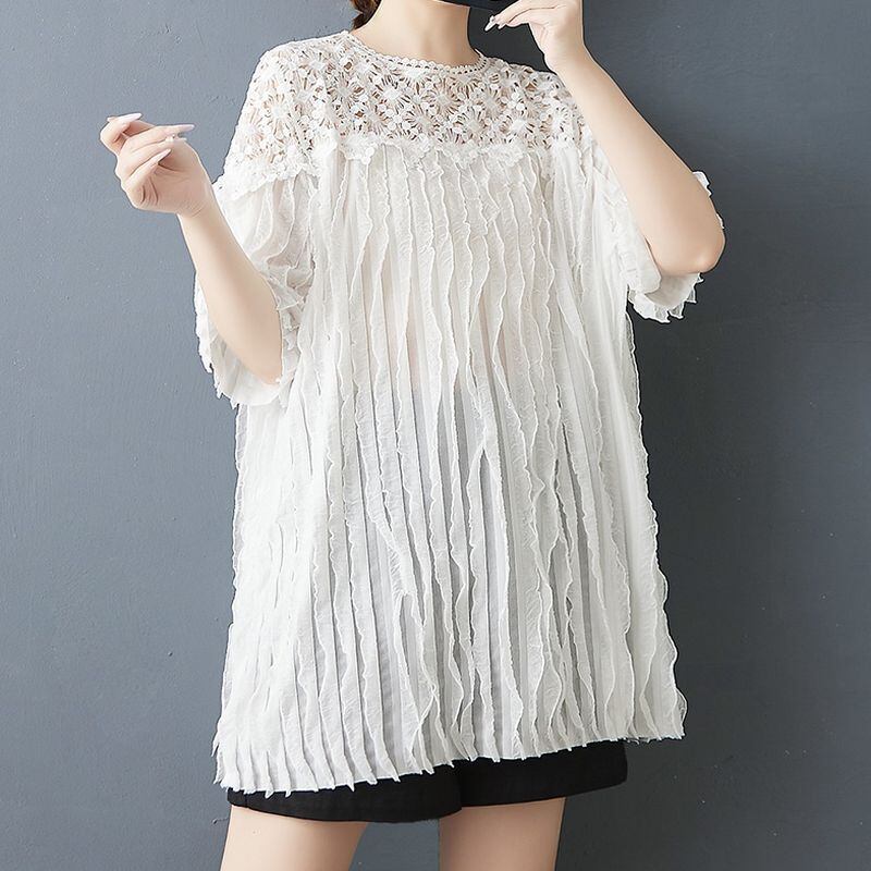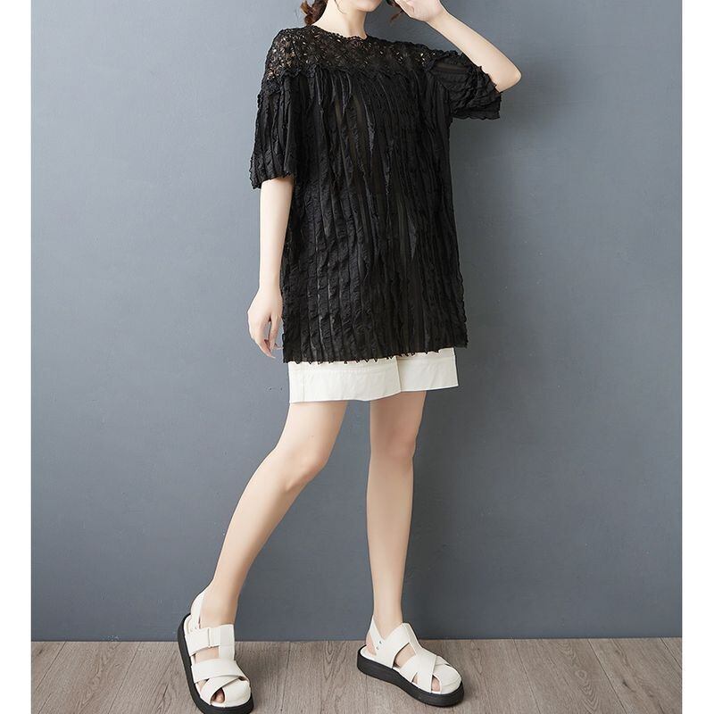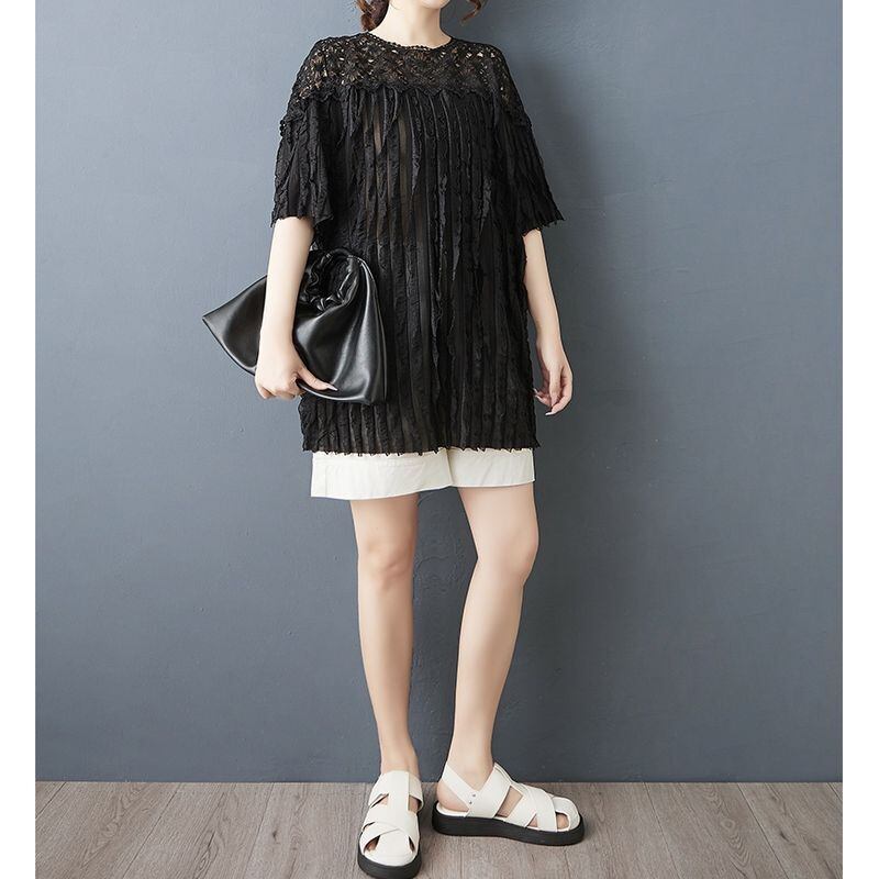 顔まわりをぱっと華やかに見せる、繊細なフラワーレースが印象的なチュニック。