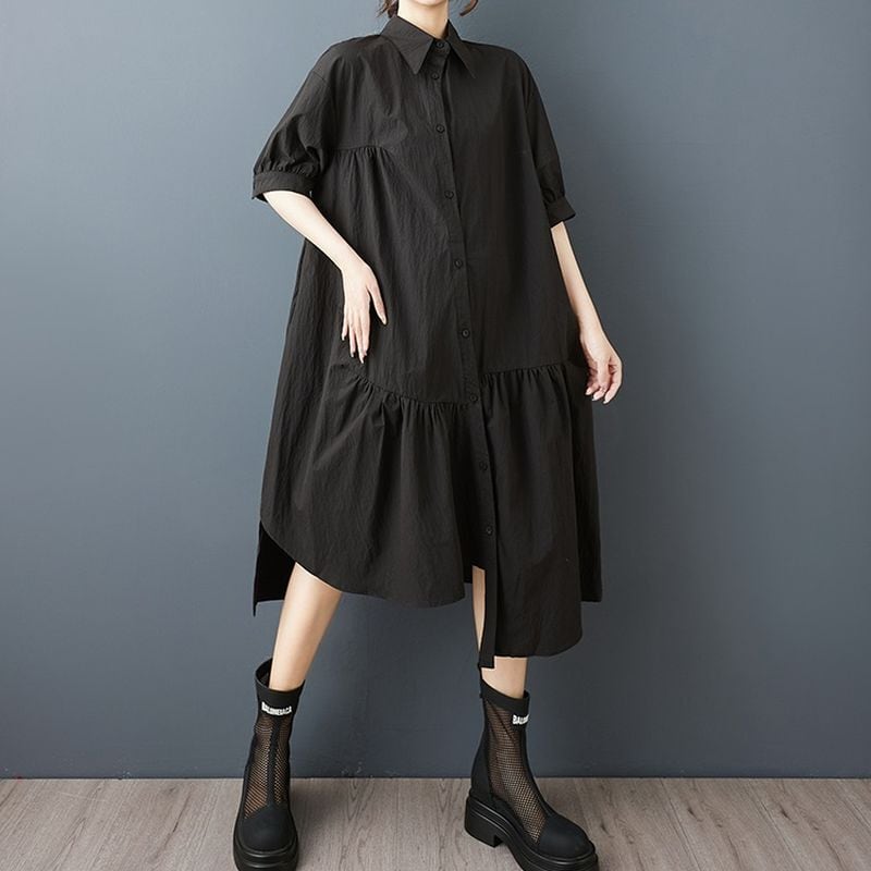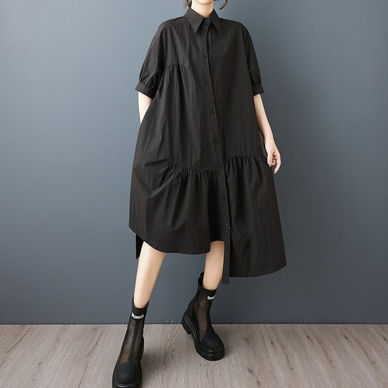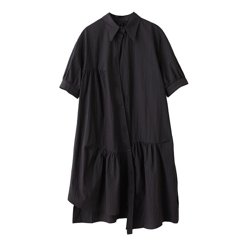 アシンメトリーなヘムラインとフレアシルエットが動きに表情を添え、女性らしさを引き立てます。