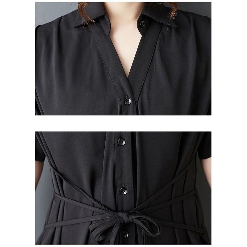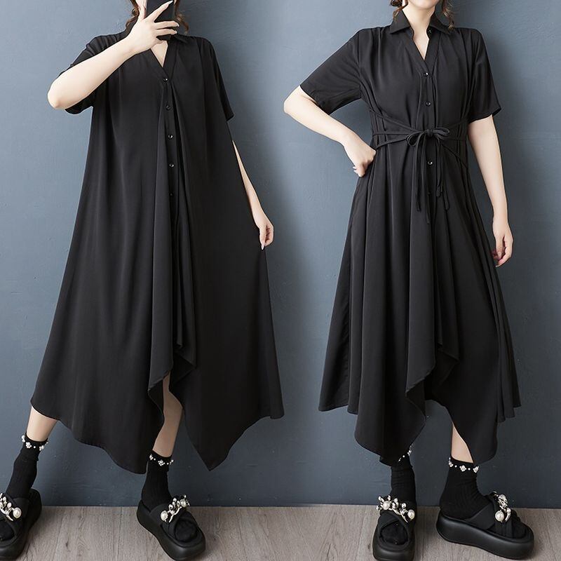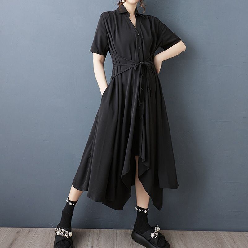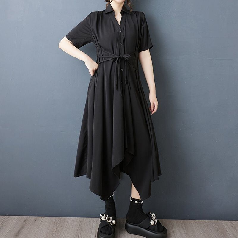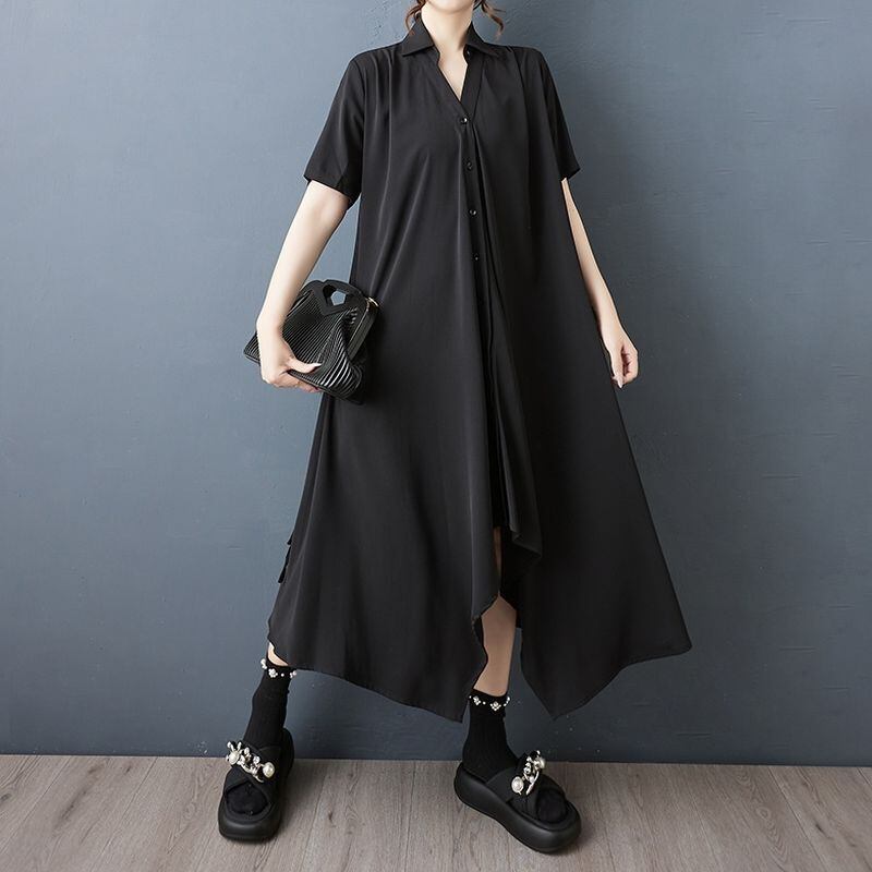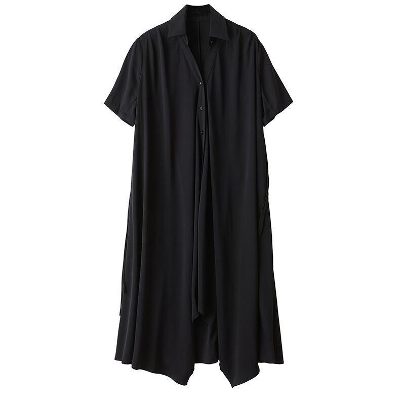 シャープなVネックラインと、不規則なヘムが印象的なオーバーサイズシャツドレス。