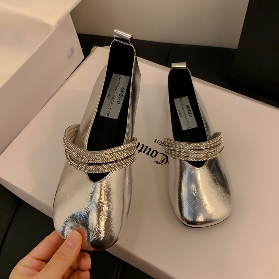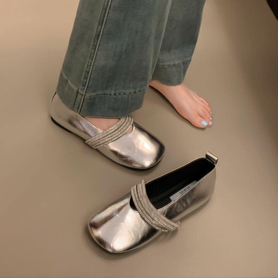 繊細なラインストラップが、足元にアートな表情を添える一足。