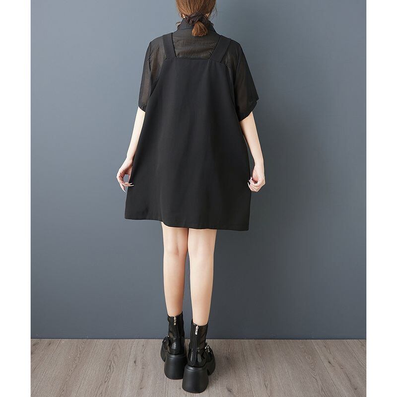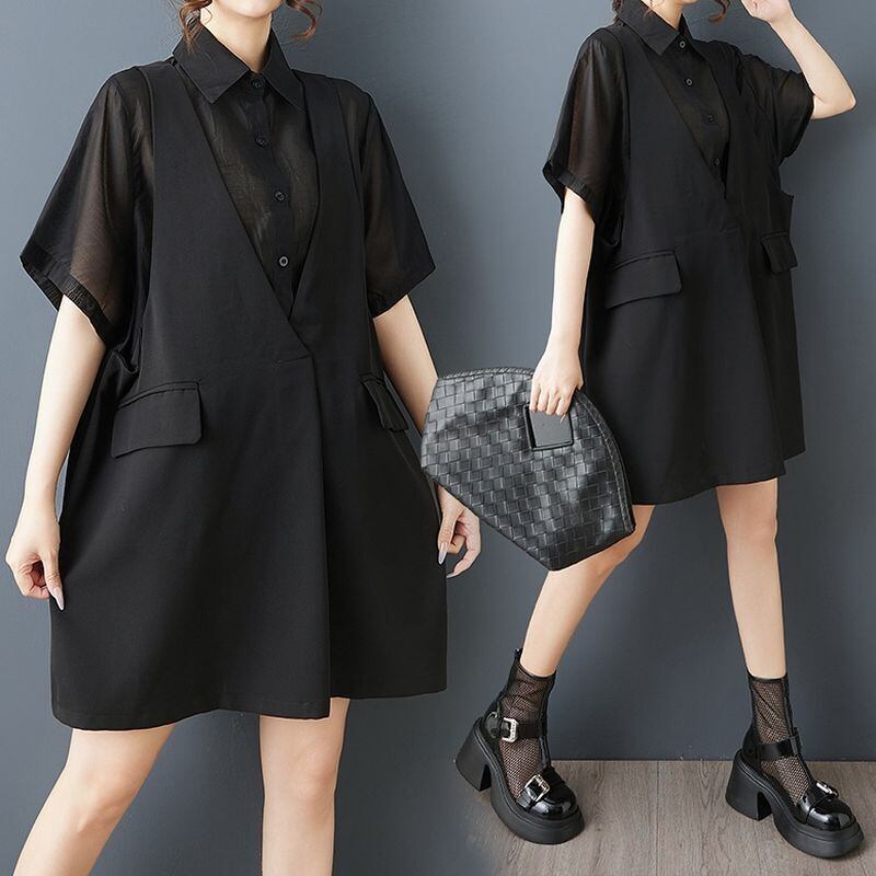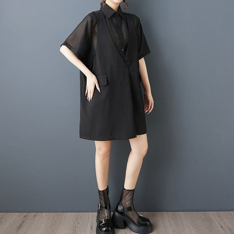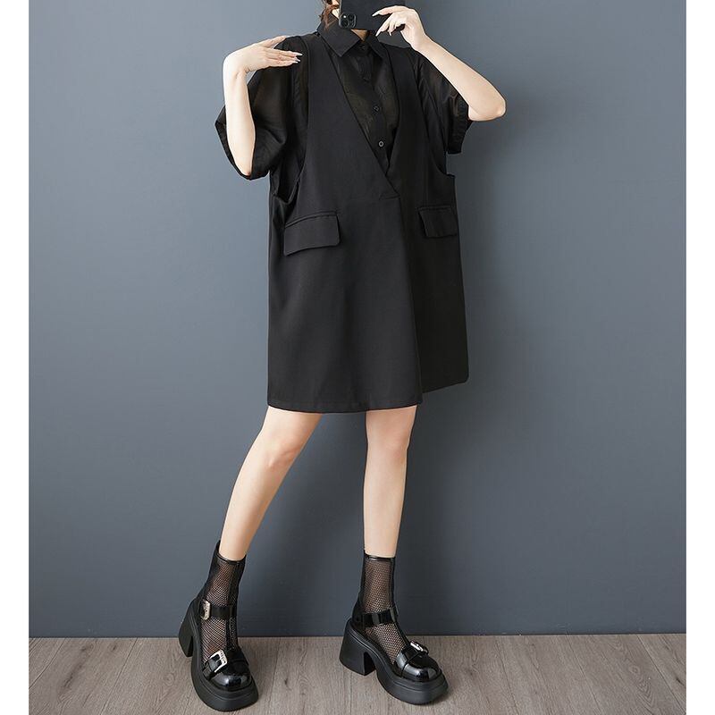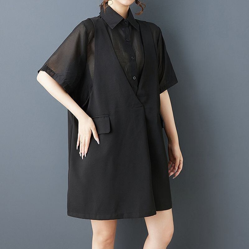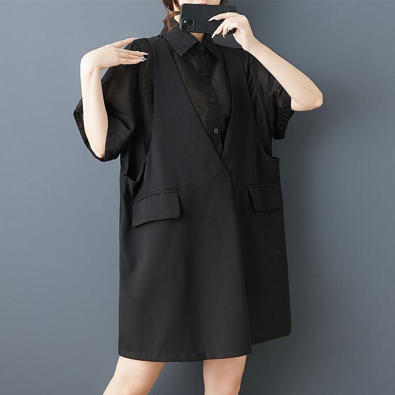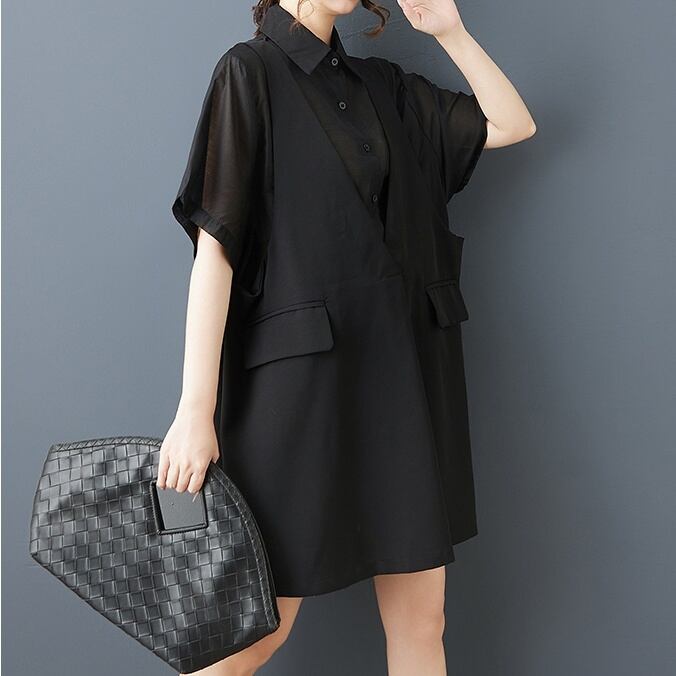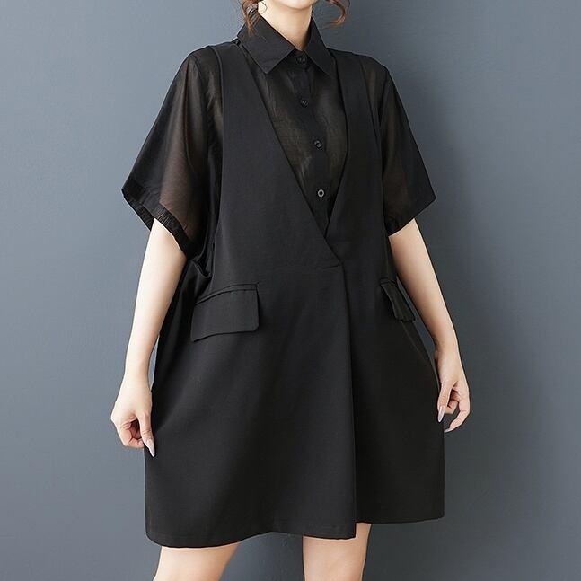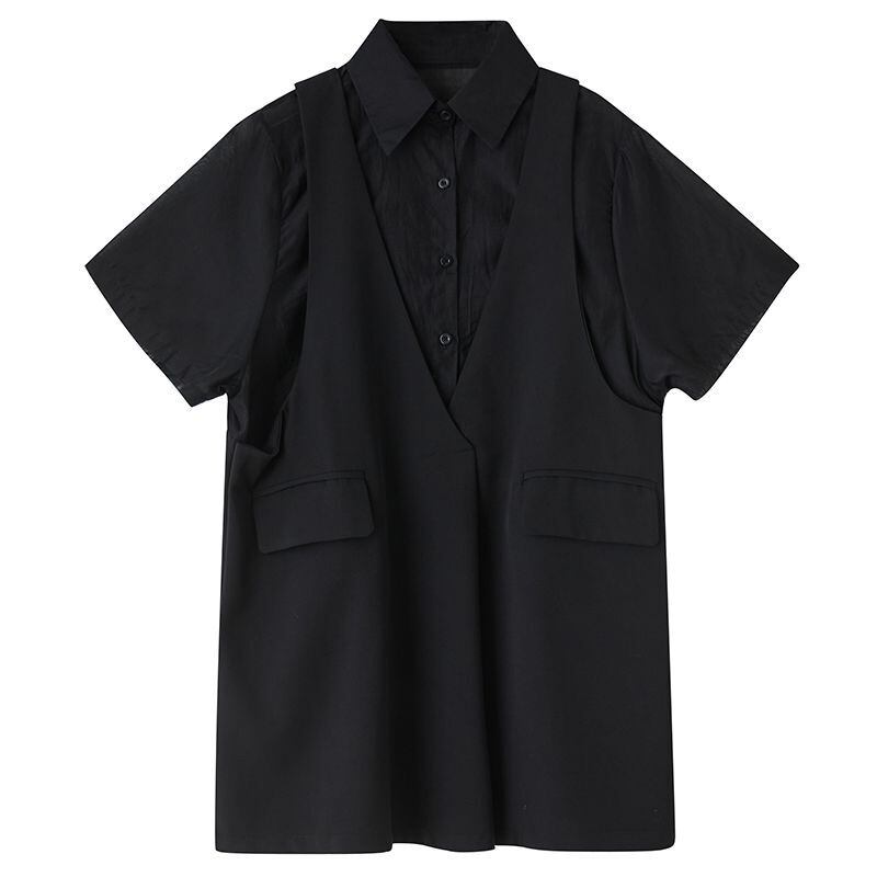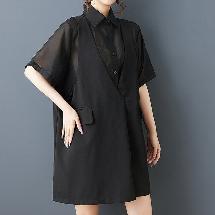 ベストを重ねたように見えるフェイクレイヤードデザインが印象的なオーバーサイズシャツ。