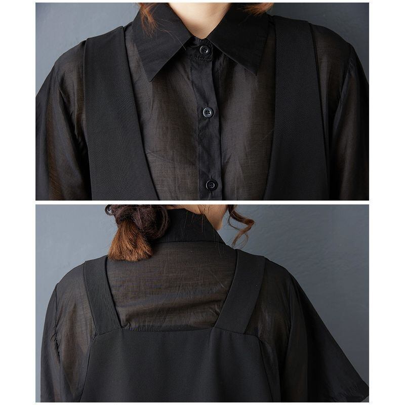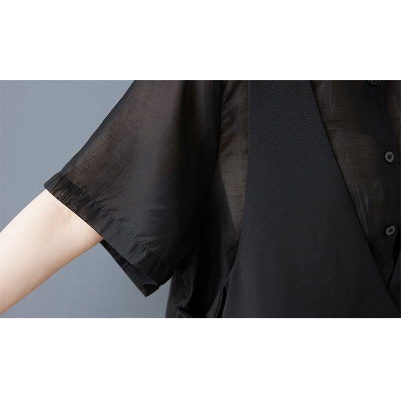 透け感のあるシアーシャツに、マットな質感のVネックベストを組み合わせたようなデザインは、シンプルながら奥行きのある佇まい。