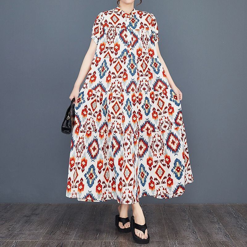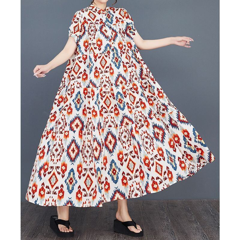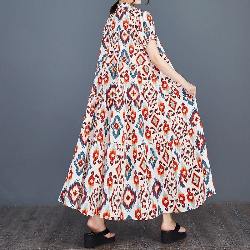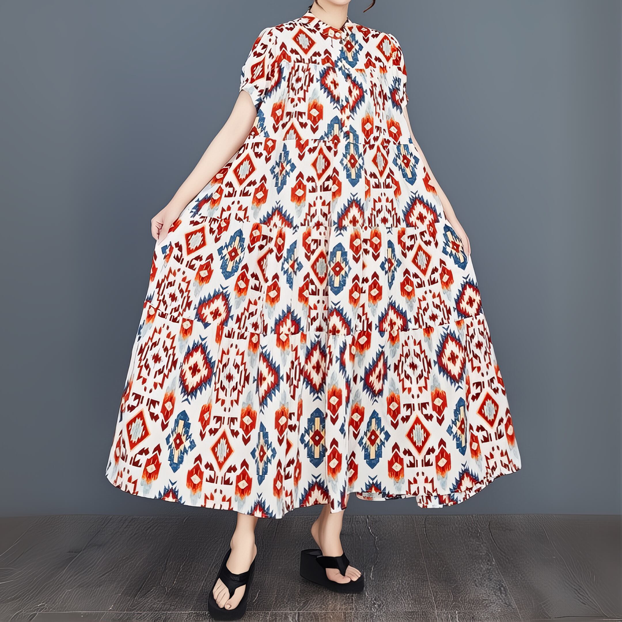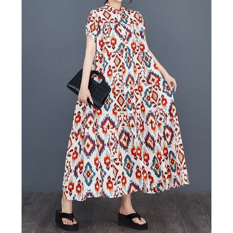 幾何学的な模様が目を引く、ティアードロングワンピース。