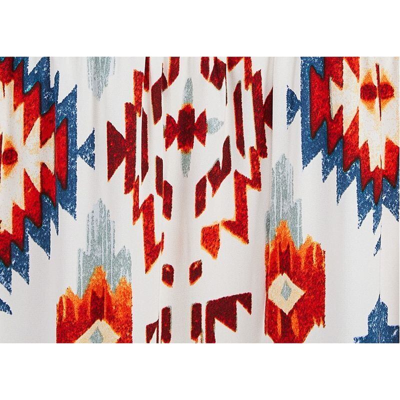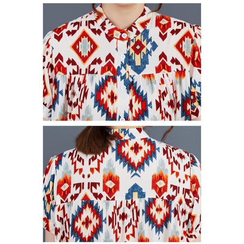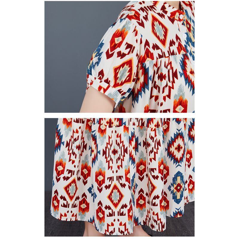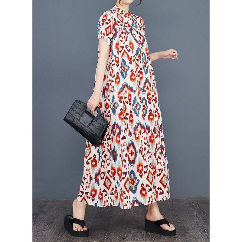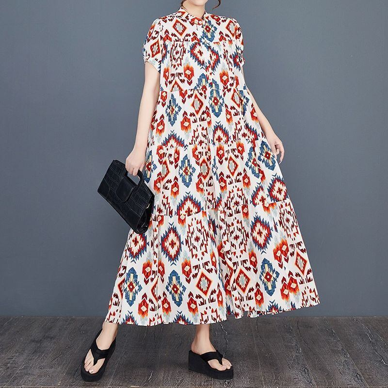 幾何学的な模様が目を引く、ティアードロングワンピース。