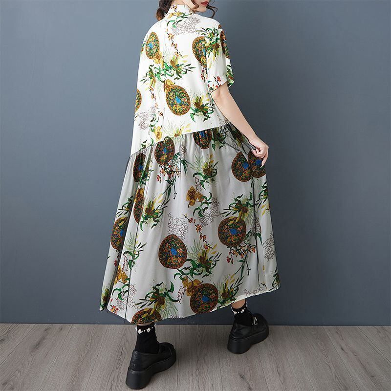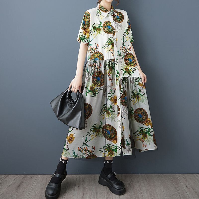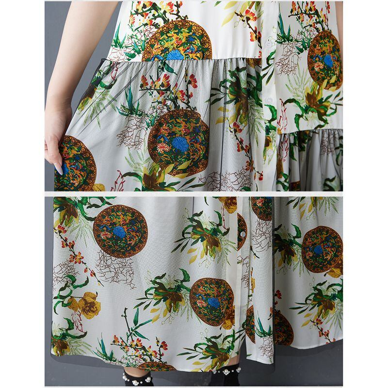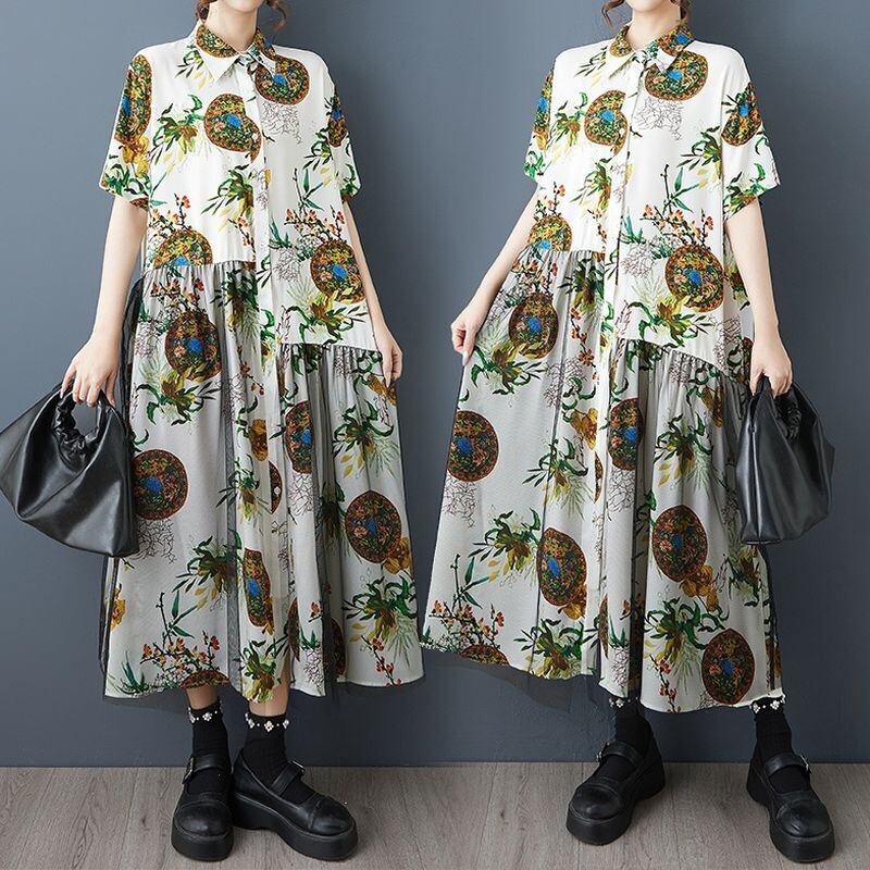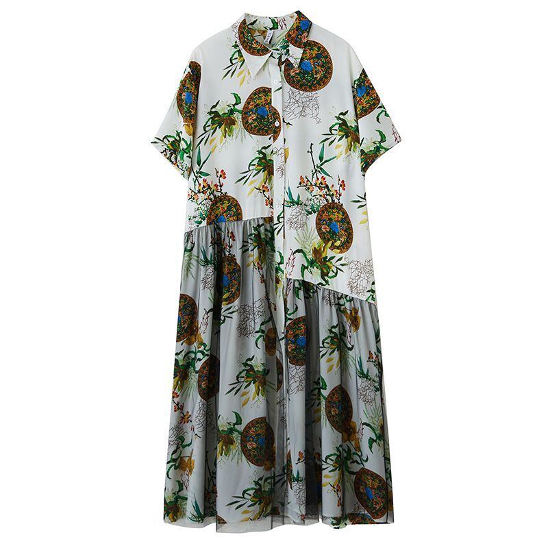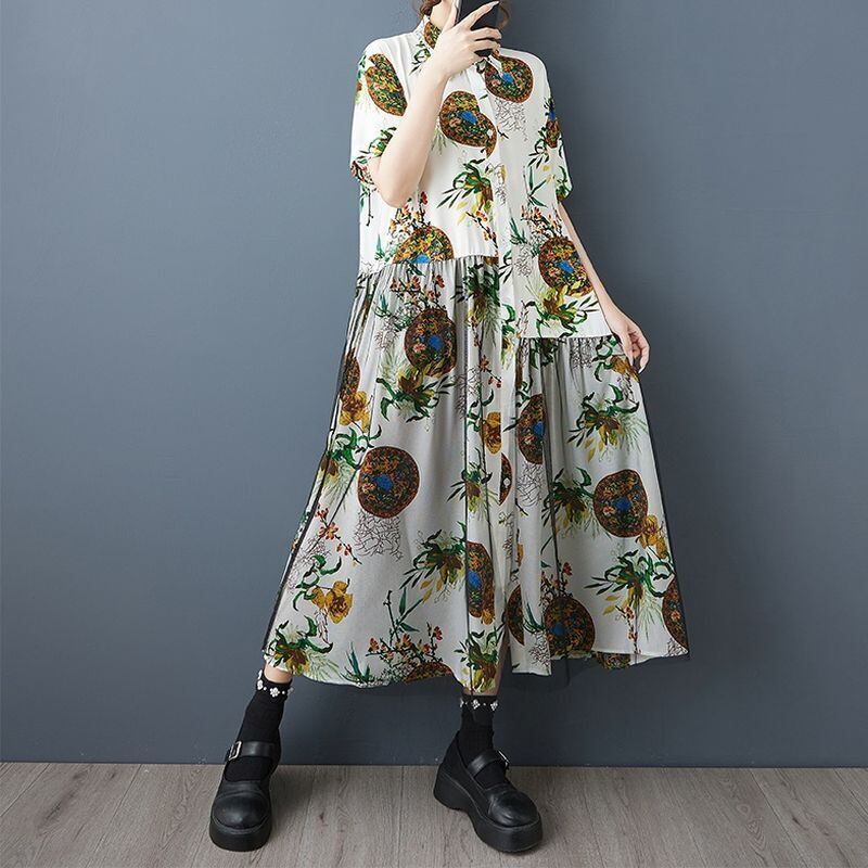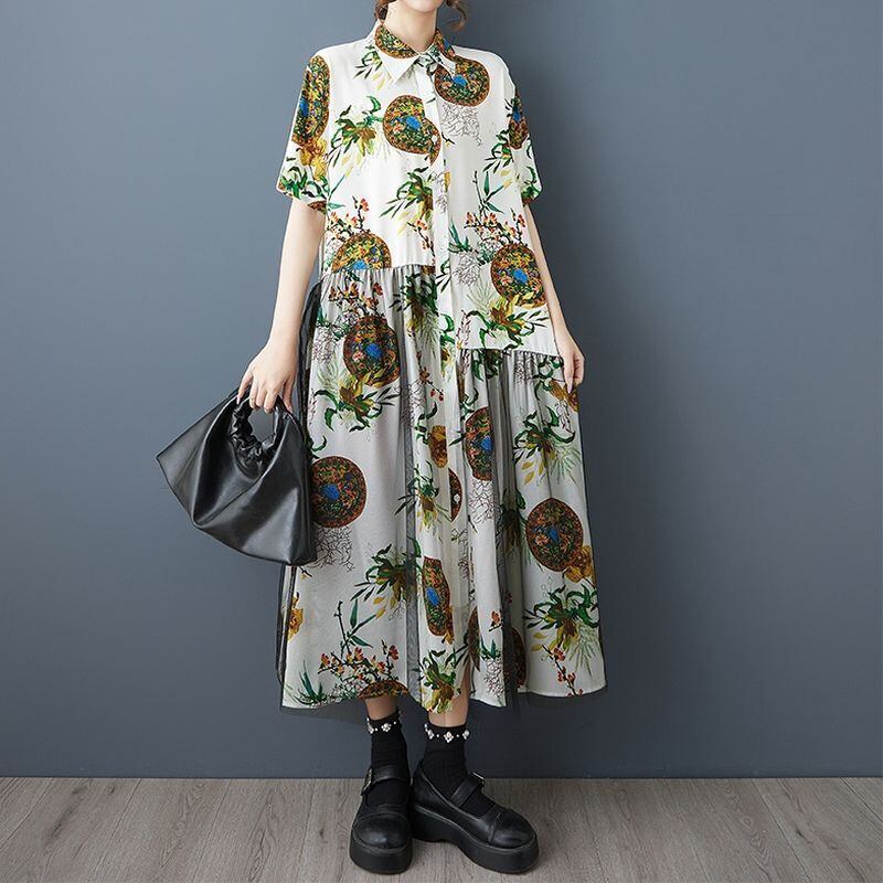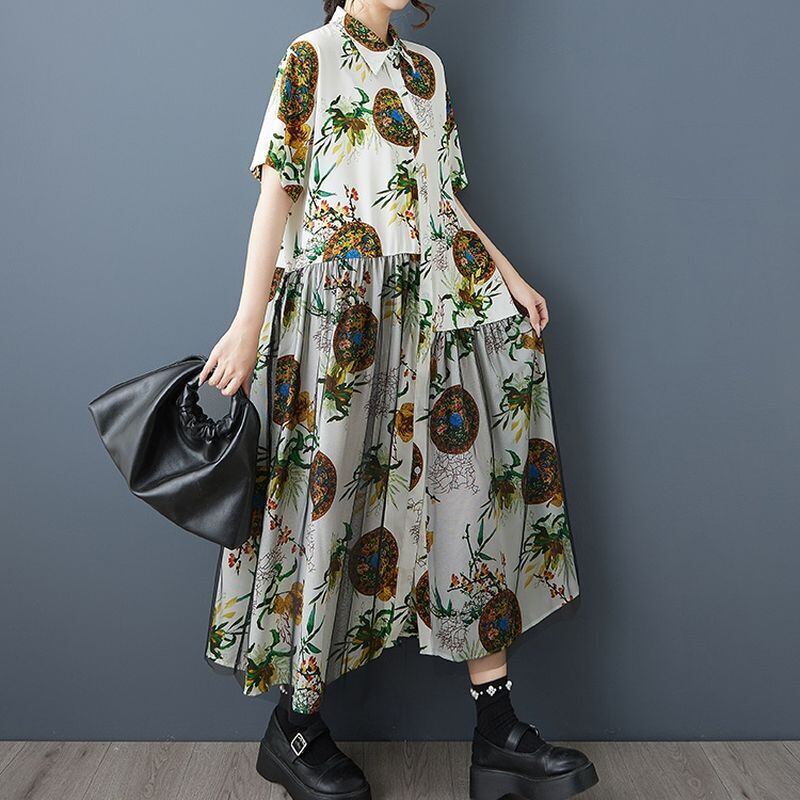 エスニックなプリントに、チュールの重なりが個性を添えるロングワンピース。