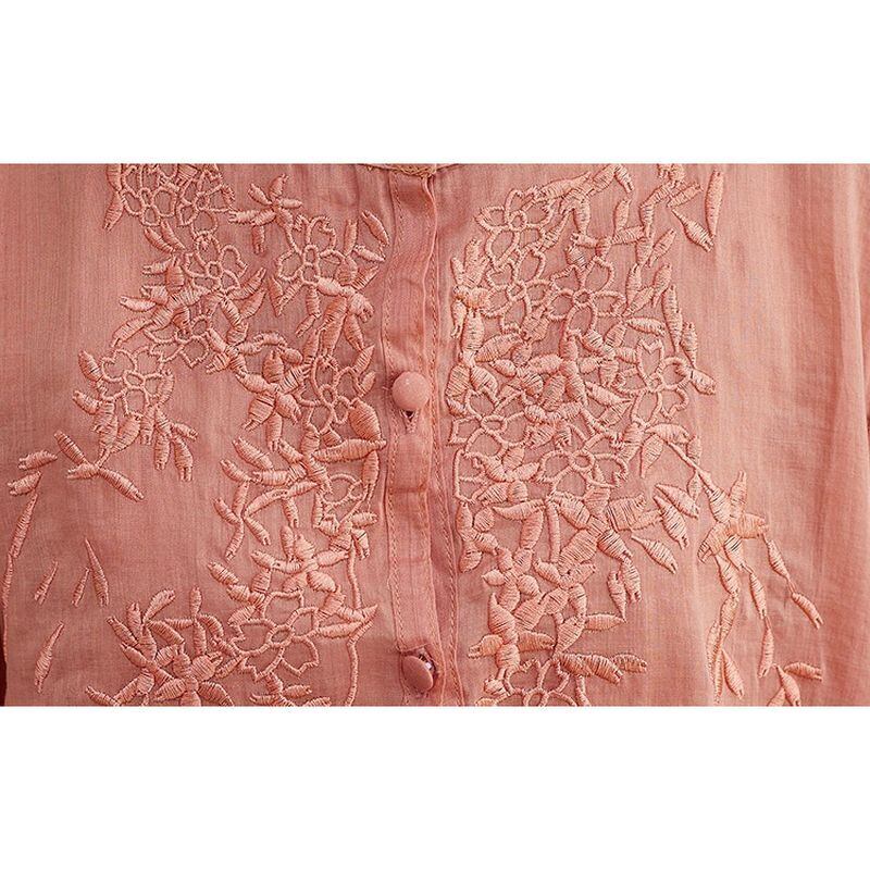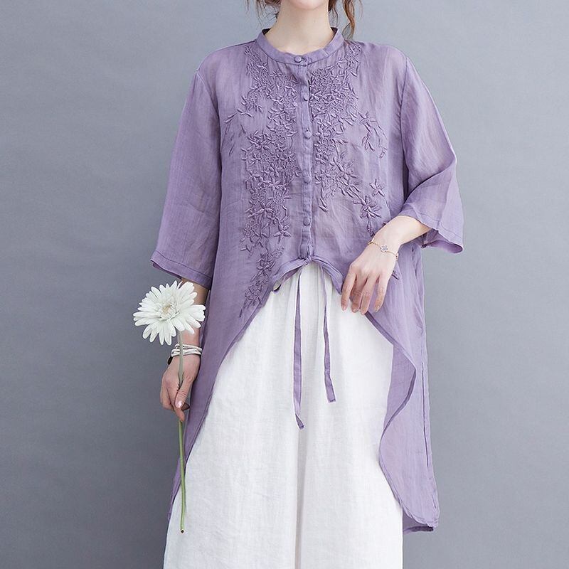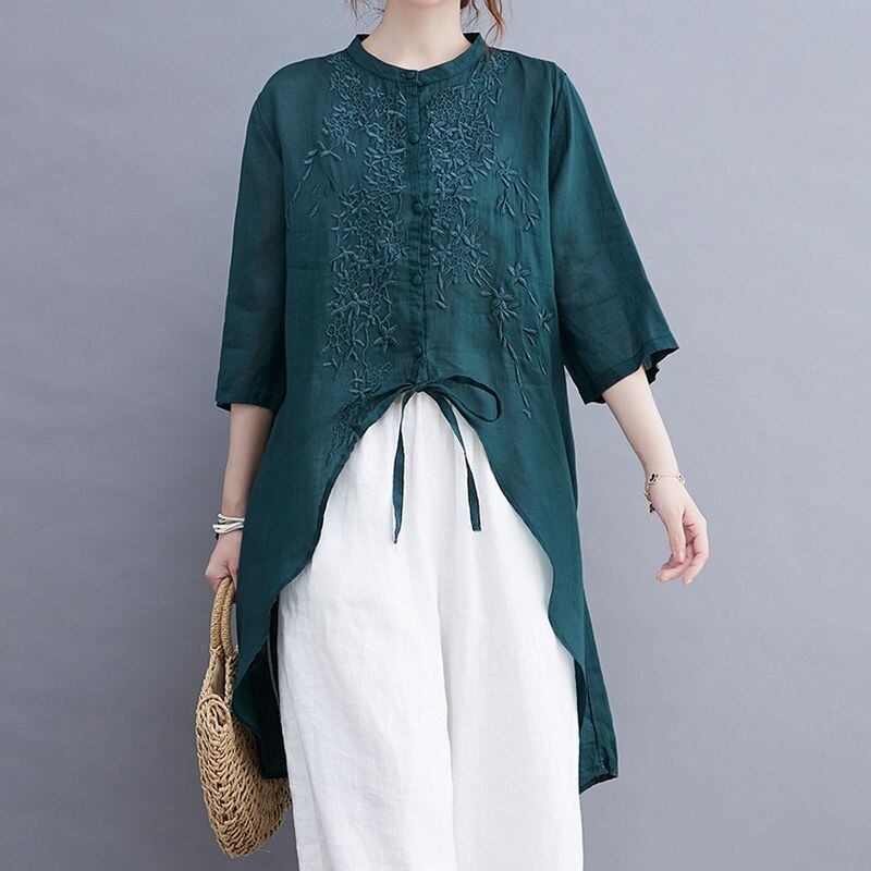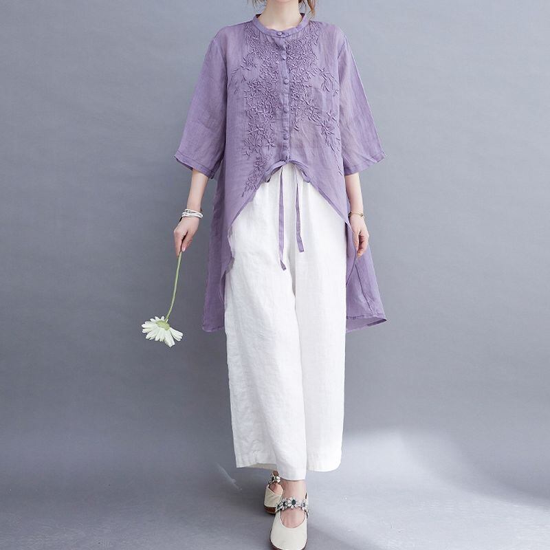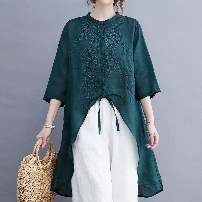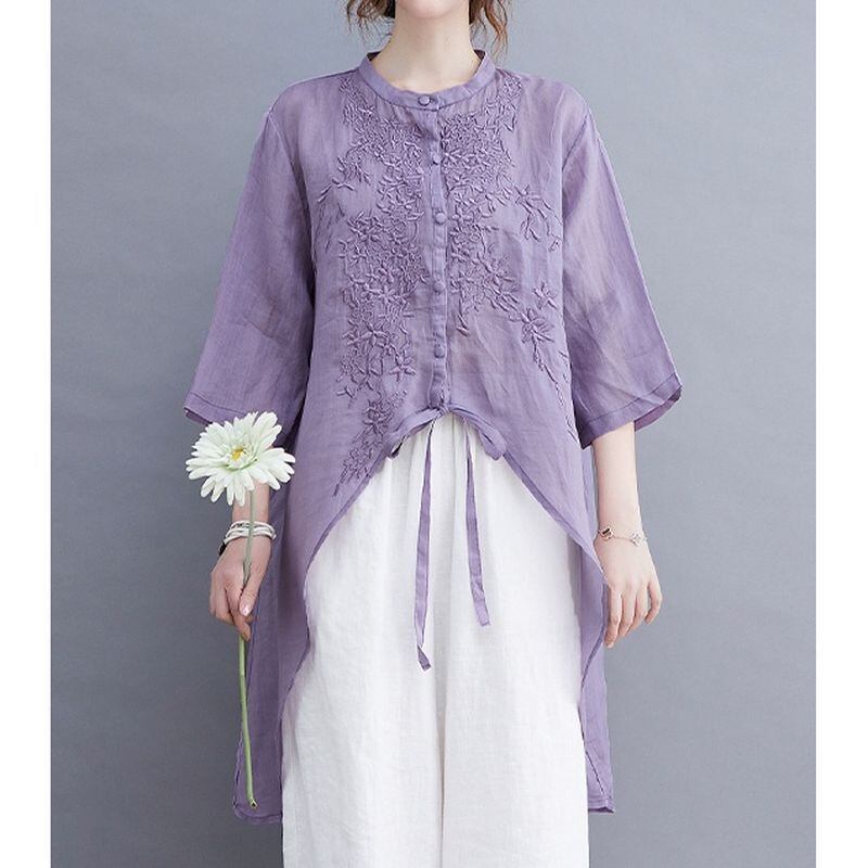 繊細な刺繍が胸元を彩る、上品なチュニックブラウス。