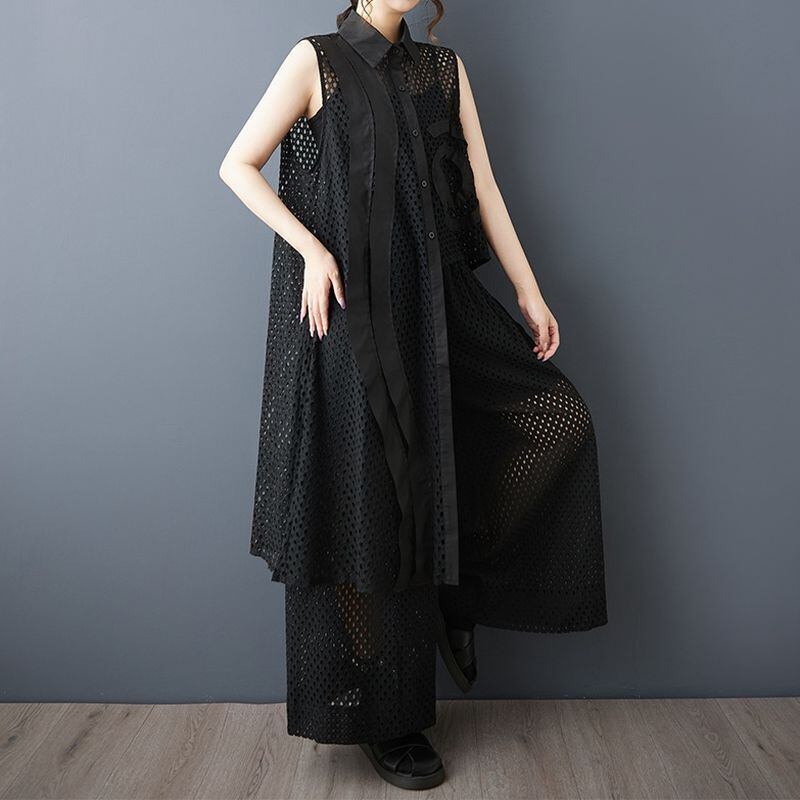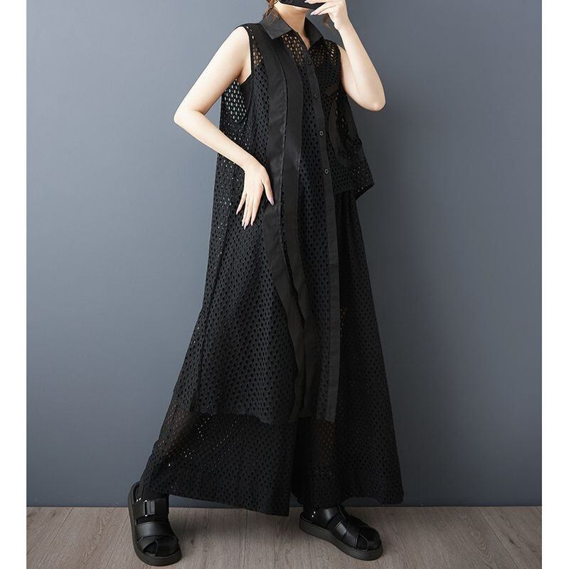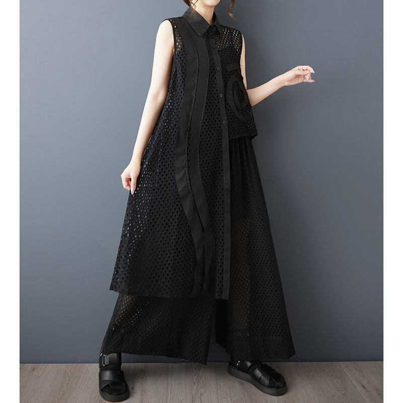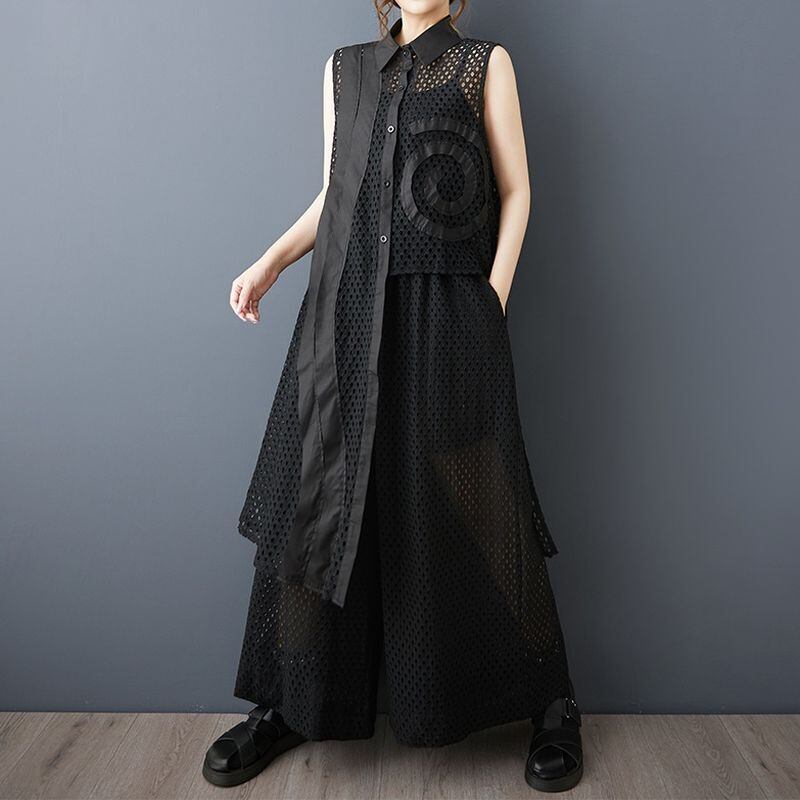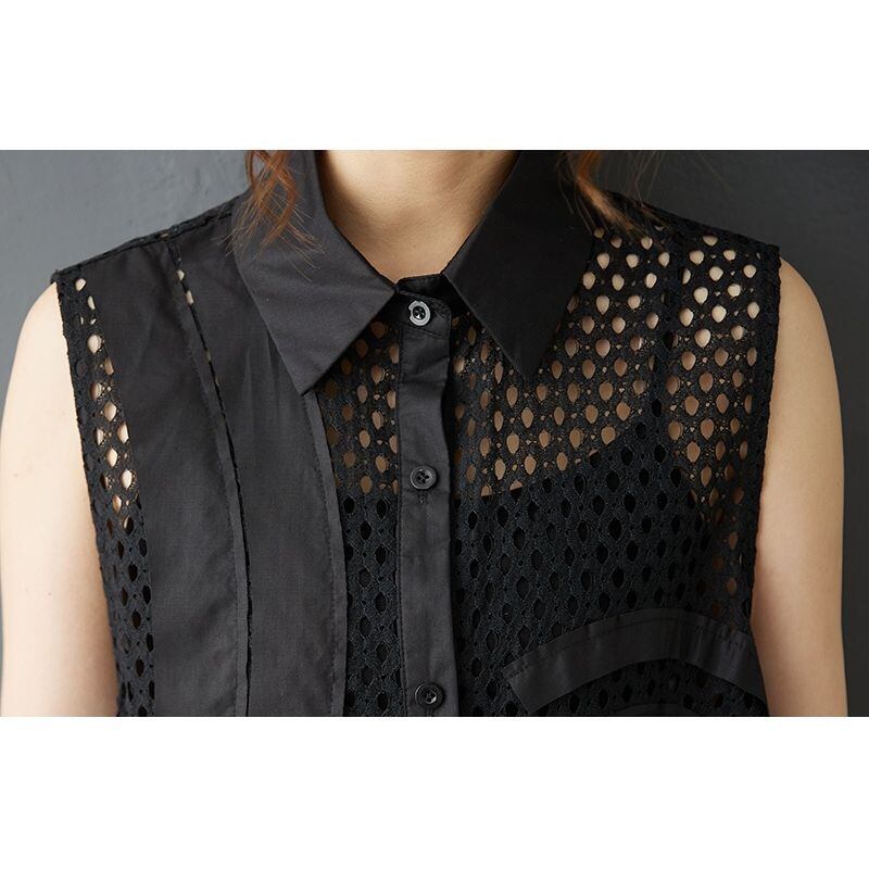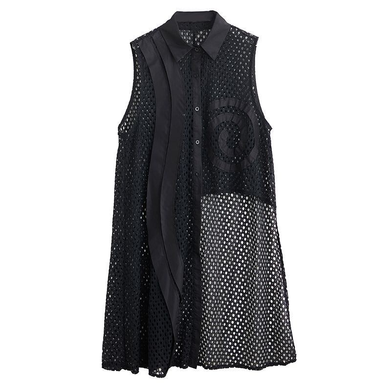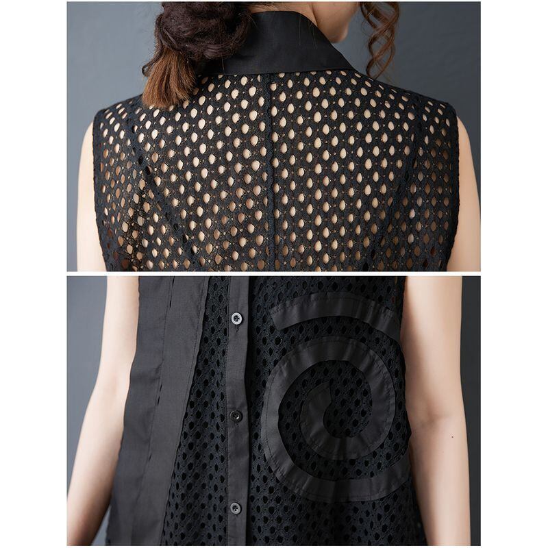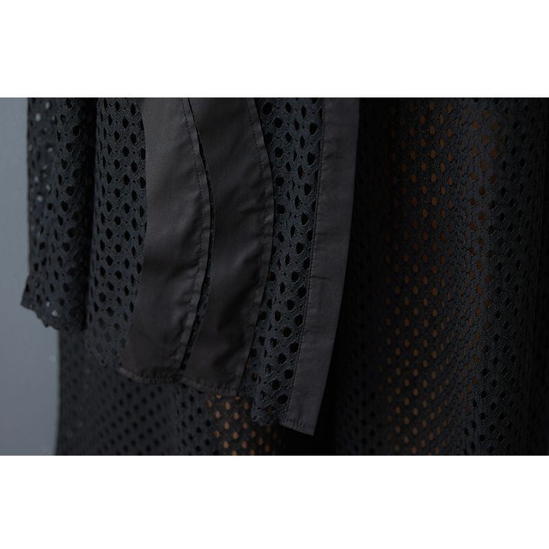 シースルーのメッシュに、左右非対称の装飾が映えるチュニックシャツ。
