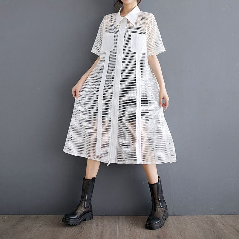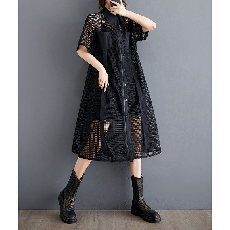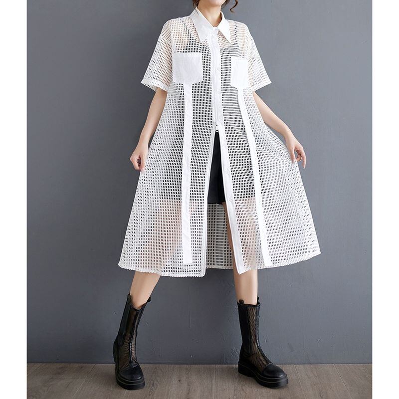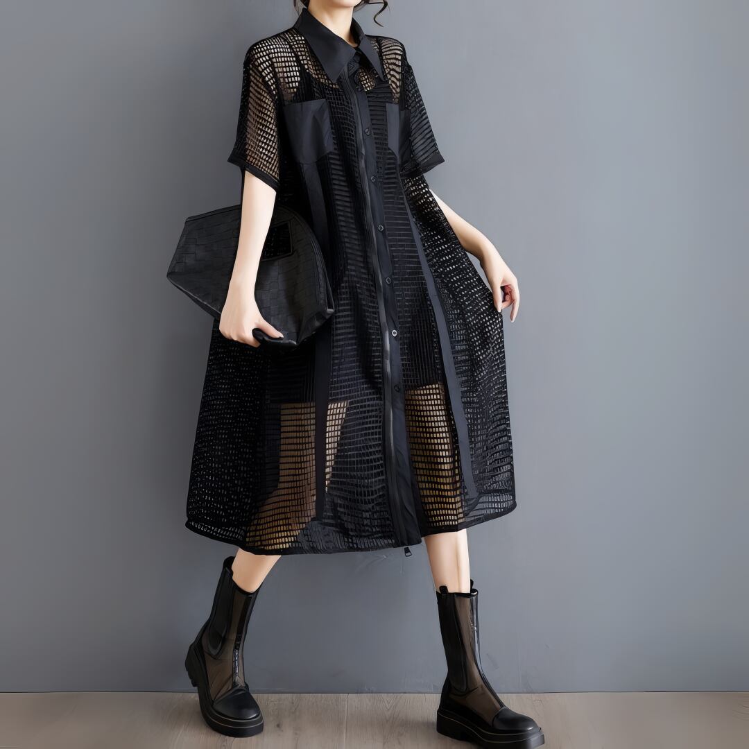 大胆な透け感とジップデザインが印象的なメッシュシャツワンピース。