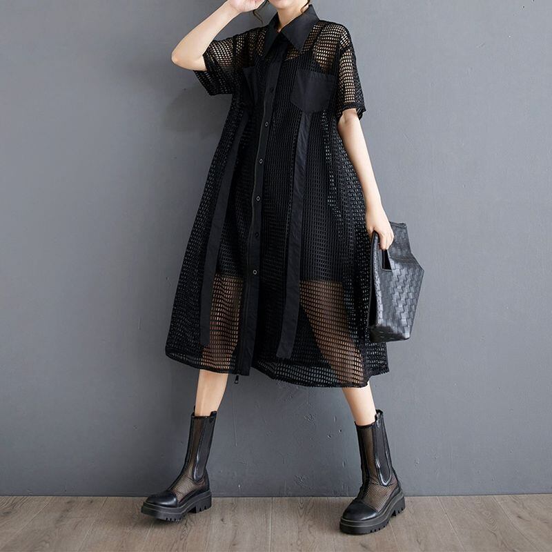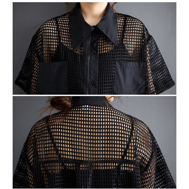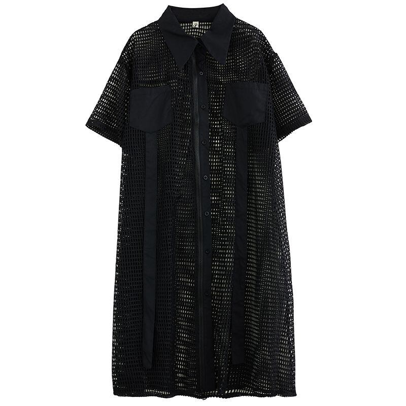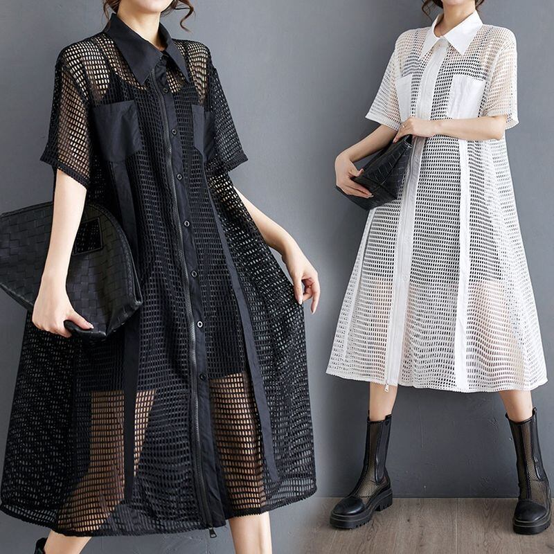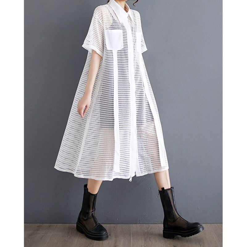 大胆な透け感とジップデザインが印象的なメッシュシャツワンピース。