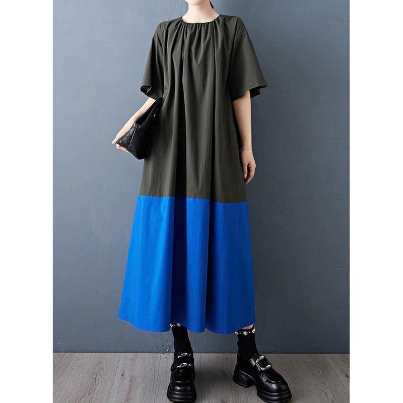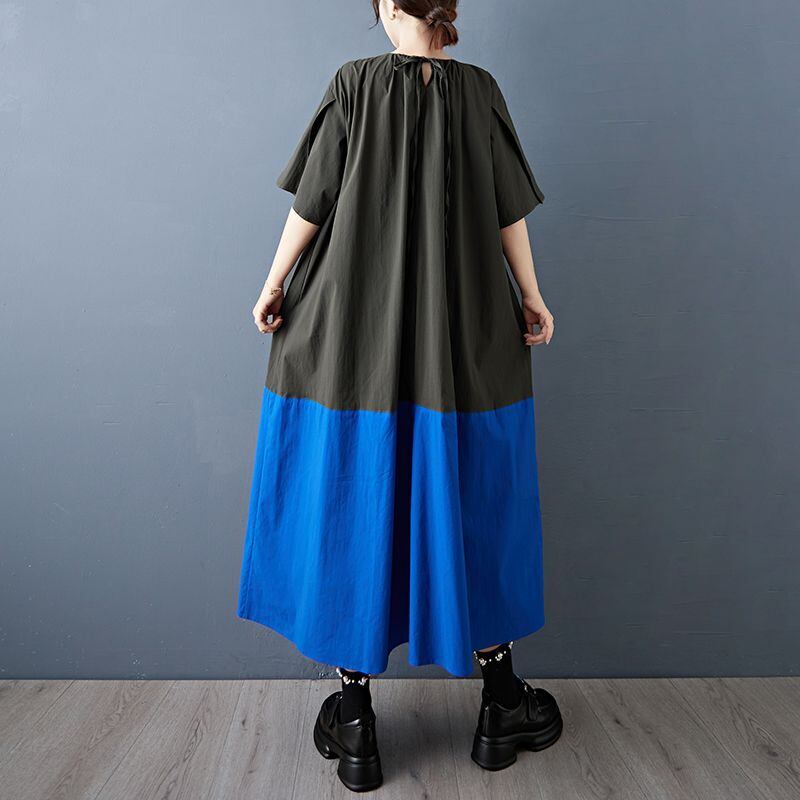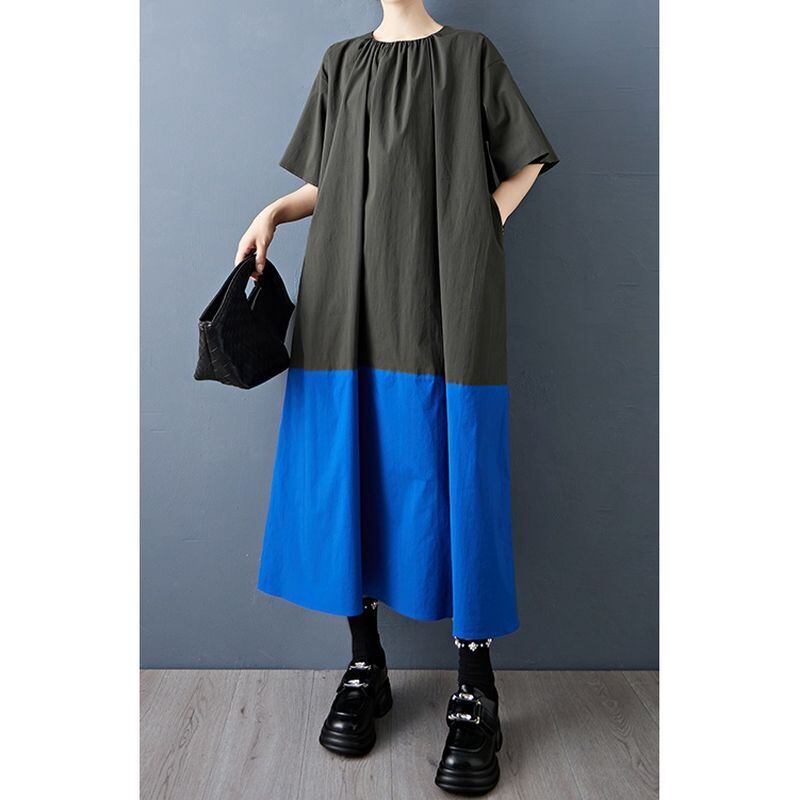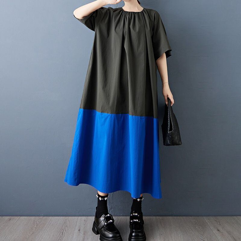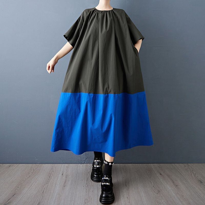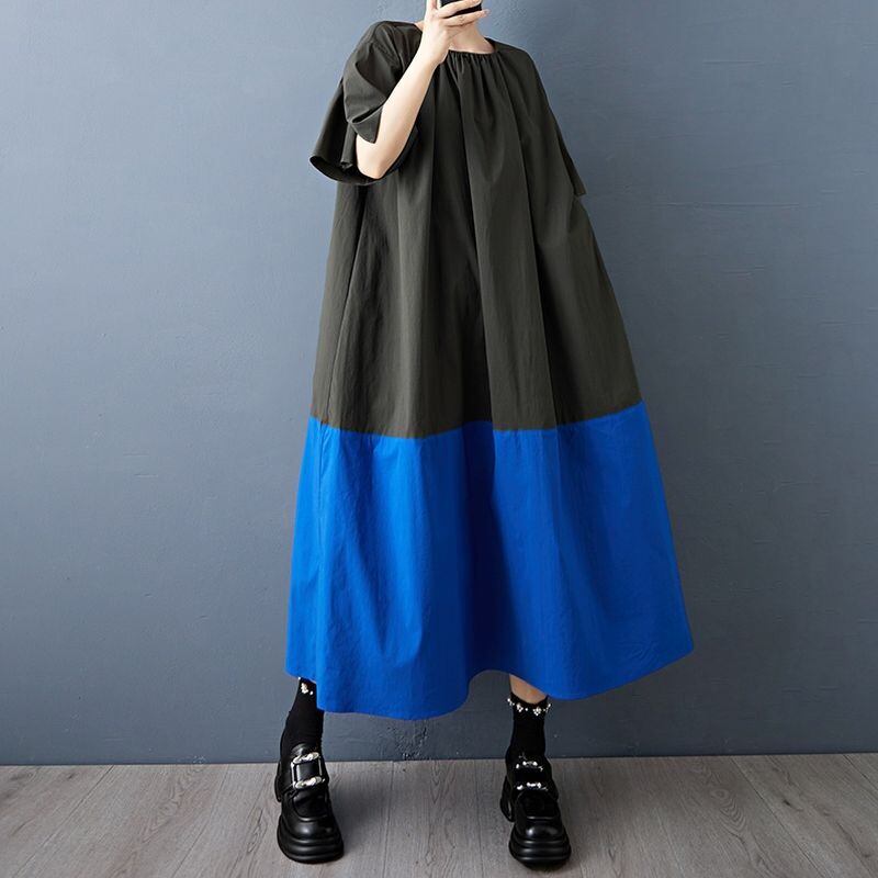大胆な配色切り替えが目を引く、ゆったりシルエットのロングワンピース。
