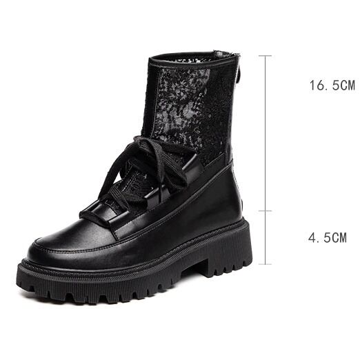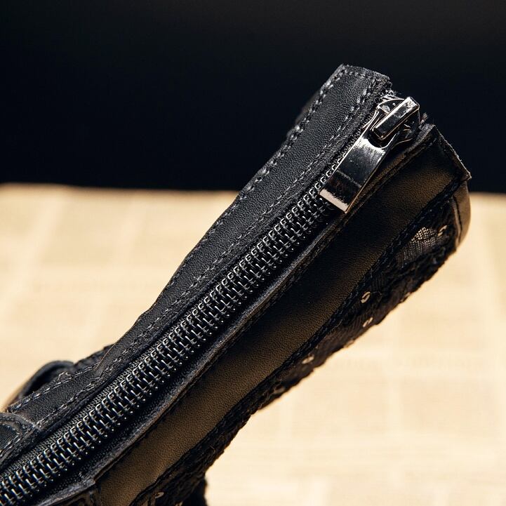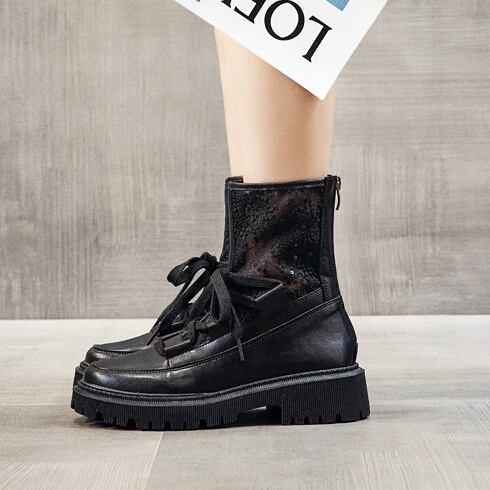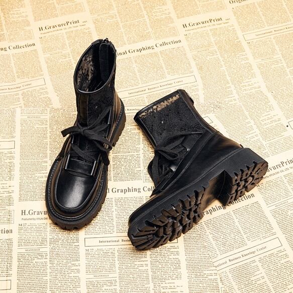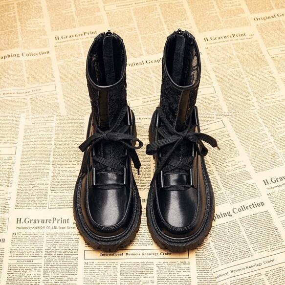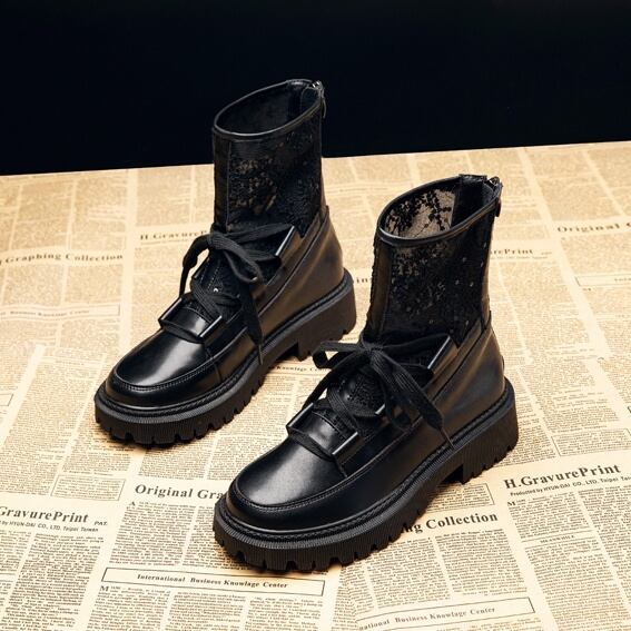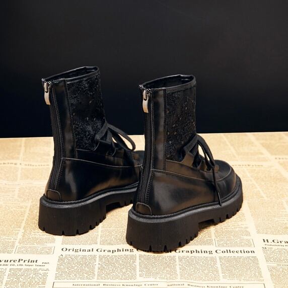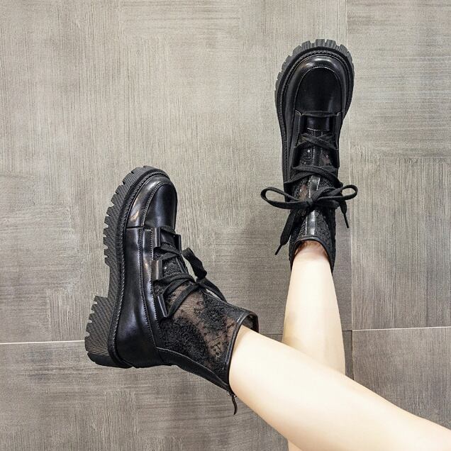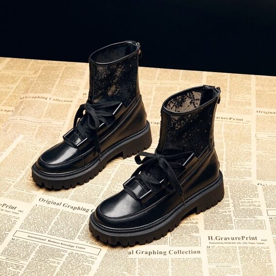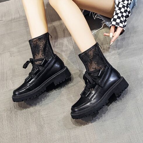 光沢感のあるレザー風素材と、透け感メッシュをあしらったミドル丈ブーツ。
