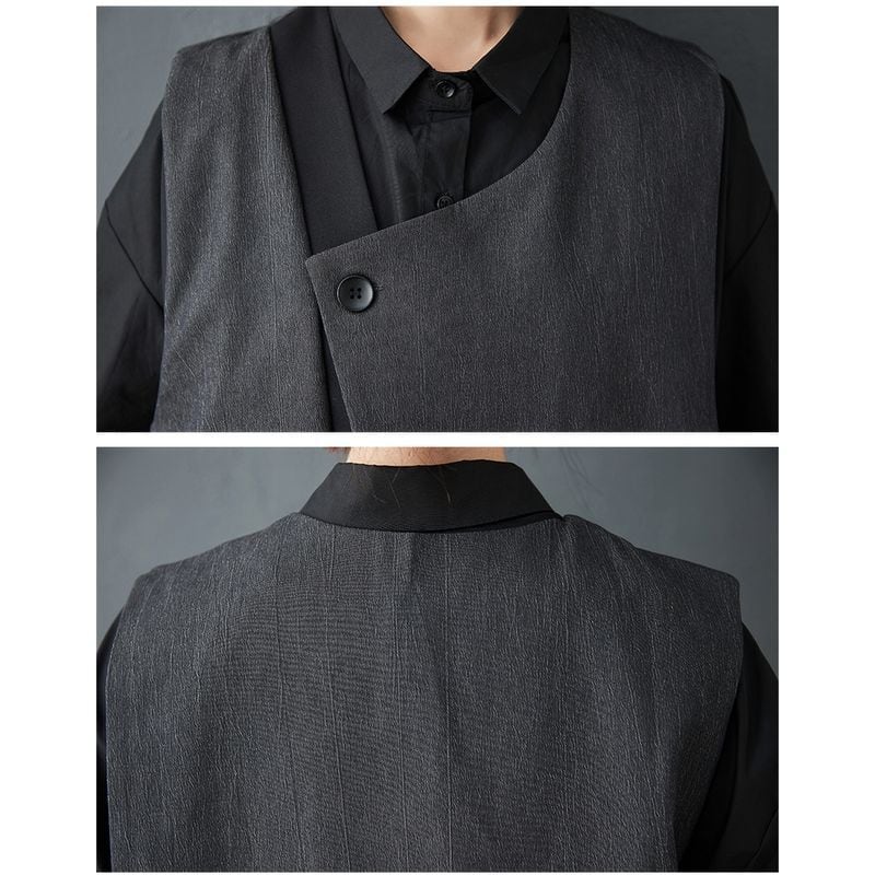 落ち着いたチャコールグレーが映える、アシンメトリーベスト。