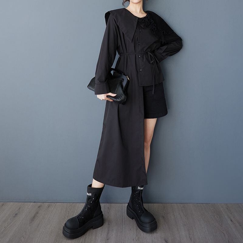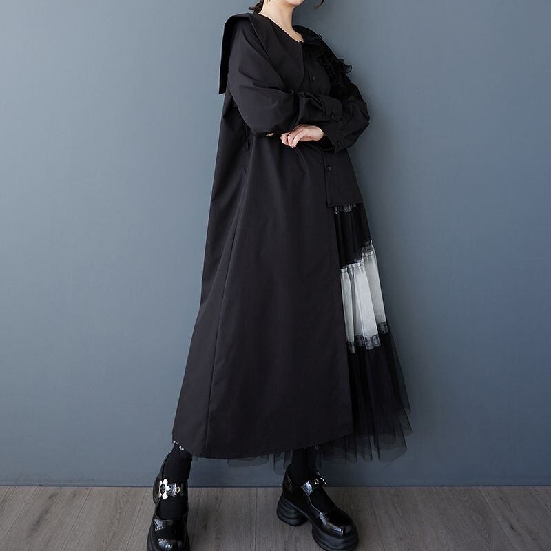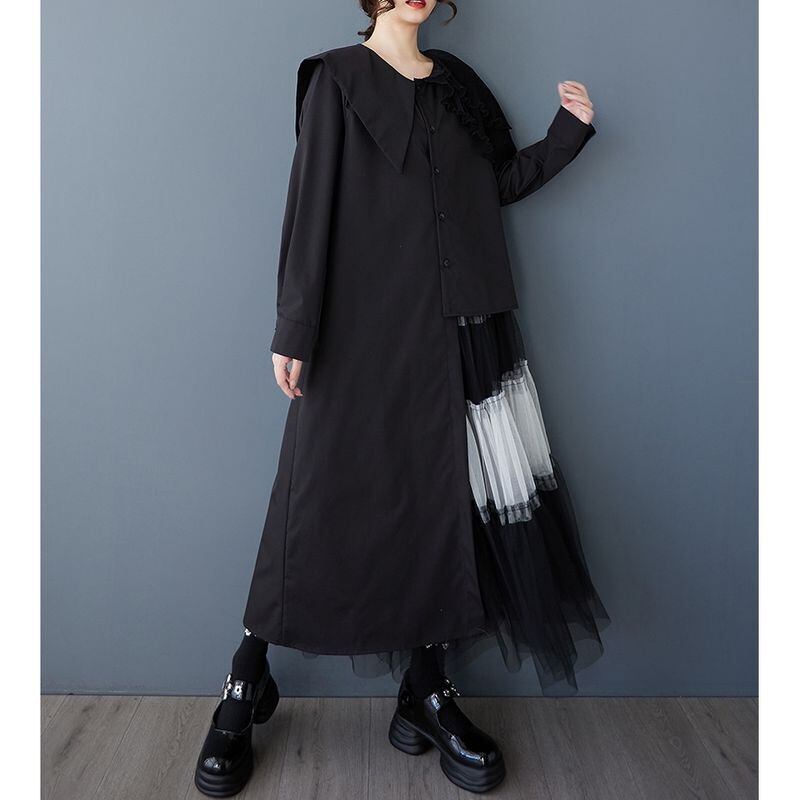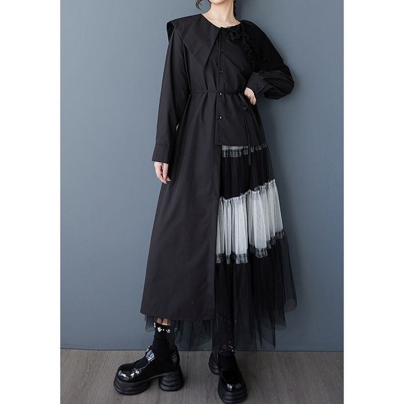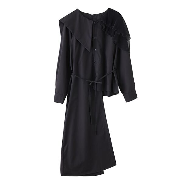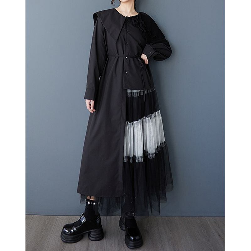 胸元のフリル風デザインや、ウエストのリボンで調整できるシルエットが、個性的な表情を演出します。