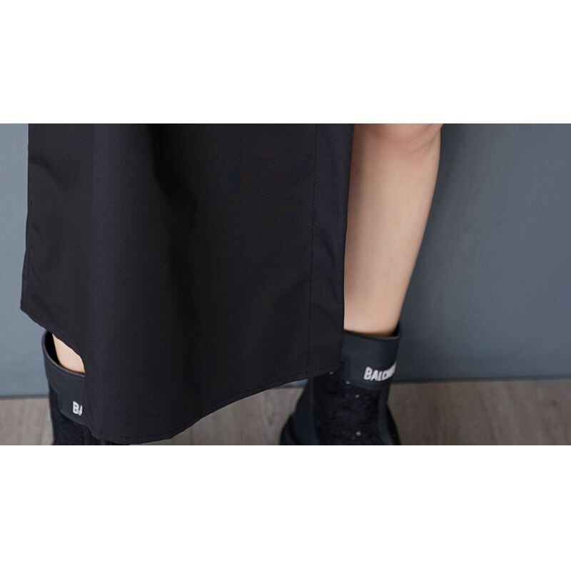 ユニークなビッグカラーとアシンメトリーなシルエットが目を引くブラックブラウス。