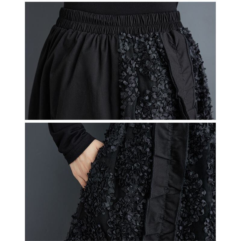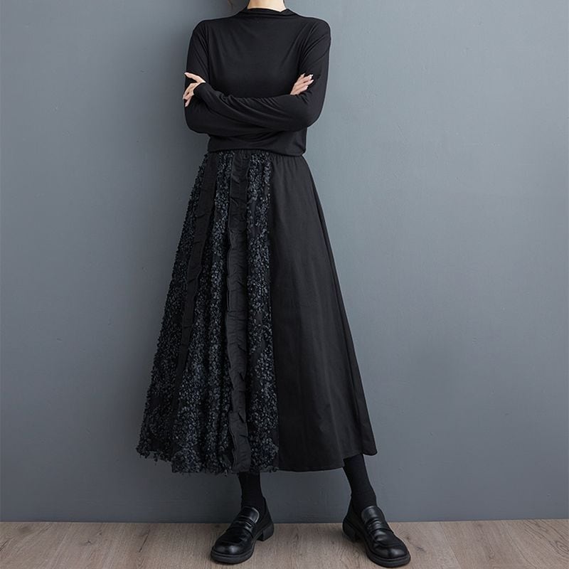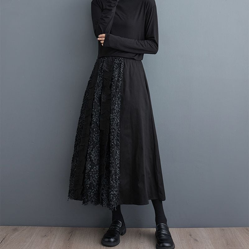 アシンメトリーな異素材使いが映えるブラックロングスカート。