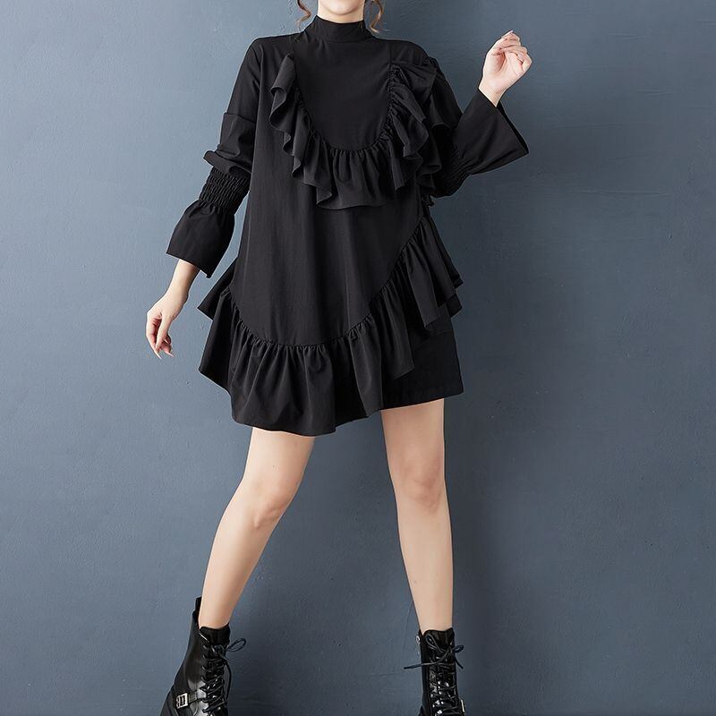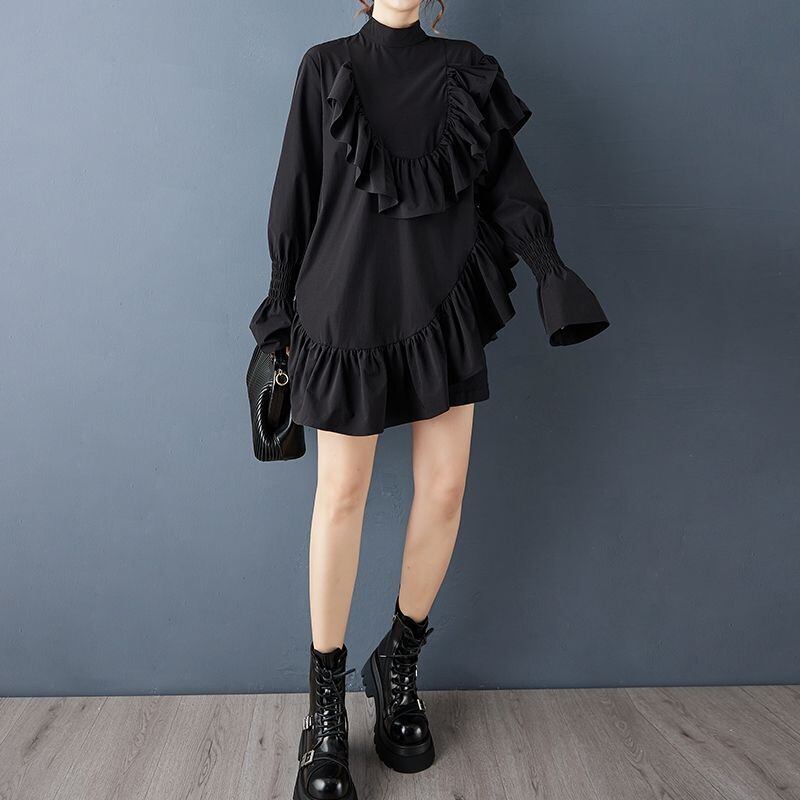 アシンメトリーに流れるフリルが印象的なブラックブラウス。