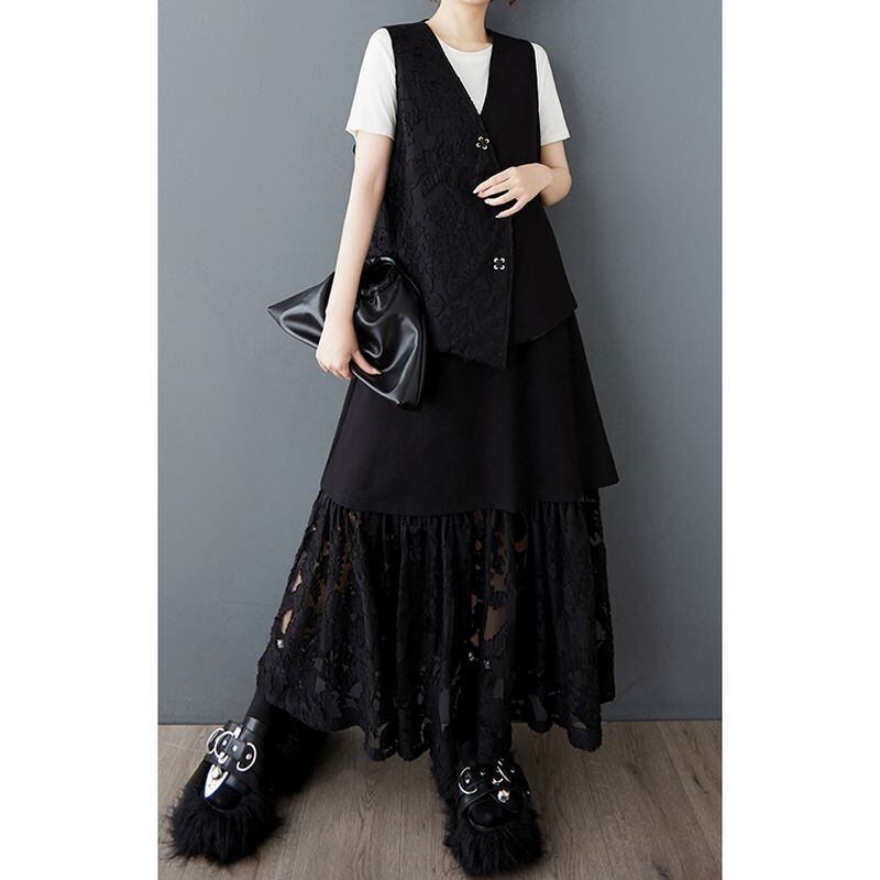 Vネックのノースリーブベストは、上品なレース使いがポイント。