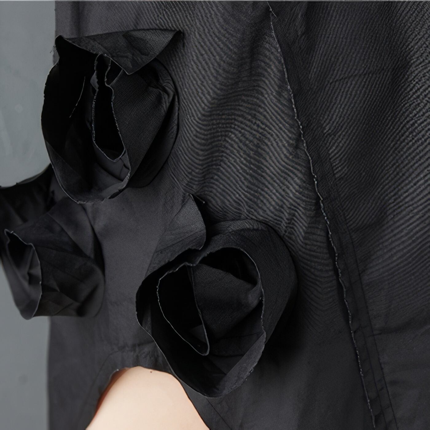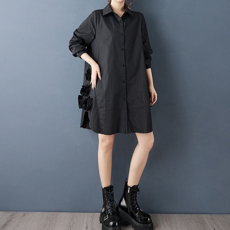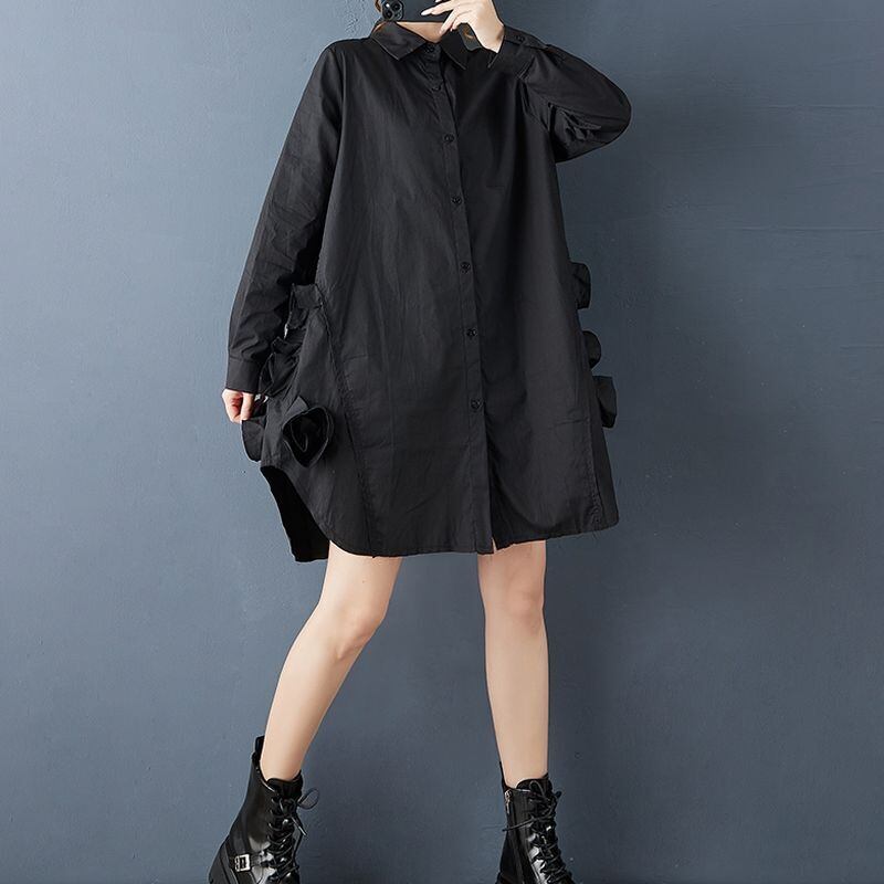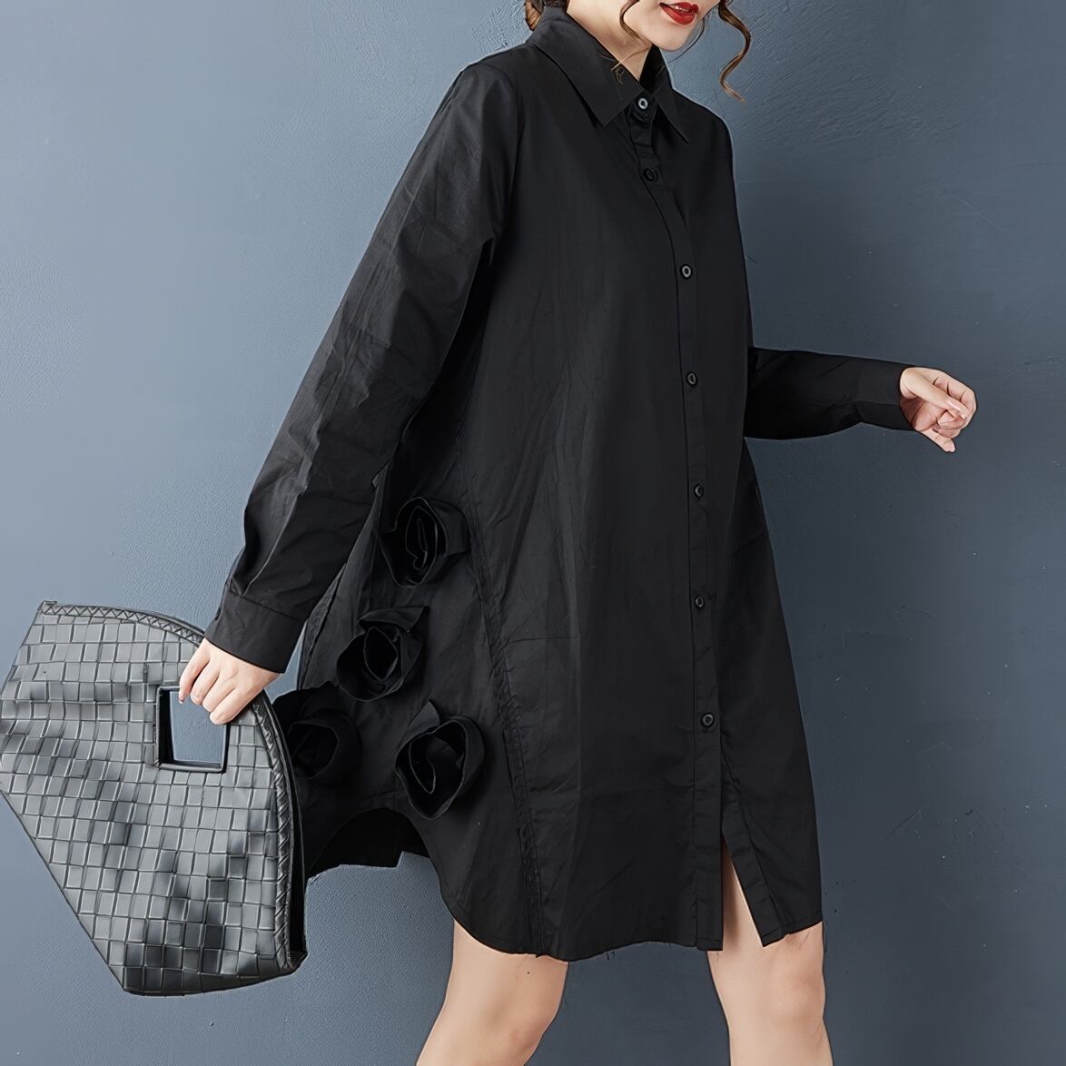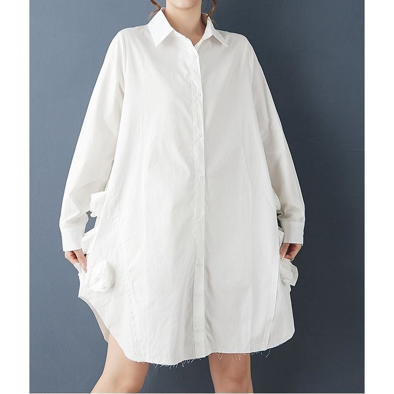 ゆったりオーバーサイズのシャツに、アシンメトリーな裾とサイドの立体装飾が個性をプラス。