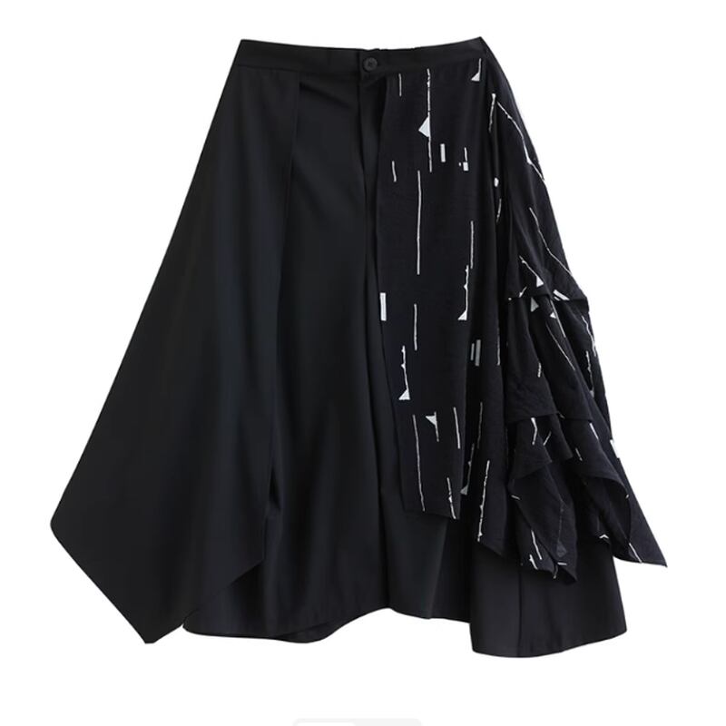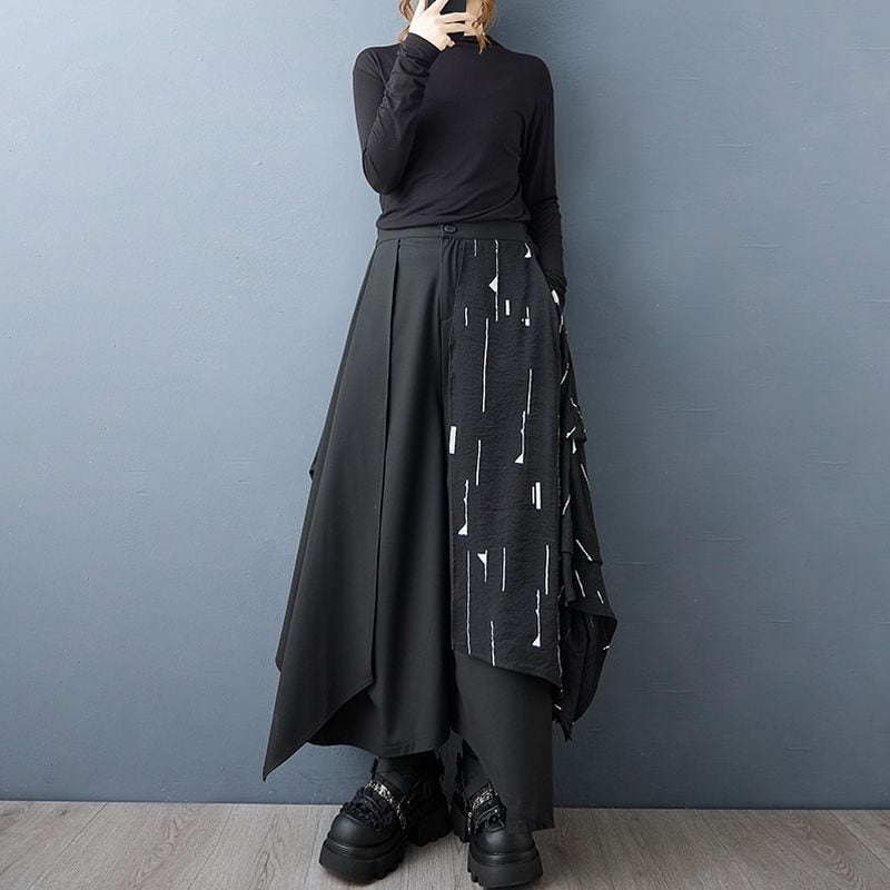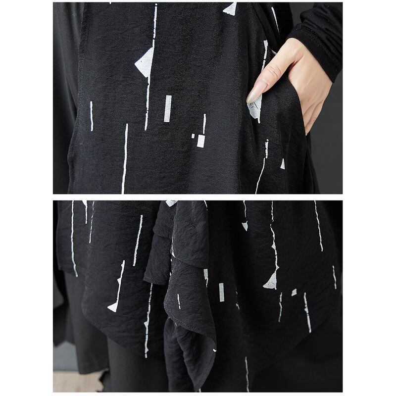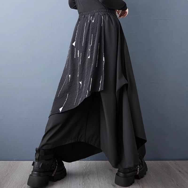 大胆なプリントと流れるドレープが、モードな存在感を際立たせます。
